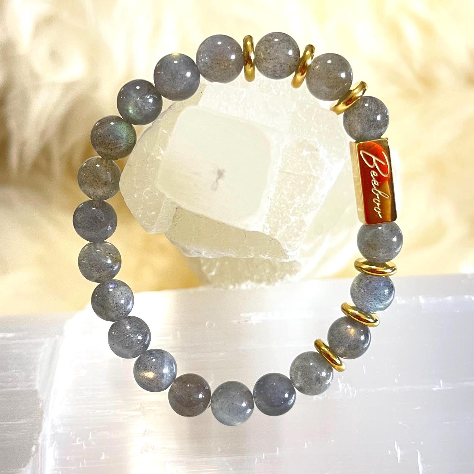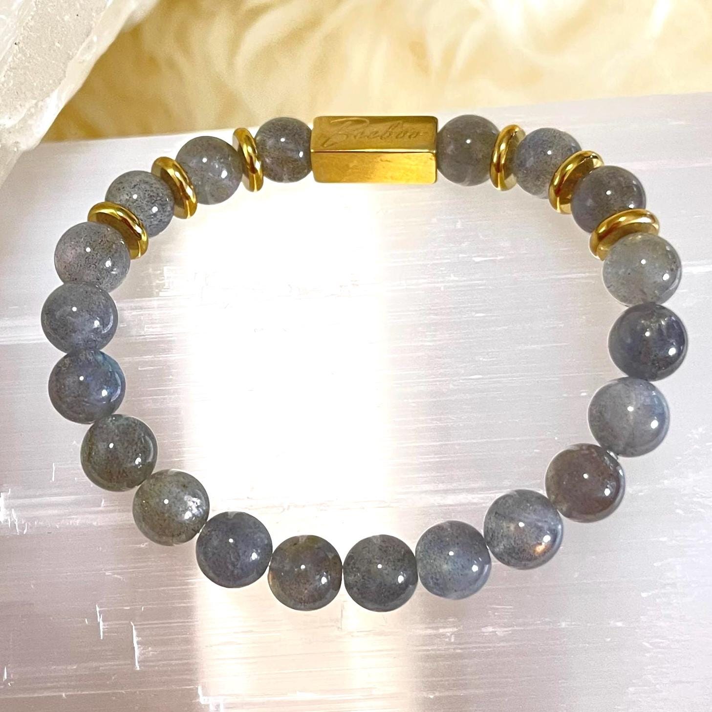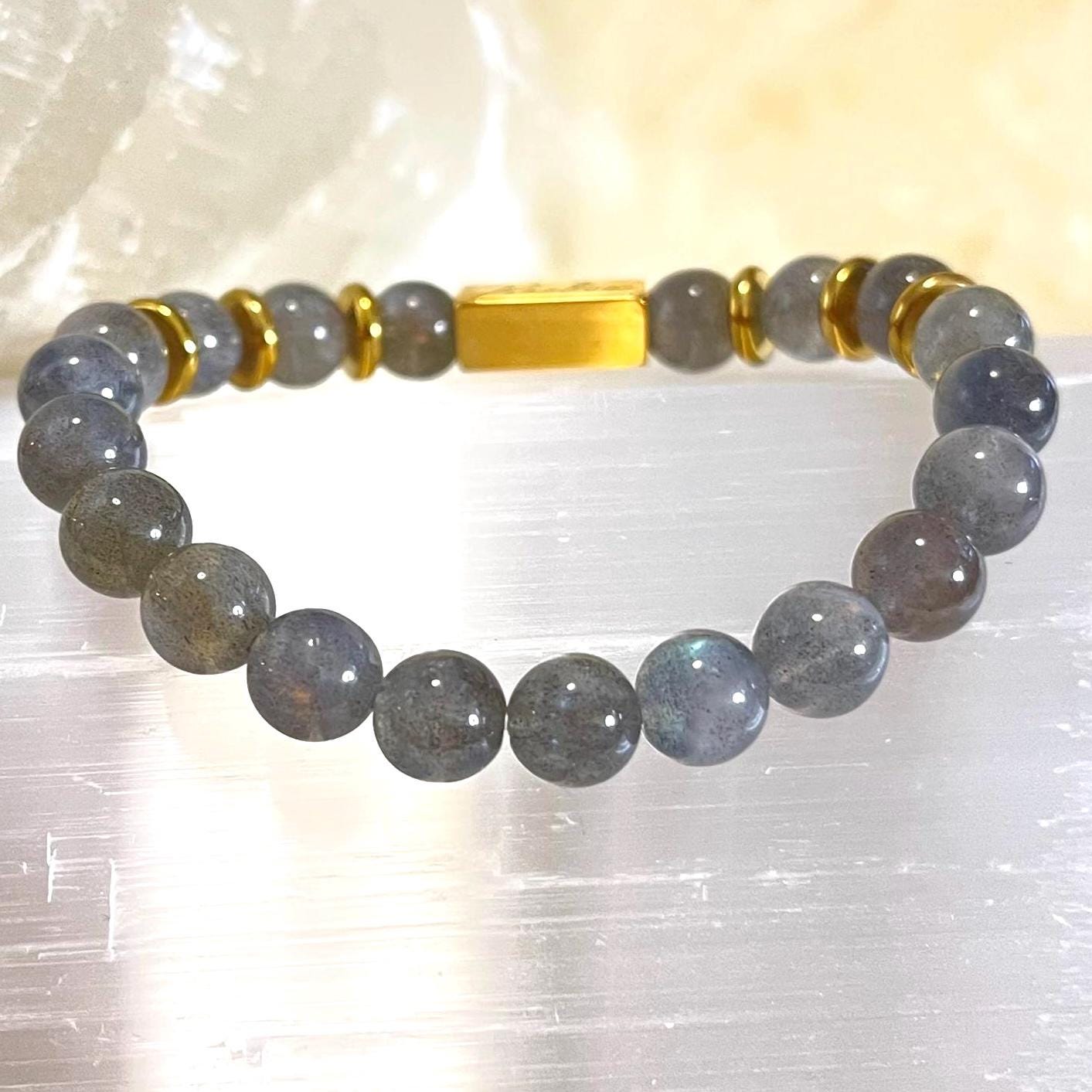 Add a touch of magic to your everyday style with this handcrafted 8mm Labradorite stretch bracelet, made with genuine natural labradorite beads, polished gold filled accents, and a durable elastic cord for a comfortable slip-on fit. Known for its captivating iridescence (often called labradorescence), labradorite flashes with shifting tones when it catches the light—making every bracelet feel unique, elevated, and effortlessly wearable.