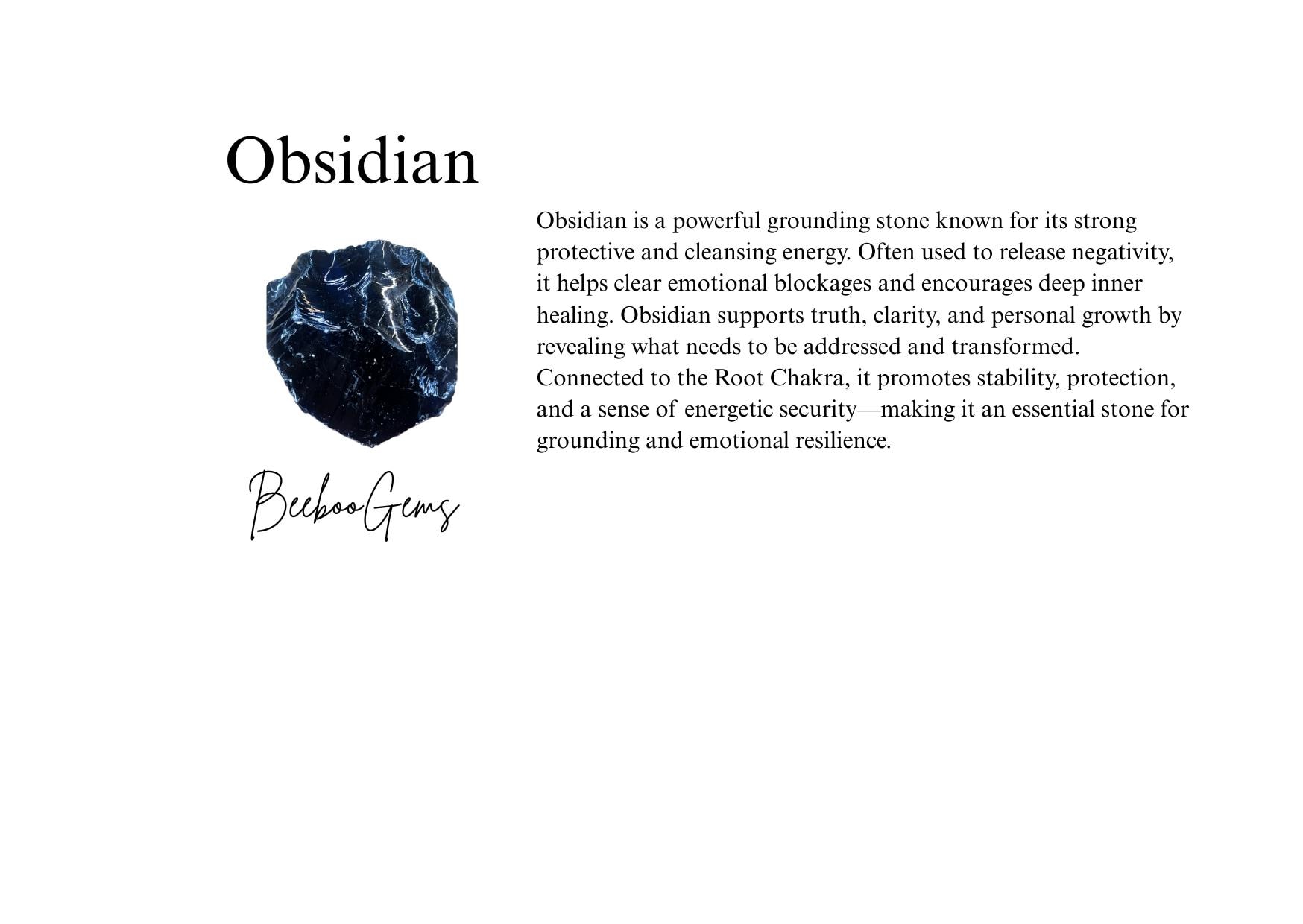 Obsidian is a powerful protective stone known for its grounding and transformative properties. Formed from volcanic lava, it carries strong Earth energy that helps shield against negativity and emotional blockages.
