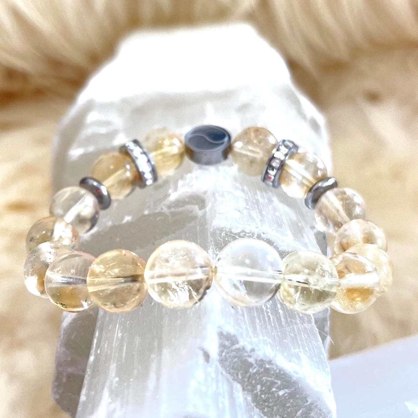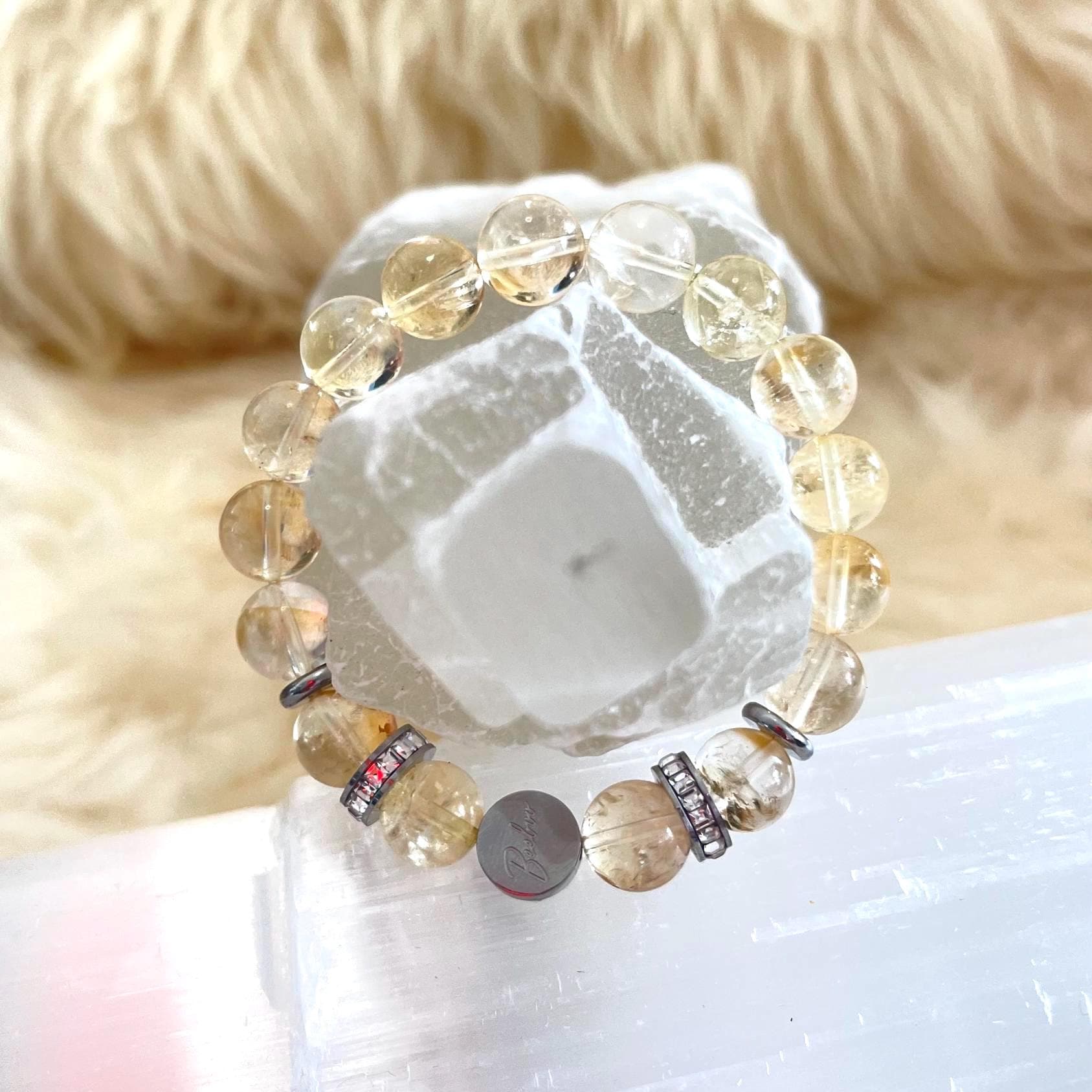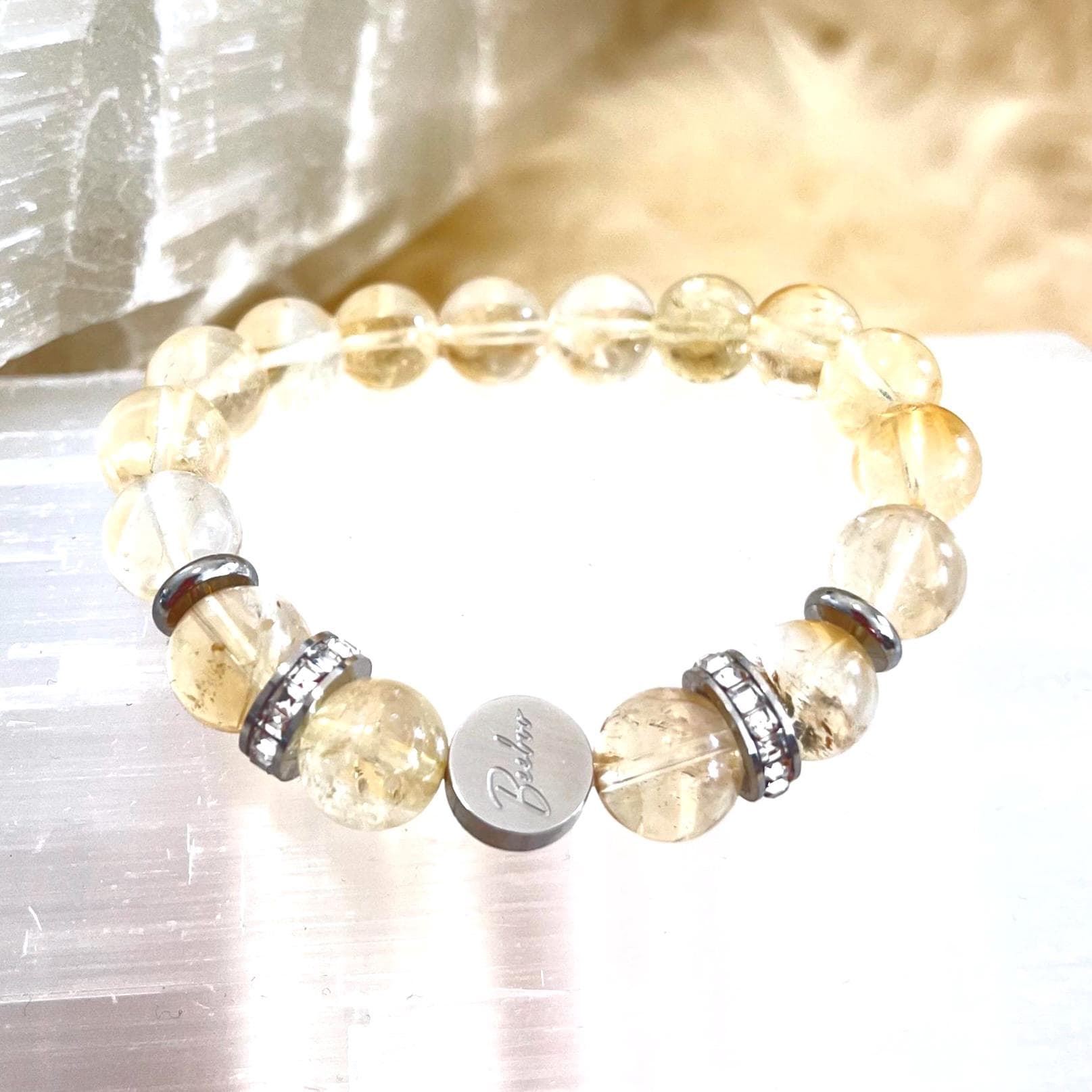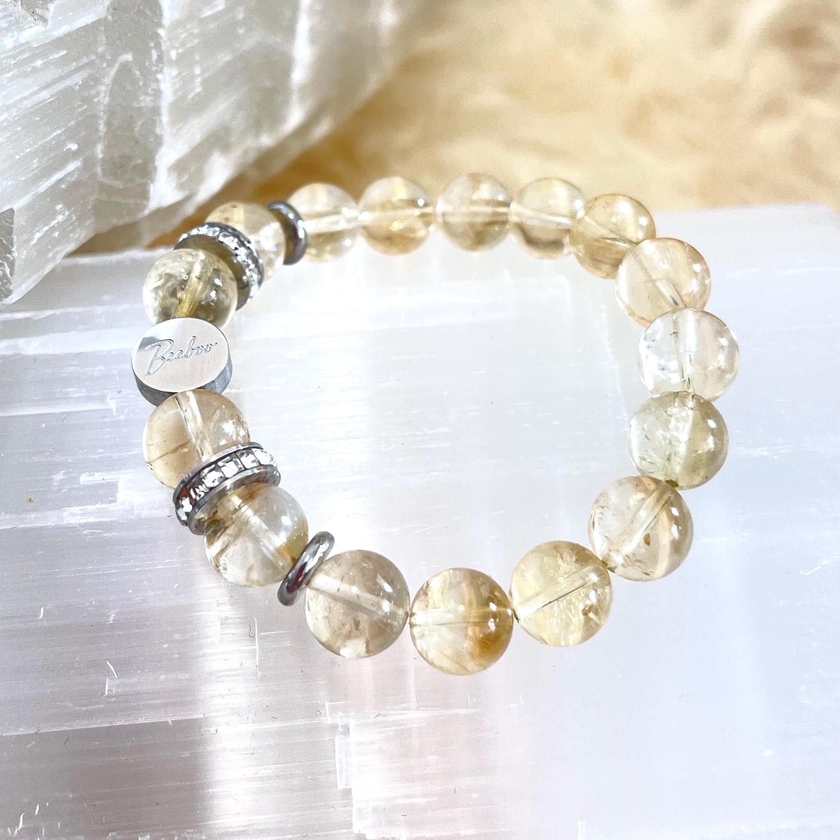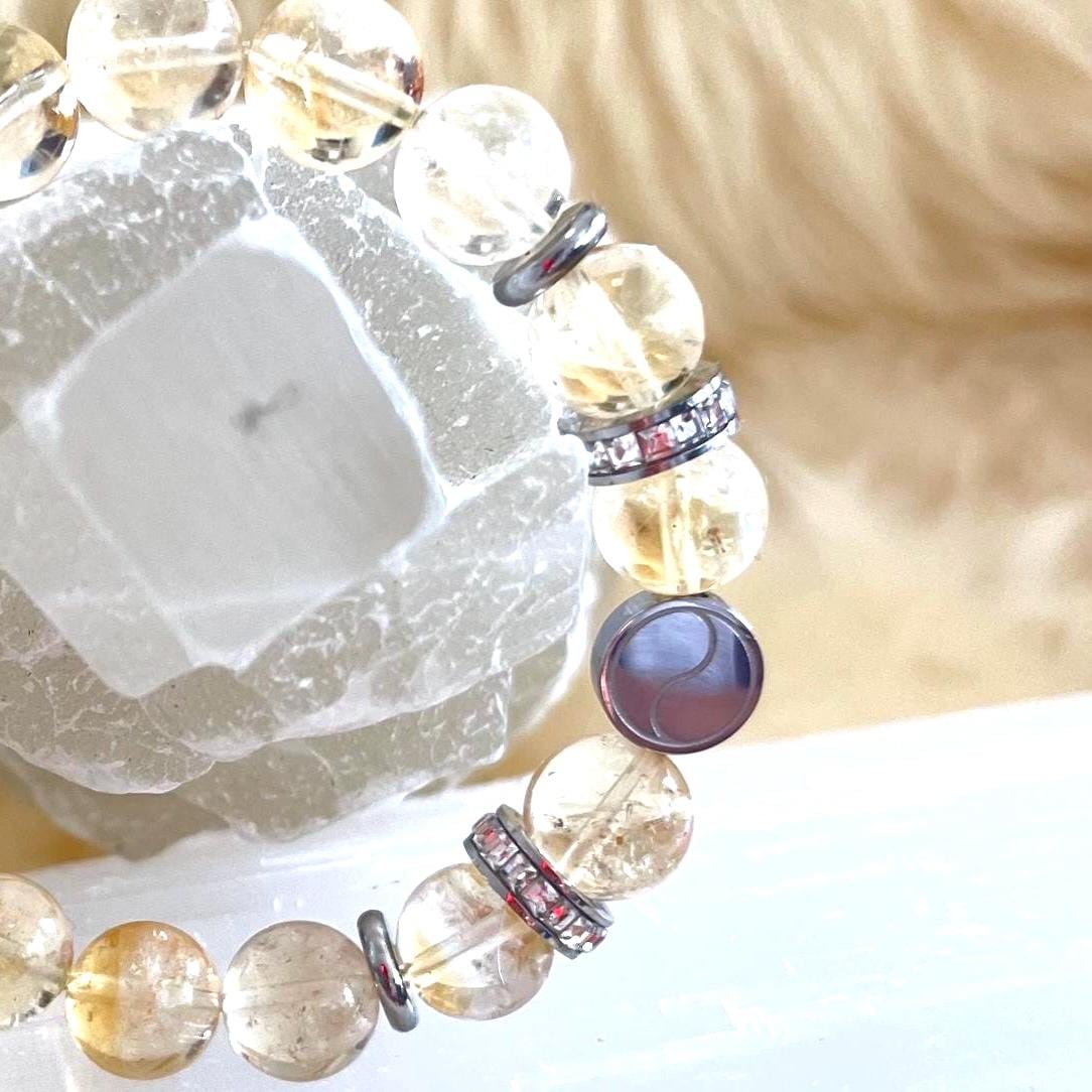 Each 10mm Natural Citrine bead is selected for its radiant color and natural beauty, creating a bracelet that feels both grounding and luminous. The addition of rhinestone accents introduces a subtle sparkle, symbolizing light, clarity, and the amplification of intention. These details elevate the bracelet from a simple crystal accessory to a refined piece of luxury crystal jewelry.