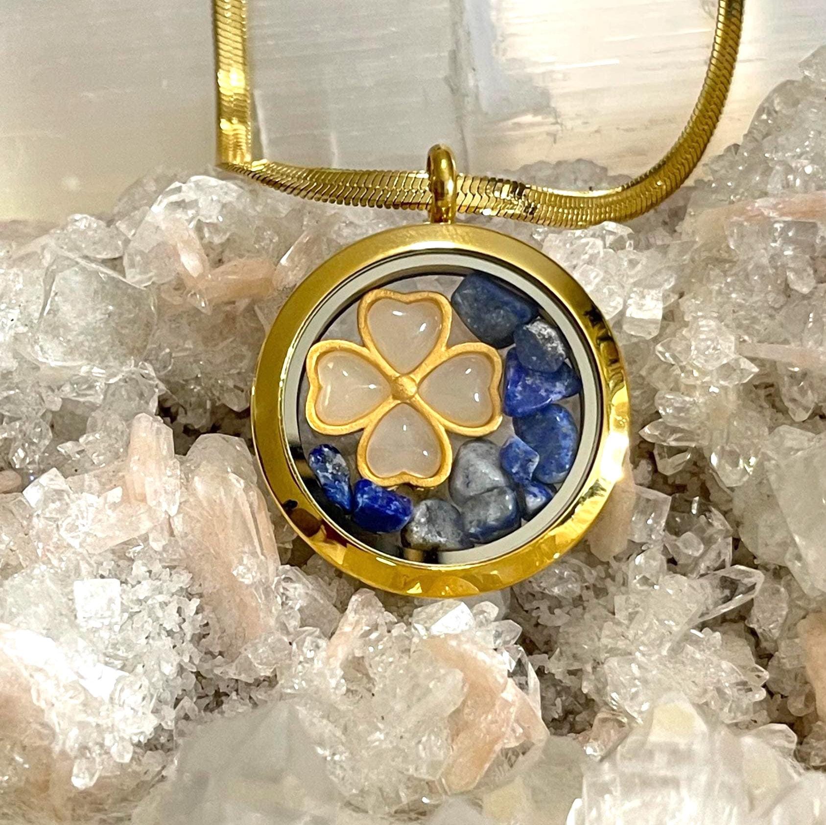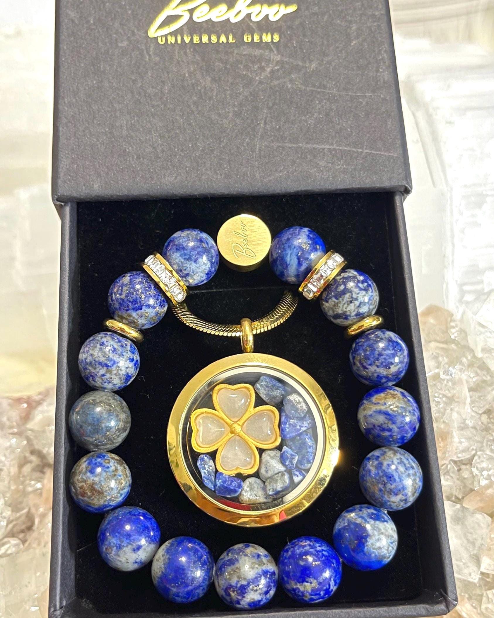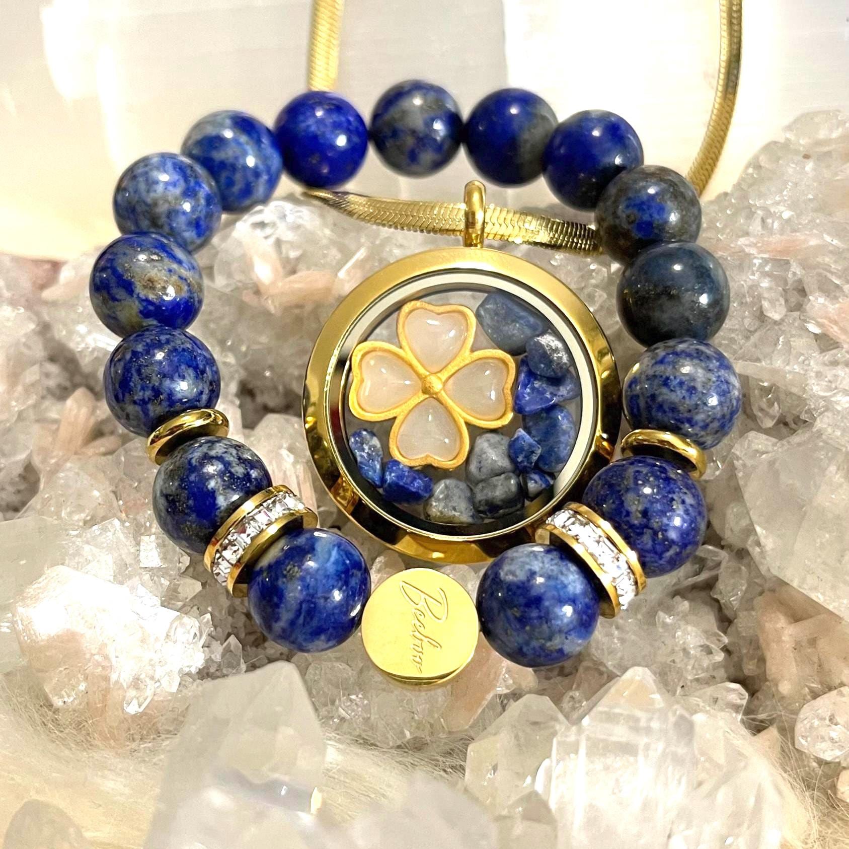 Bracelet: 10mm Lapis Lazuli stone Necklace (Pendant): 30mm Cat’s eye Clover and Lapis Lazuli stone