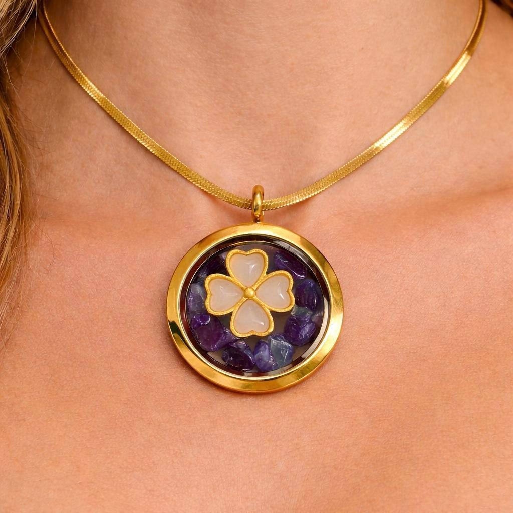 Necklace (Pendant) : 30mm Cat’s Eye Clover and Amethyst Stones