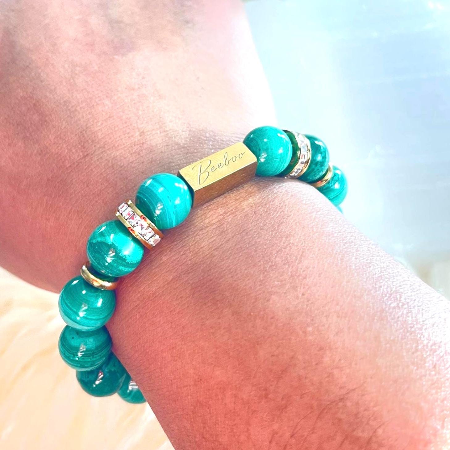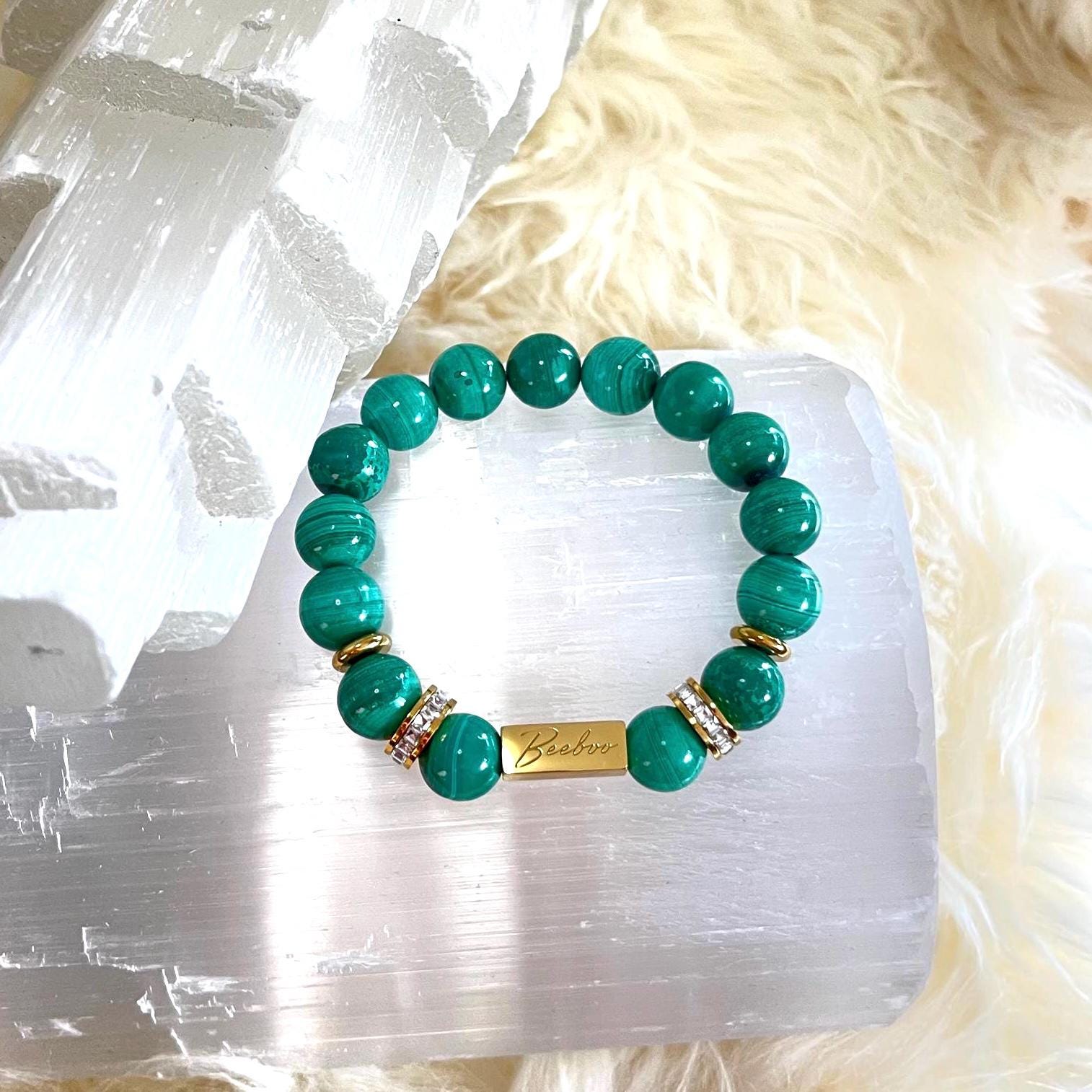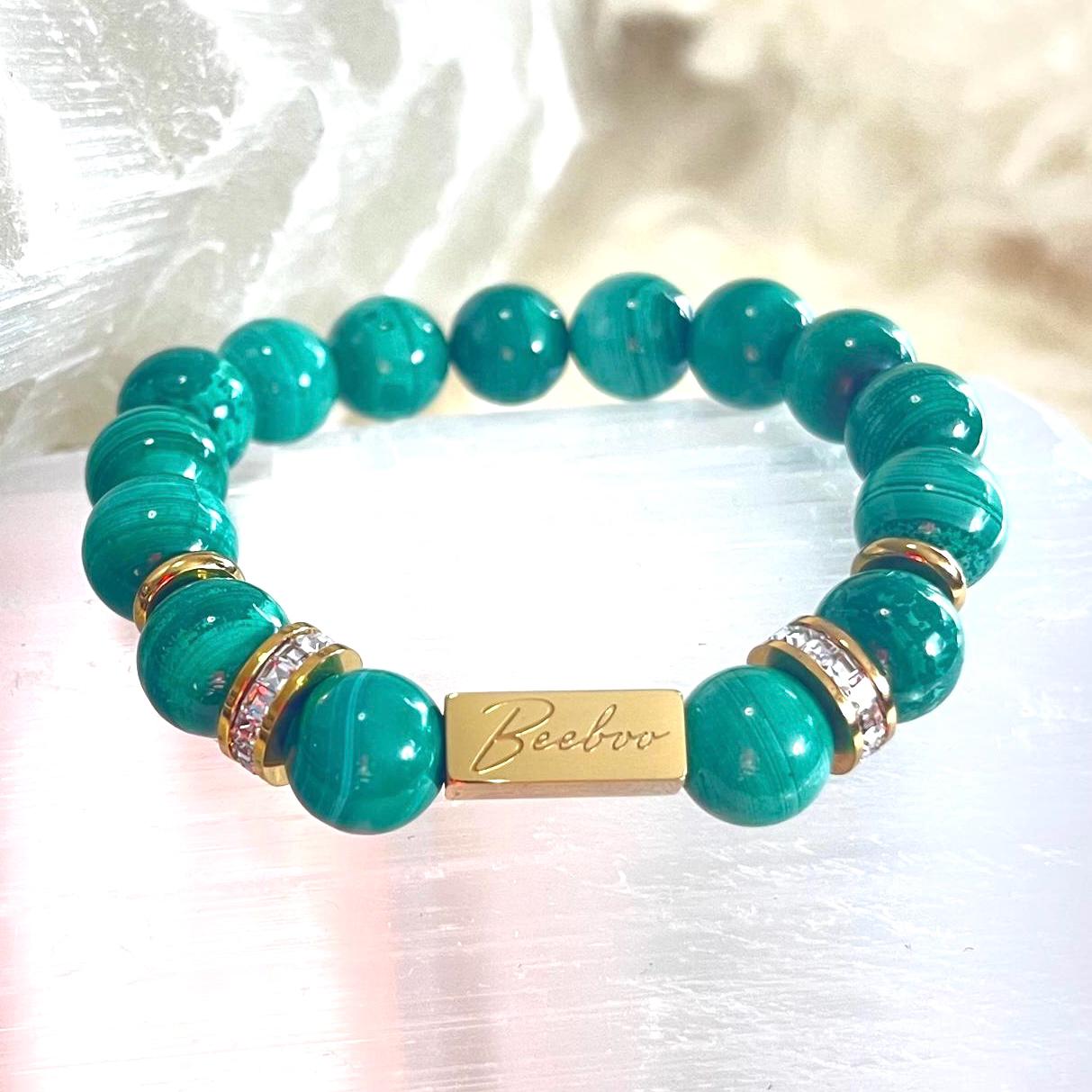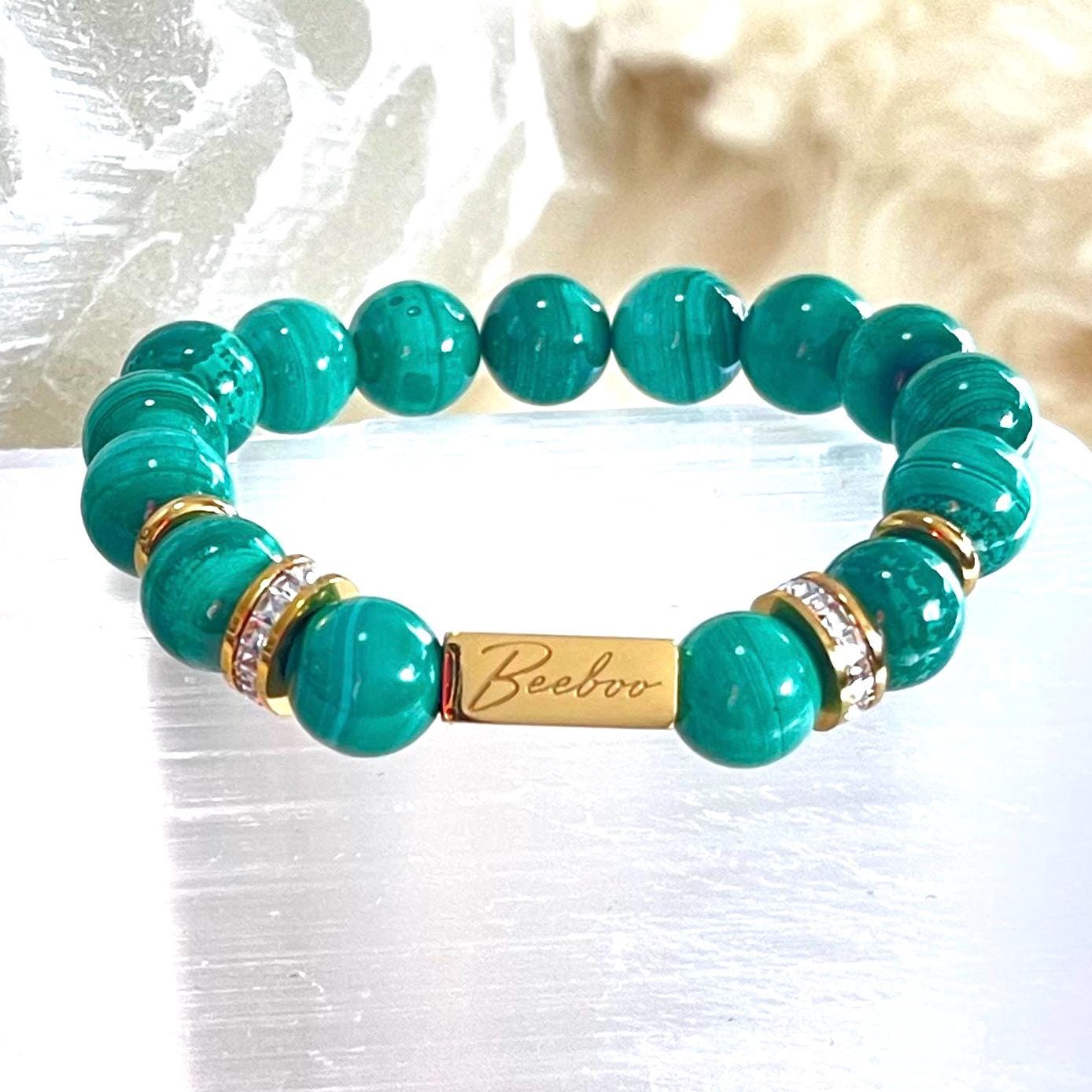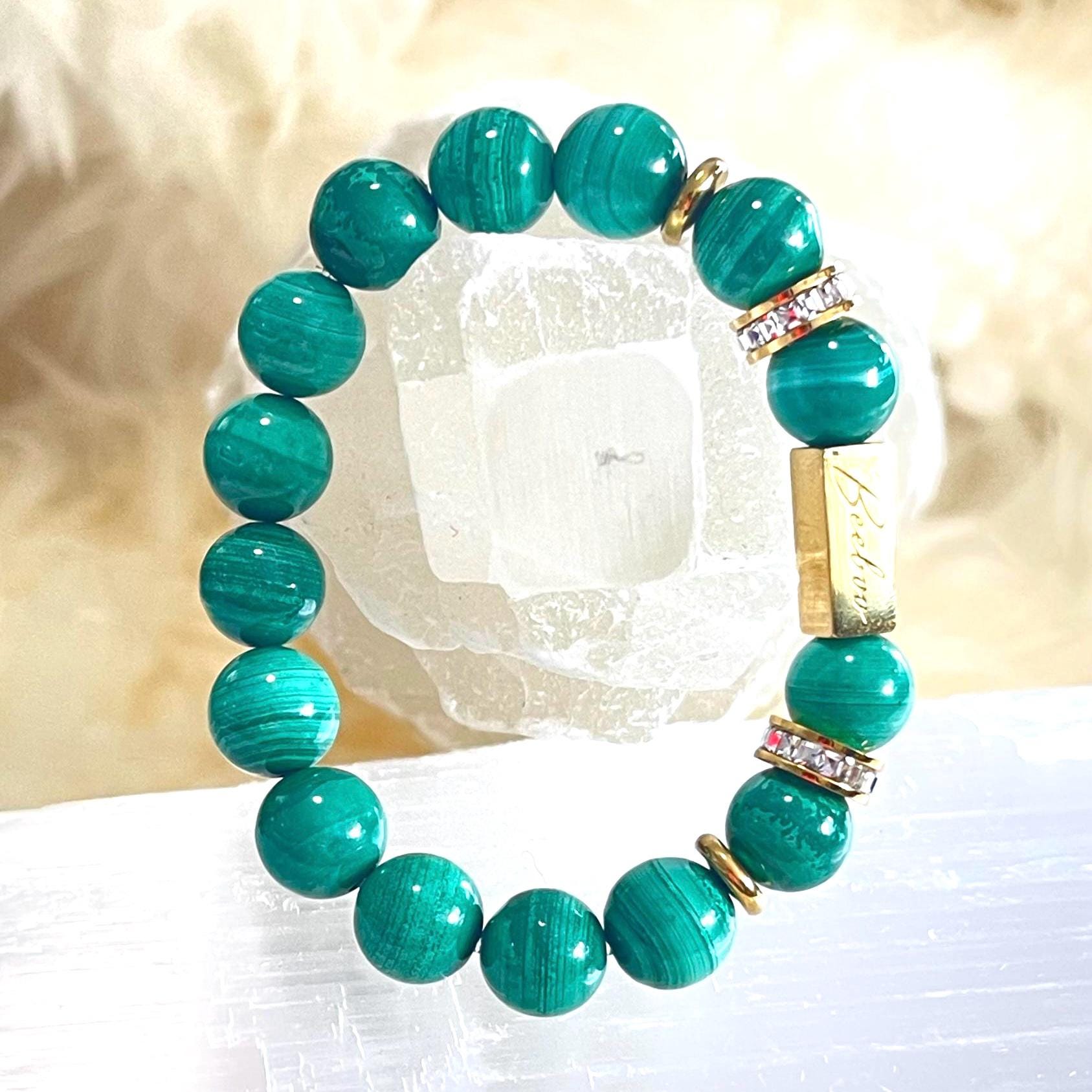 Make a bold yet refined statement with this Natural Malachite bracelet, crafted from genuine 10mm Malachite gemstone beads, accented with luminous gold filled details and a refined rhinestone centerpiece. Designed on a premium elastic cord, this bracelet blends striking beauty with deep spiritual symbolism—created for those drawn to strength, transformation, and intentional luxury.