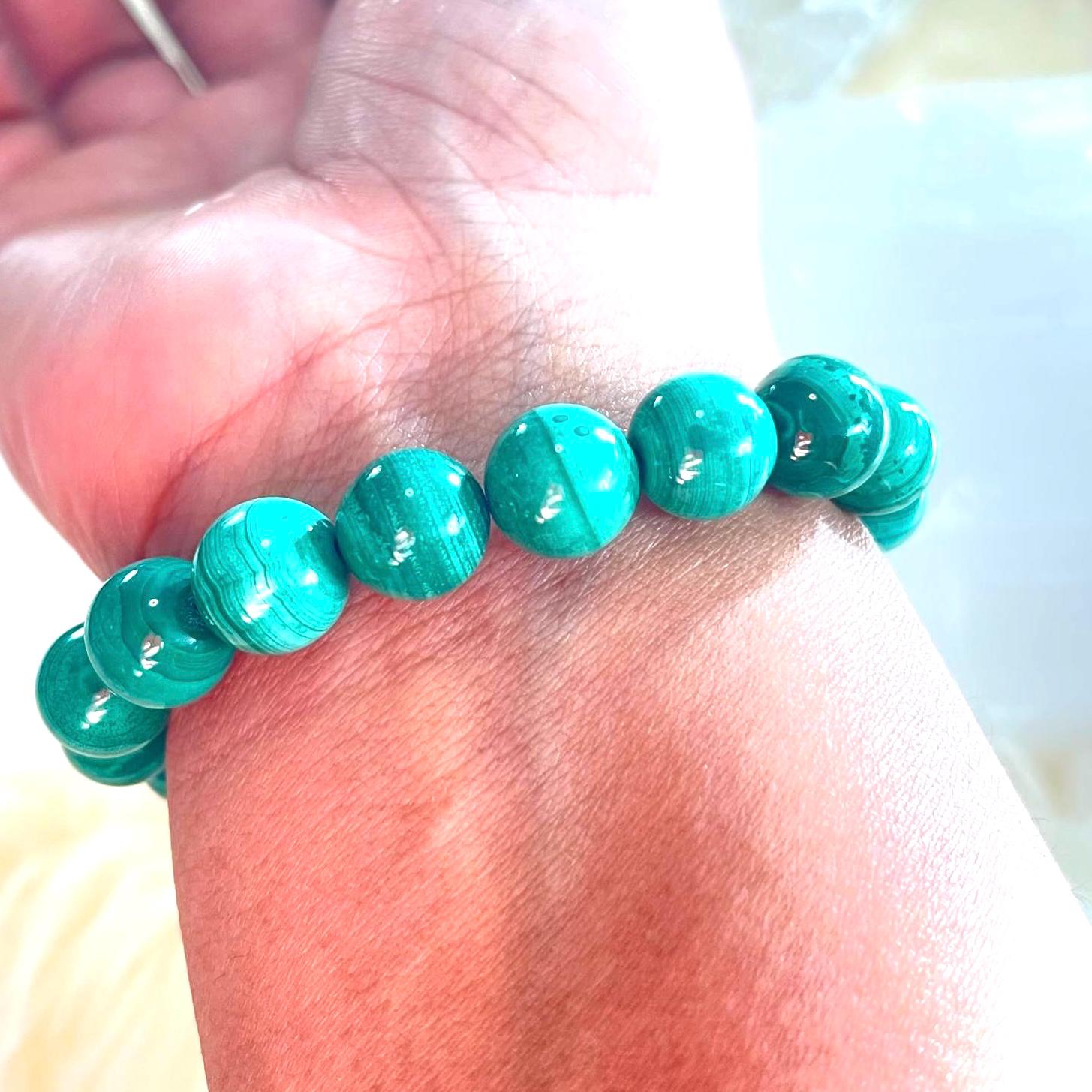 Each 10mm Natural Malachite bead is carefully selected for its vibrant green tones and distinctive natural banding, ensuring every bracelet is visually striking and truly one of a kind. The addition of a sparkling rhinestone accent symbolizes clarity and energetic amplification, enhancing Malachite’s transformative properties while adding a touch of refined brilliance.
