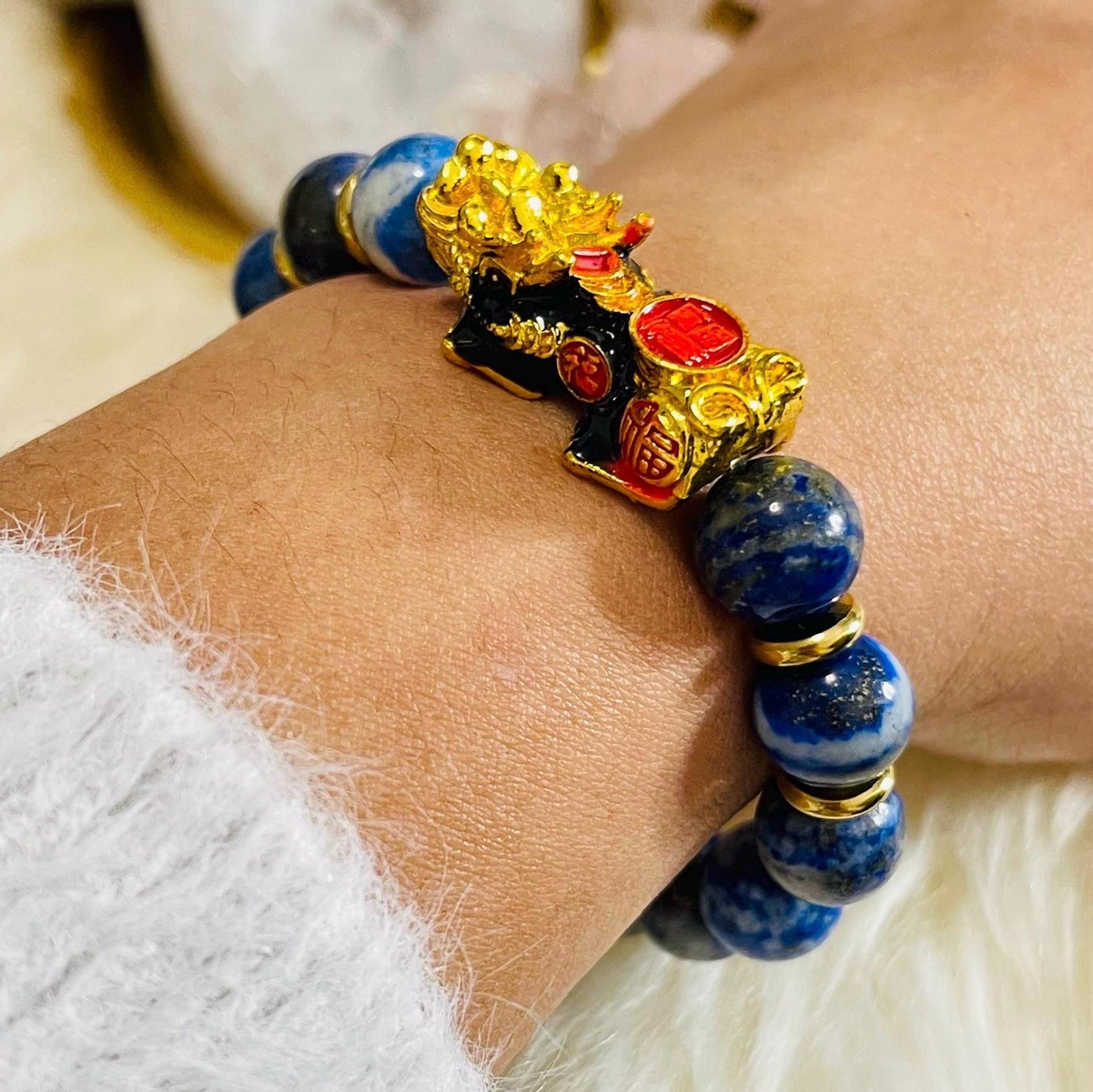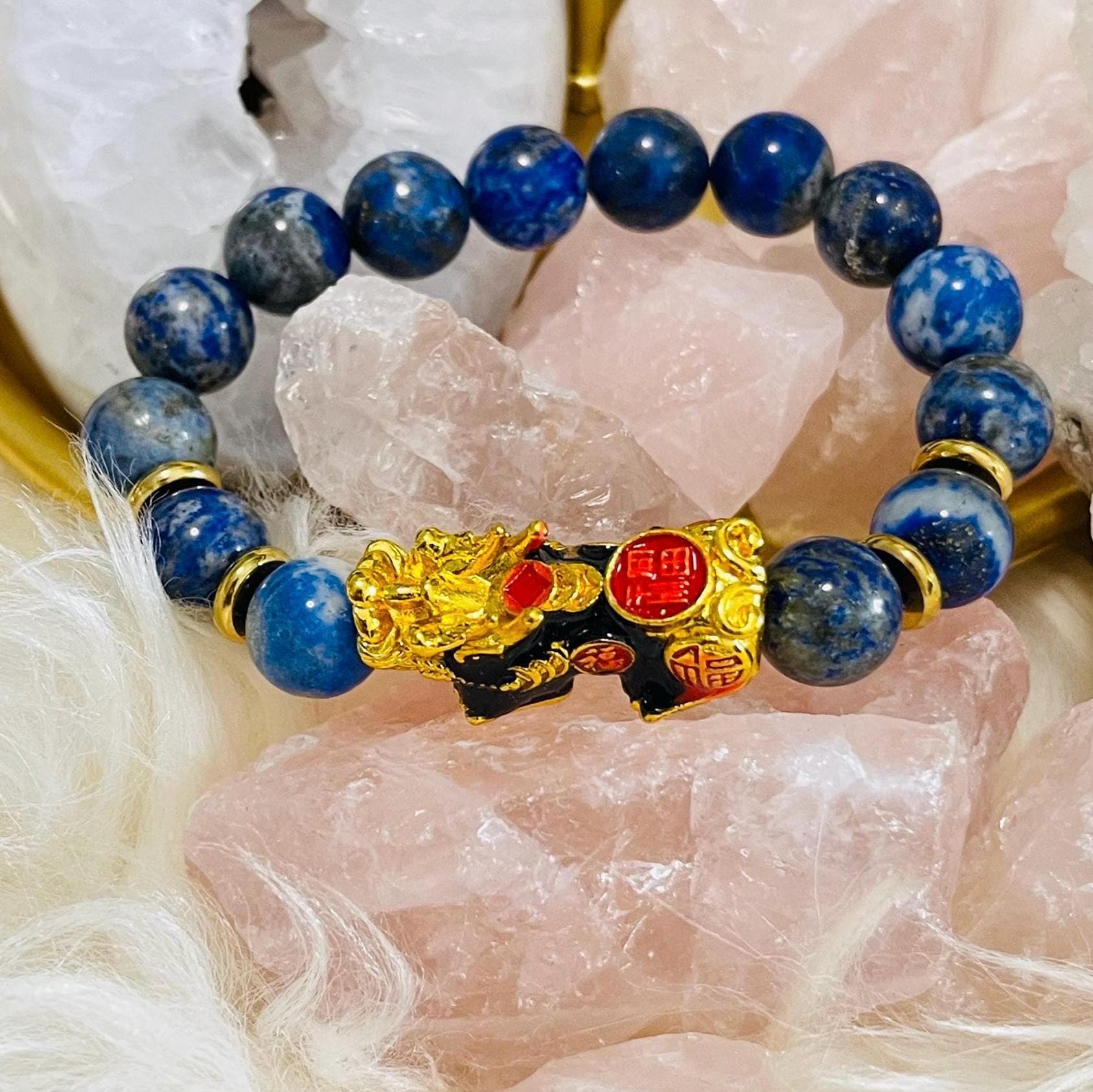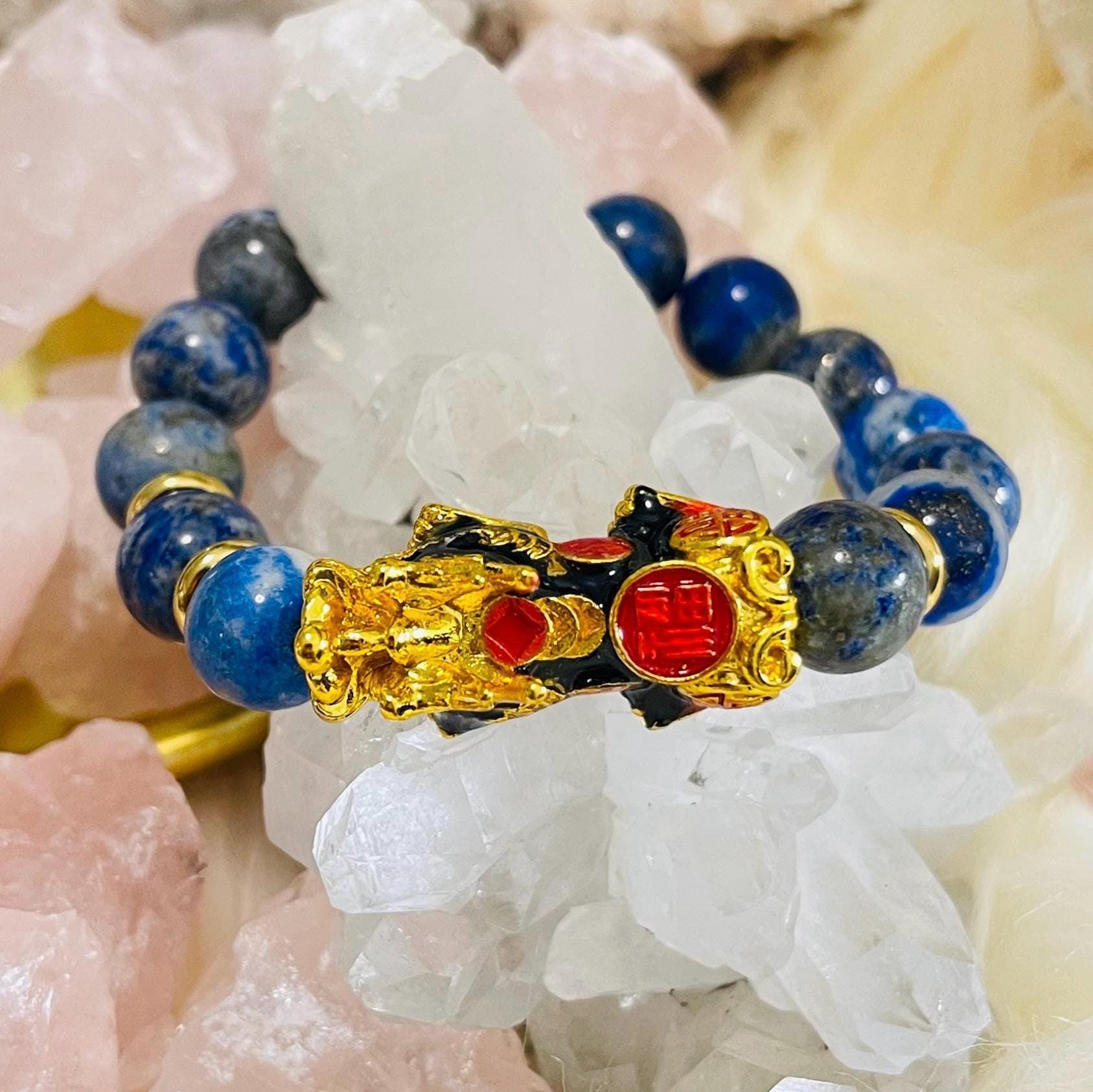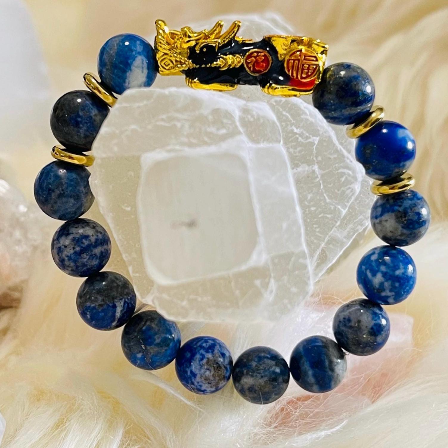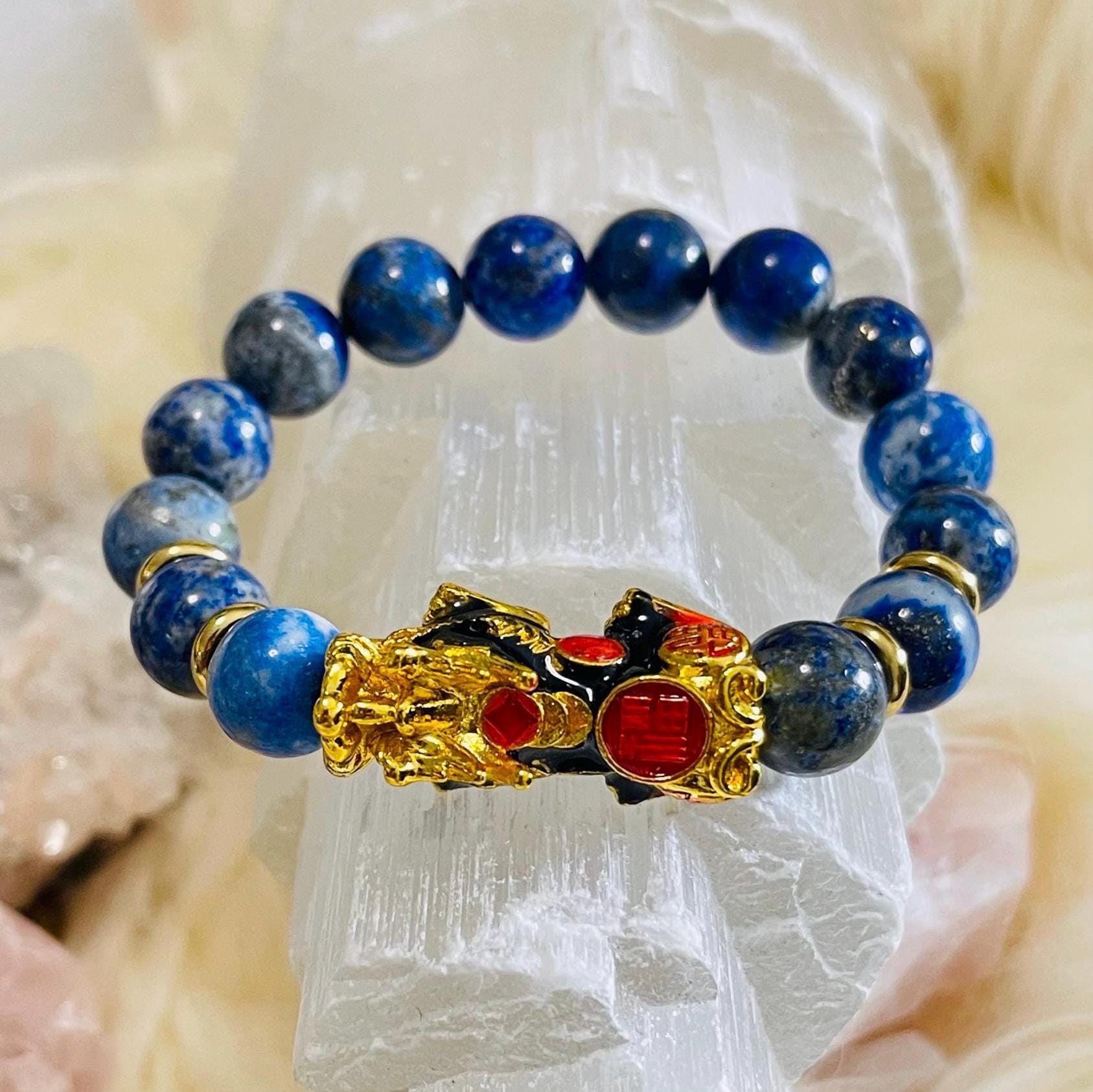Elevate your energy with a Lapis Lazuli bracelet with Dragon Pixiu, a striking piece of feng shui wealth jewelry that blends protection, prosperity, and powerful self-expression. Lapis Lazuli is prized as a stone of wisdom, truth, and inner power, long associated with royalty and spiritual insight. Wearing a Lapis Lazuli crystal bracelet is believed to support mental clarity, deep intuition, confidence, and honest communication, making it ideal for leaders, creators, and anyone seeking focused direction. Many also value Lapis for helping ease overwhelm, encouraging calm thinking, and strengthening personal boundaries.