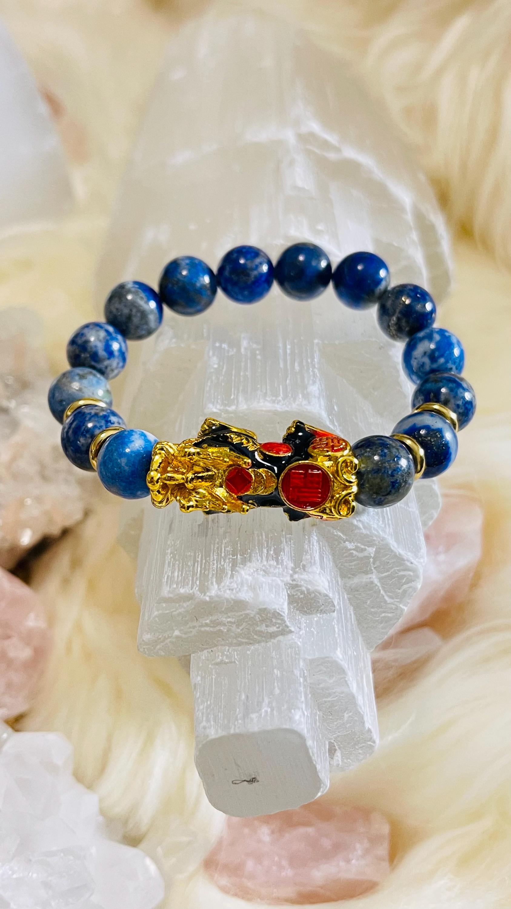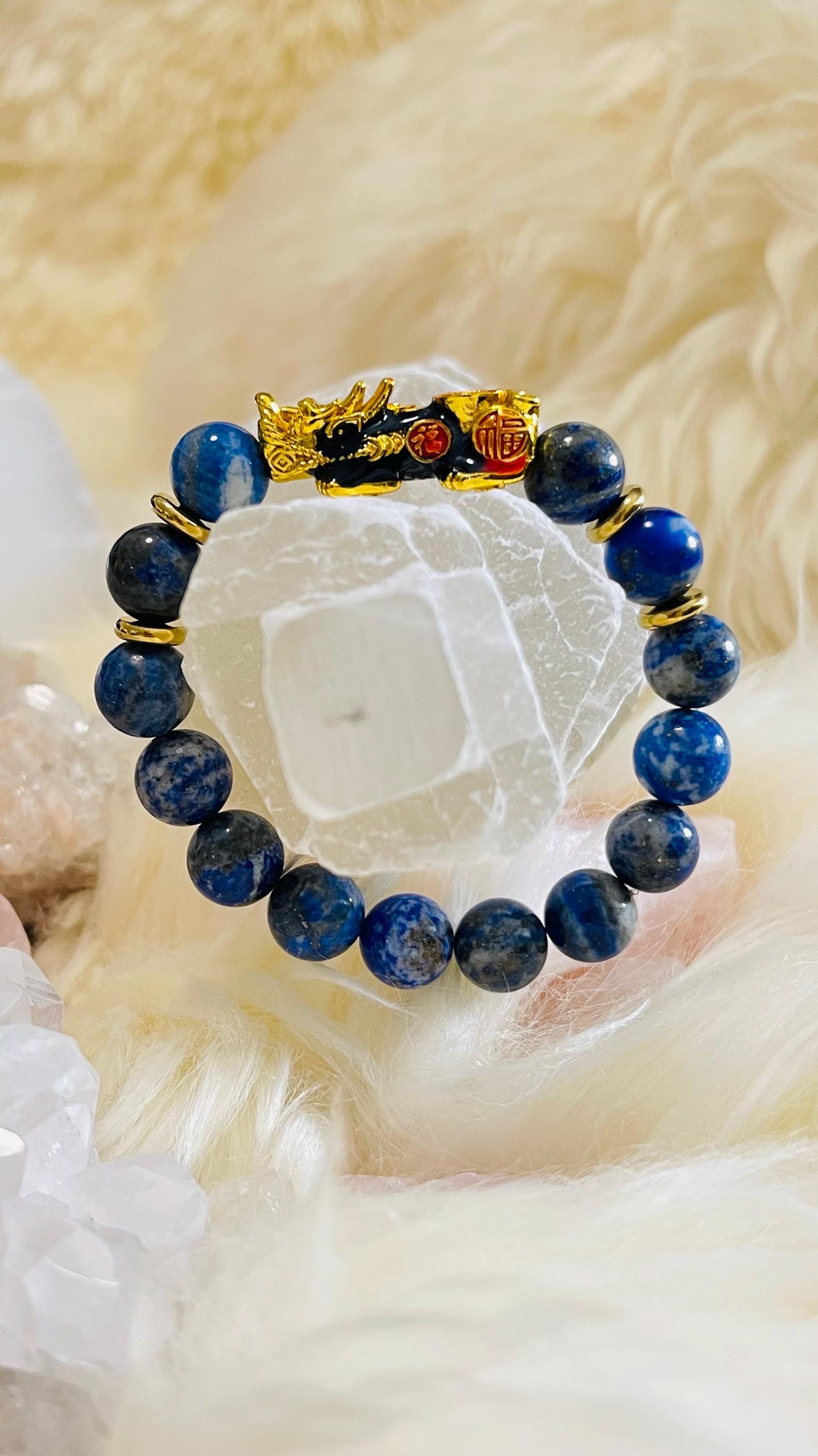 Elevate your energy with a Lapis Lazuli bracelet with Dragon Pixiu, a striking piece of feng shui wealth jewelry that blends protection, prosperity, and powerful self-expression. Lapis Lazuli is prized as a stone of wisdom, truth, and inner power, long associated with royalty and spiritual insight. Wearing a Lapis Lazuli crystal bracelet is believed to support mental clarity, deep intuition, confidence, and honest communication, making it ideal for leaders, creators, and anyone seeking focused direction. Many also value Lapis for helping ease overwhelm, encouraging calm thinking, and strengthening personal boundaries.