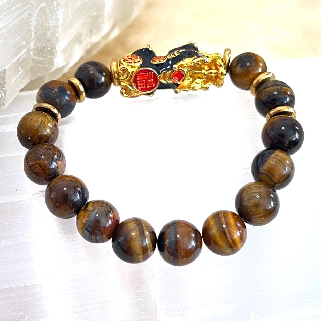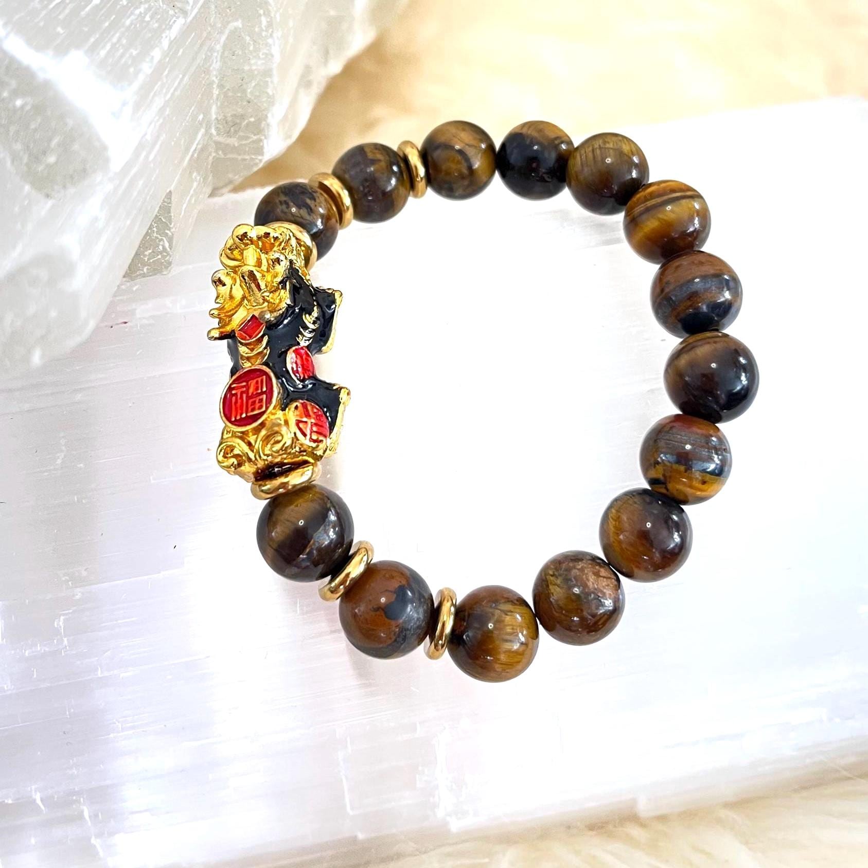 Bold, grounding, and unmistakably powerful, this Tiger’s Eye Pixiu Feng Shui Bracelet embodies the union of ancient strength and refined luxury. Handcrafted with 10mm natural Tiger’s Eye gemstone beads and centered with a striking gold-plated Pixiu charm, this unisex bracelet is designed to enhance confidence, protection, focus, and prosperity while maintaining a sophisticated, masculine-meets-elegant aesthetic.