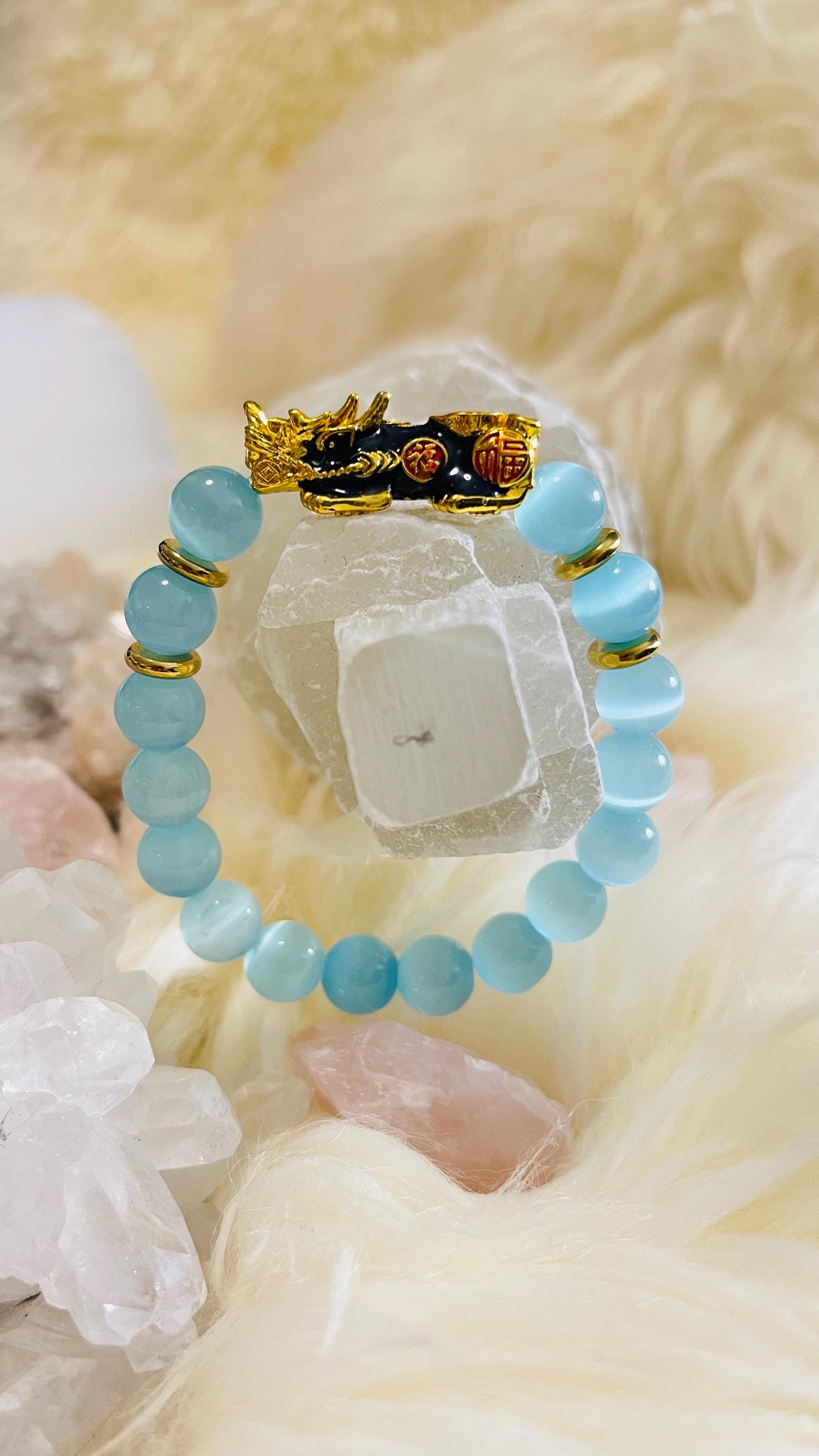 Bring calm focus and protective luck into your day with a Blue Cat’s Eye bracelet with Dragon Pixiu, a stylish piece of feng shui wealth jewelry known for its mysterious “chatoyancy” glow. Blue Cat’s Eye is often associated with intuition, protection, and mental clarity, believed to help sharpen awareness and keep you steady during stress. Wearing a Blue Cat’s Eye crystal bracelet (often made from cat’s eye stone or cat’s eye glass) is said to support confidence, clear thinking, and emotional balance, making it a popular choice for students, professionals, and anyone who wants a calmer, more focused mindset. Many also wear it as a charm to ward off negativity and strengthen personal boundaries.