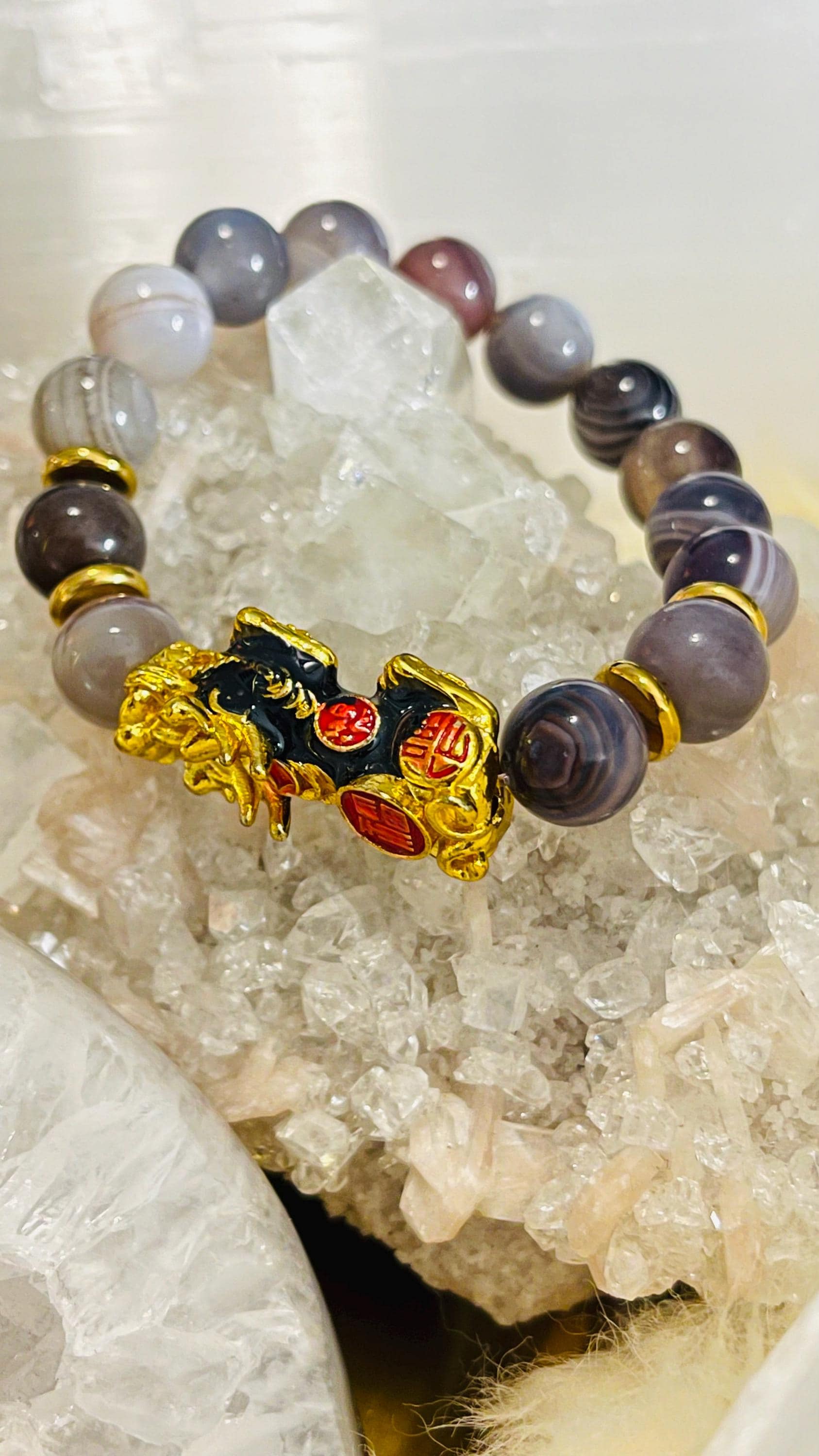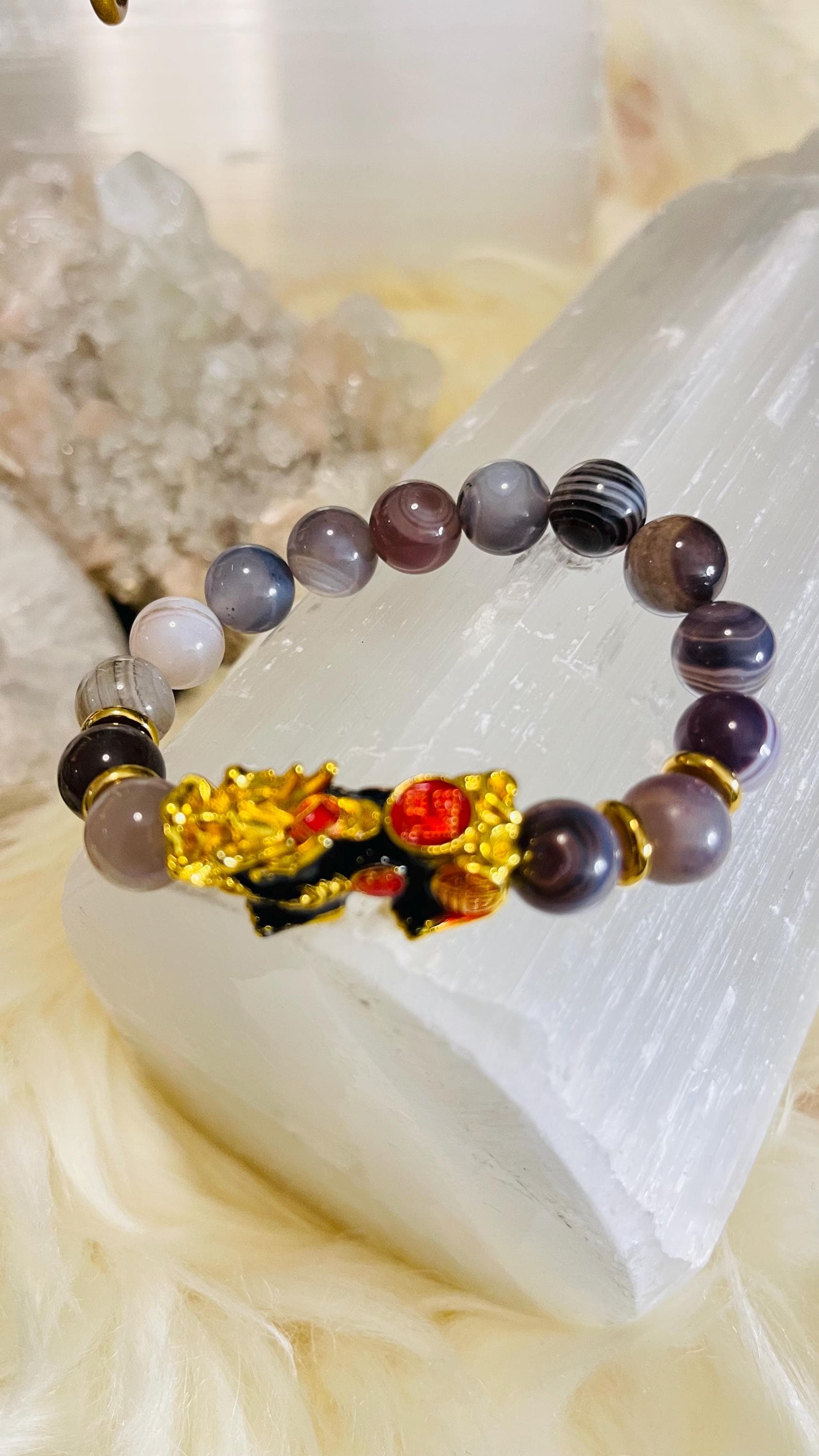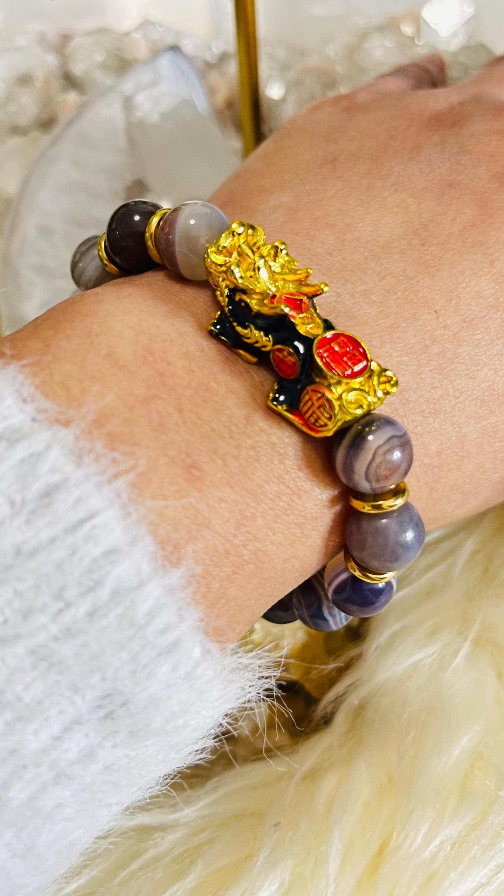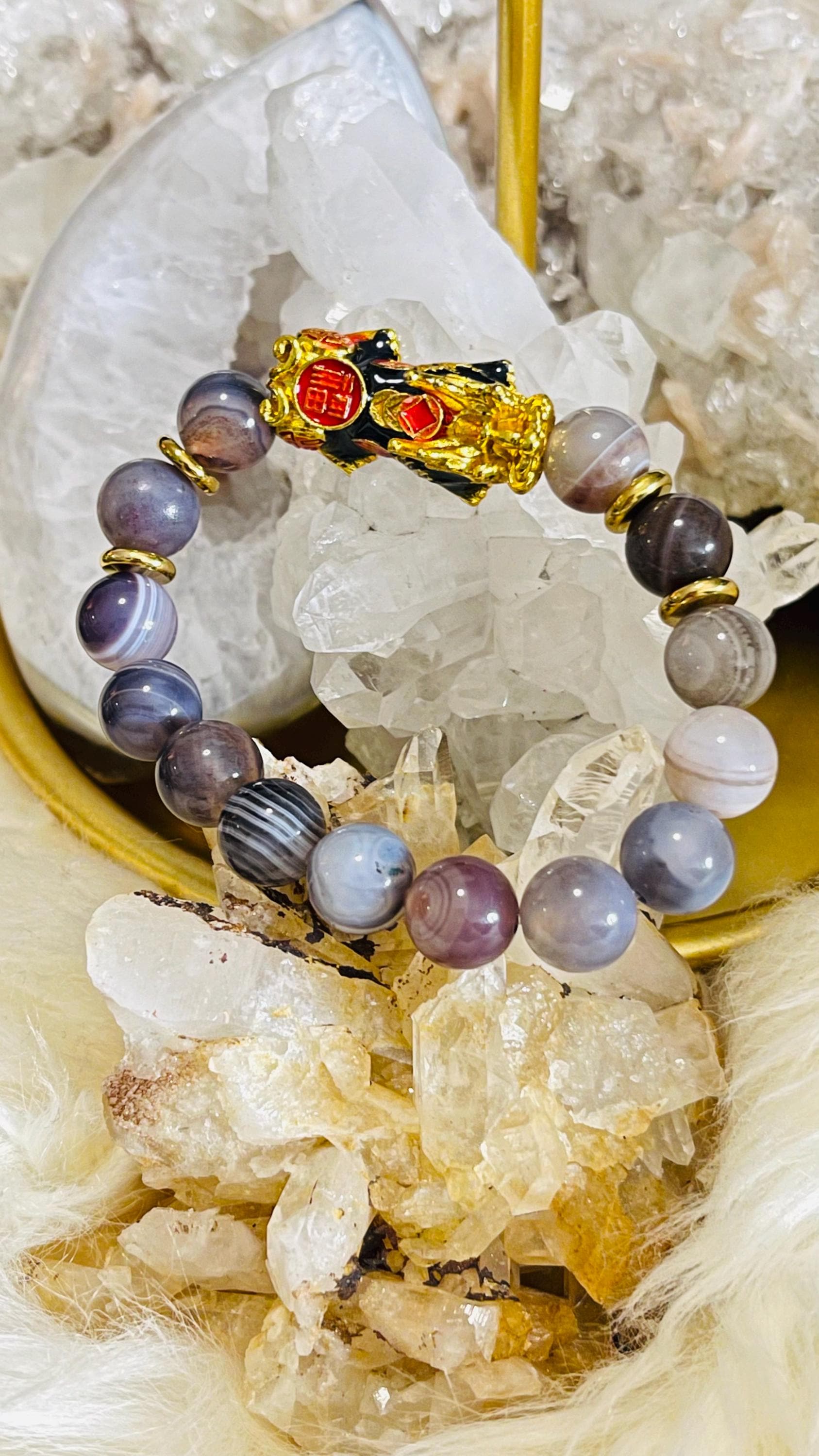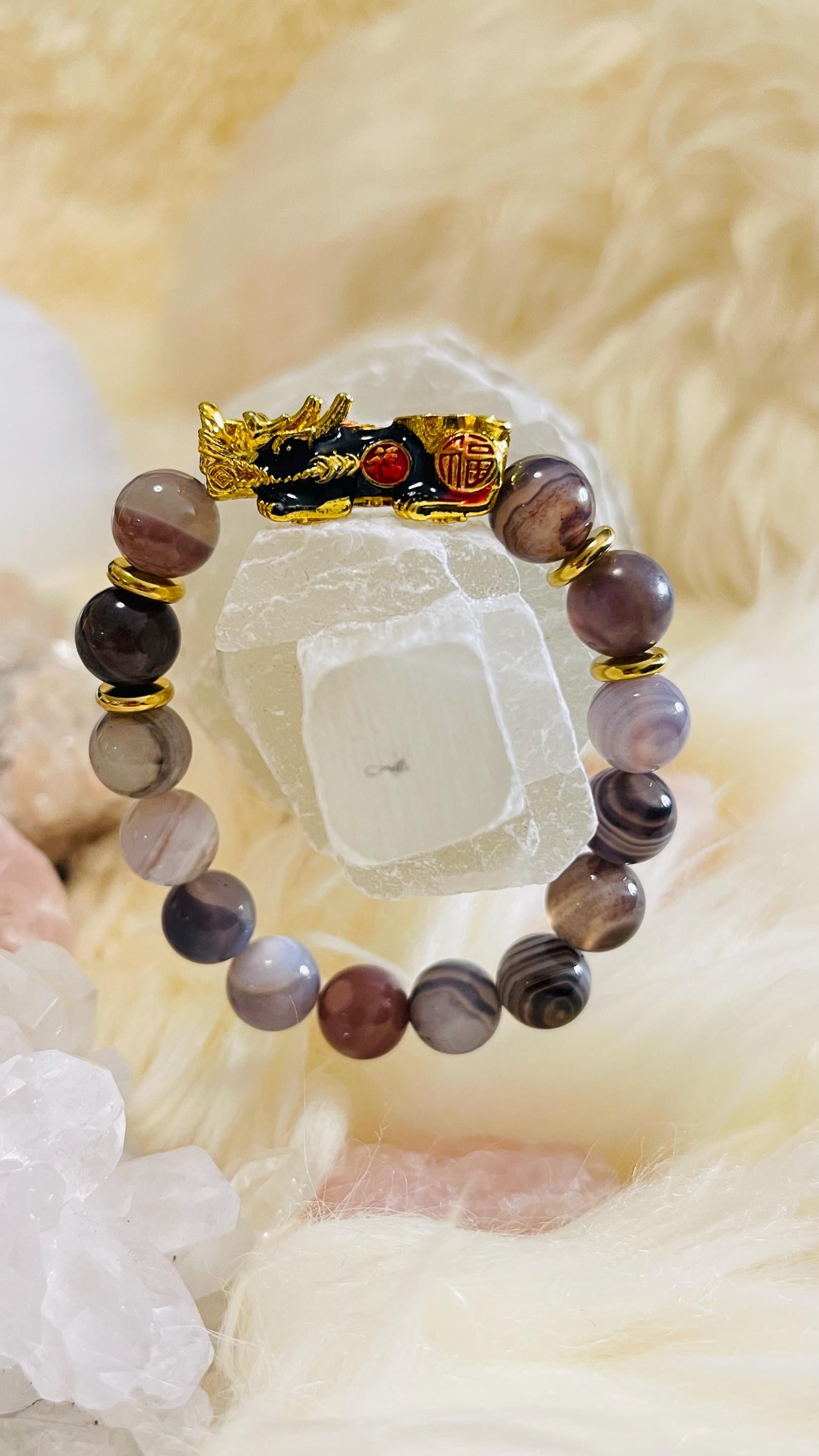 Attract steady strength and protective luck with a Botswana Agate bracelet with Dragon Pixiu, a meaningful piece of feng shui wealth jewelry designed for balance, confidence, and prosperity. Botswana Agate is cherished for its soft banding and grounding energy, often linked with comfort, emotional stability, and resilience. Wearing a Botswana Agate crystal bracelet is believed to help ease stress, calm racing thoughts, and support a steady mindset during change. Many also associate it with practical motivation and gentle confidence, making it a great stone for daily routines, goal-setting, and staying consistent on your path.