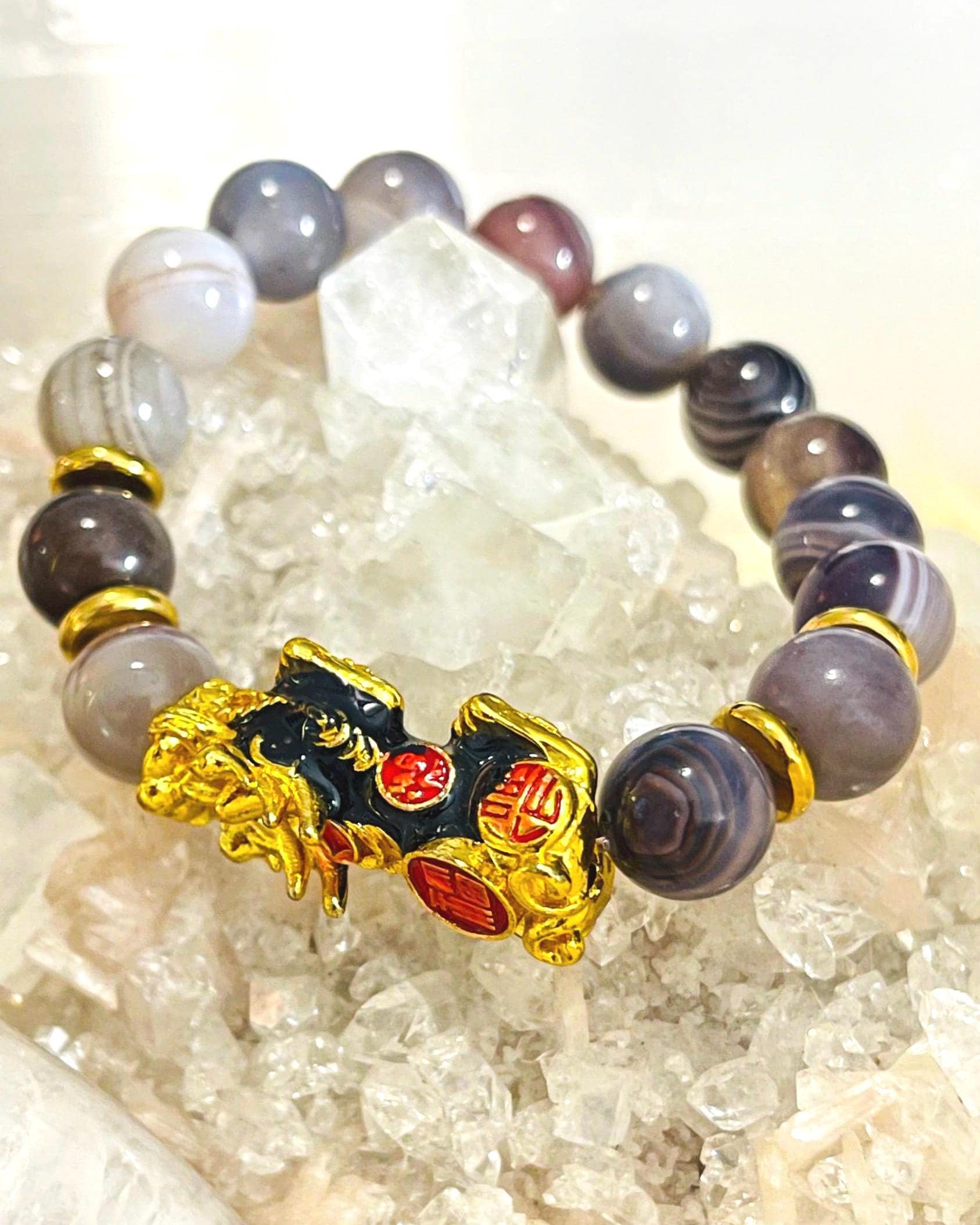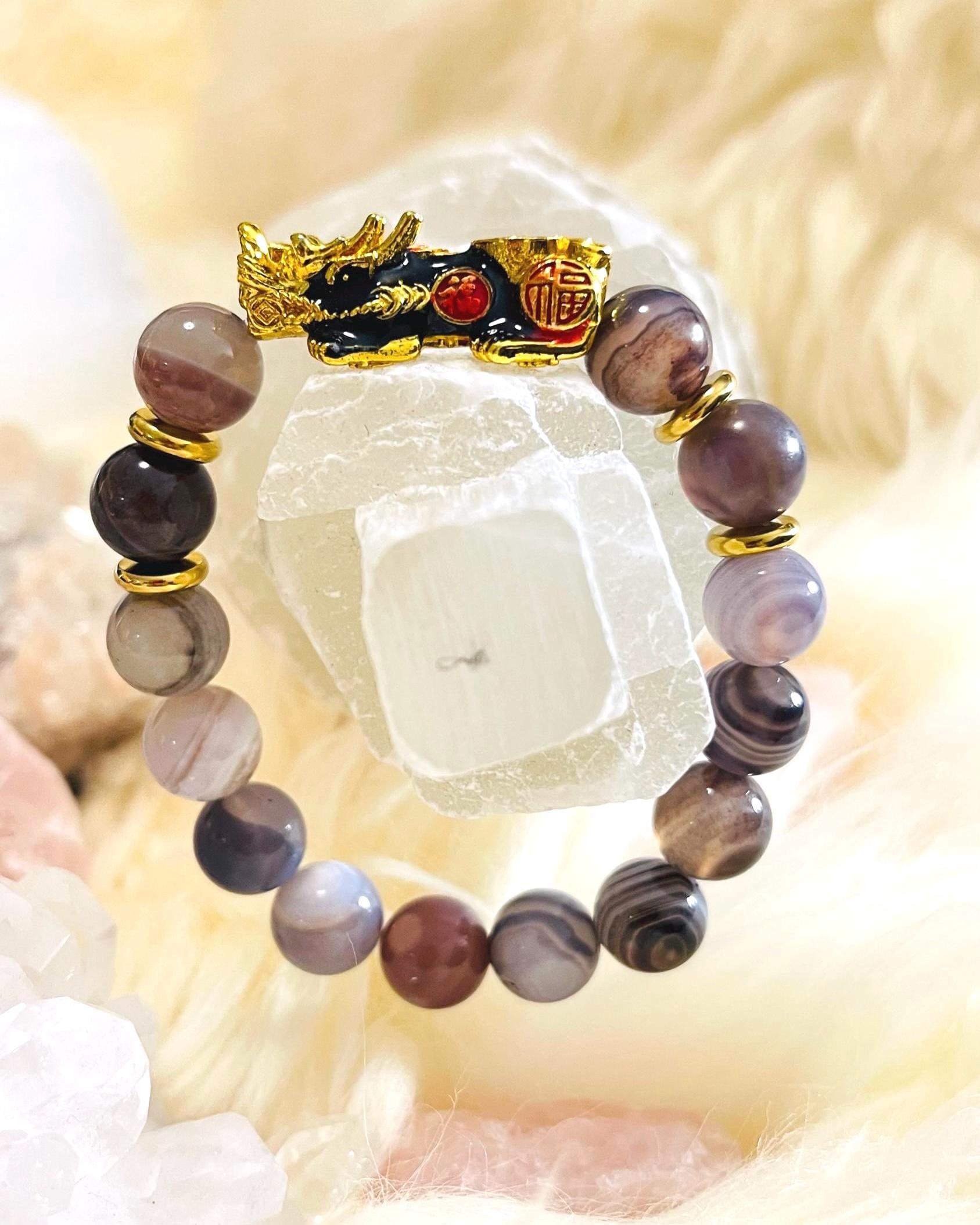 Attract steady strength and protective luck with a Botswana Agate bracelet with Dragon Pixiu, a meaningful piece of feng shui wealth jewelry designed for balance, confidence, and prosperity. Botswana Agate is cherished for its soft banding and grounding energy, often linked with comfort, emotional stability, and resilience. Wearing a Botswana Agate crystal bracelet is believed to help ease stress, calm racing thoughts, and support a steady mindset during change. Many also associate it with practical motivation and gentle confidence, making it a great stone for daily routines, goal-setting, and staying consistent on your path.