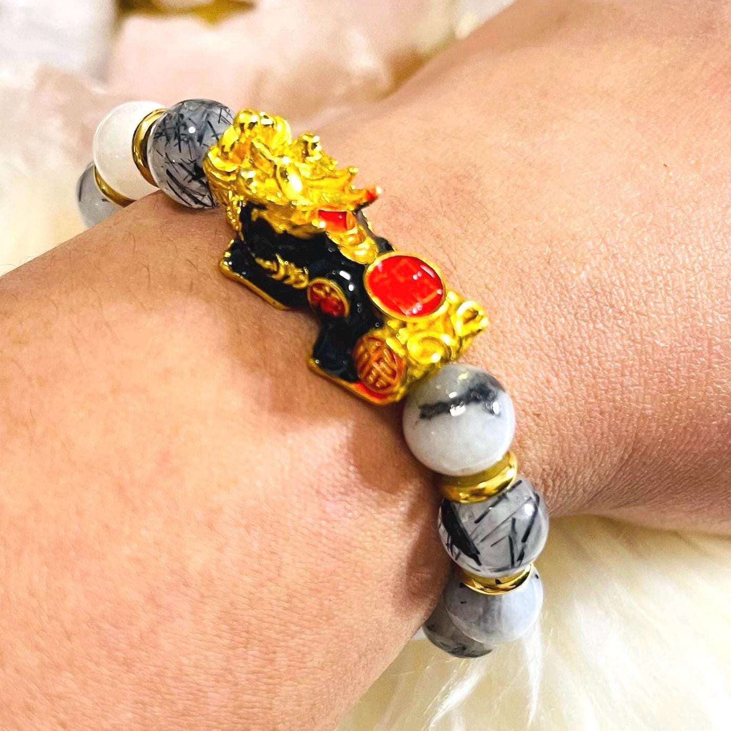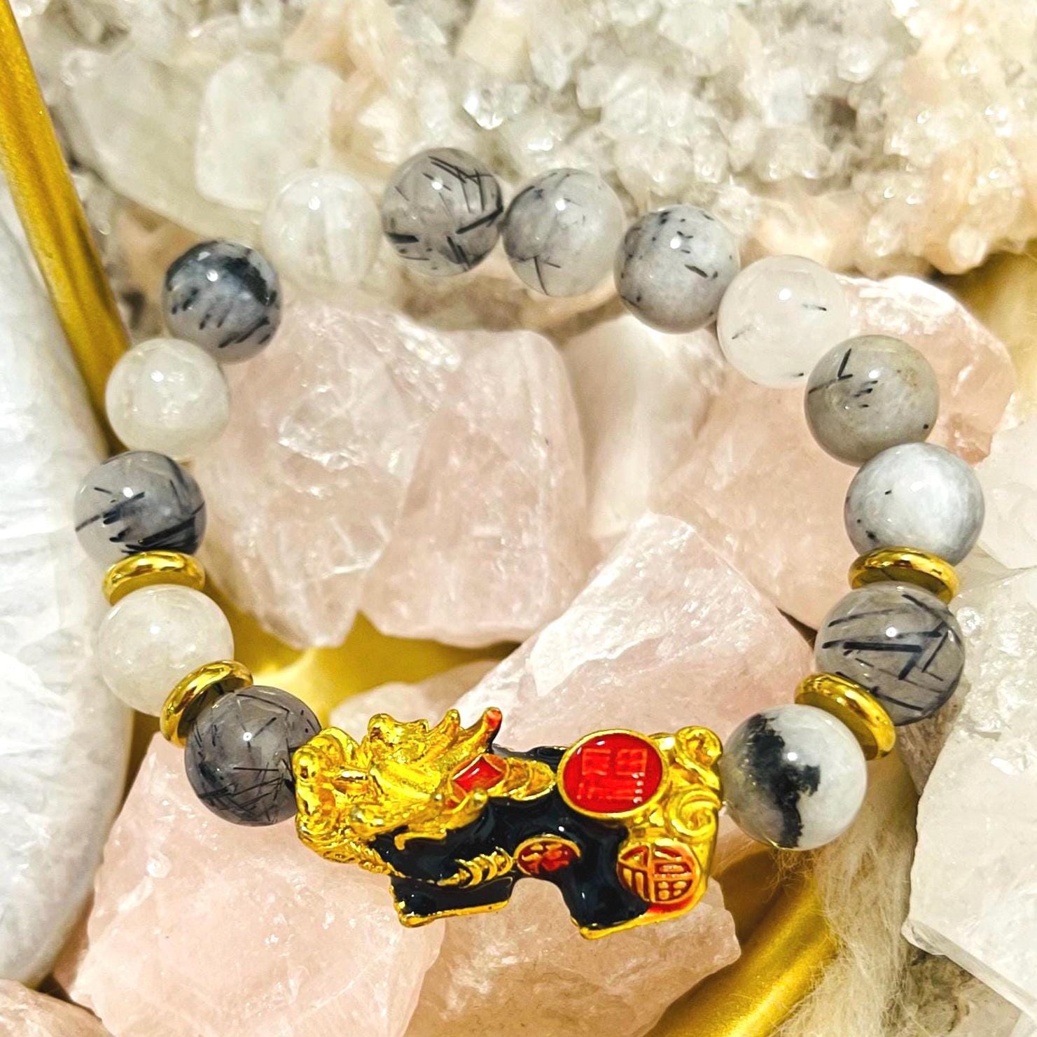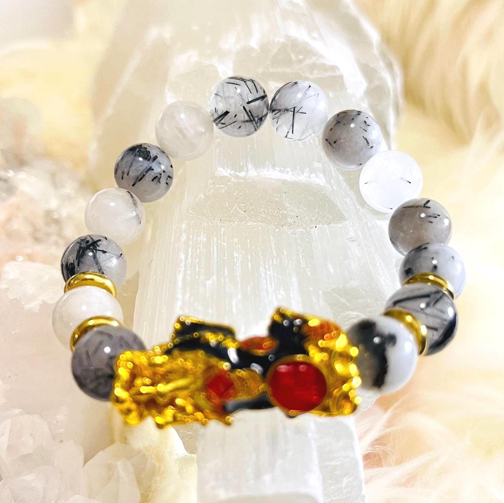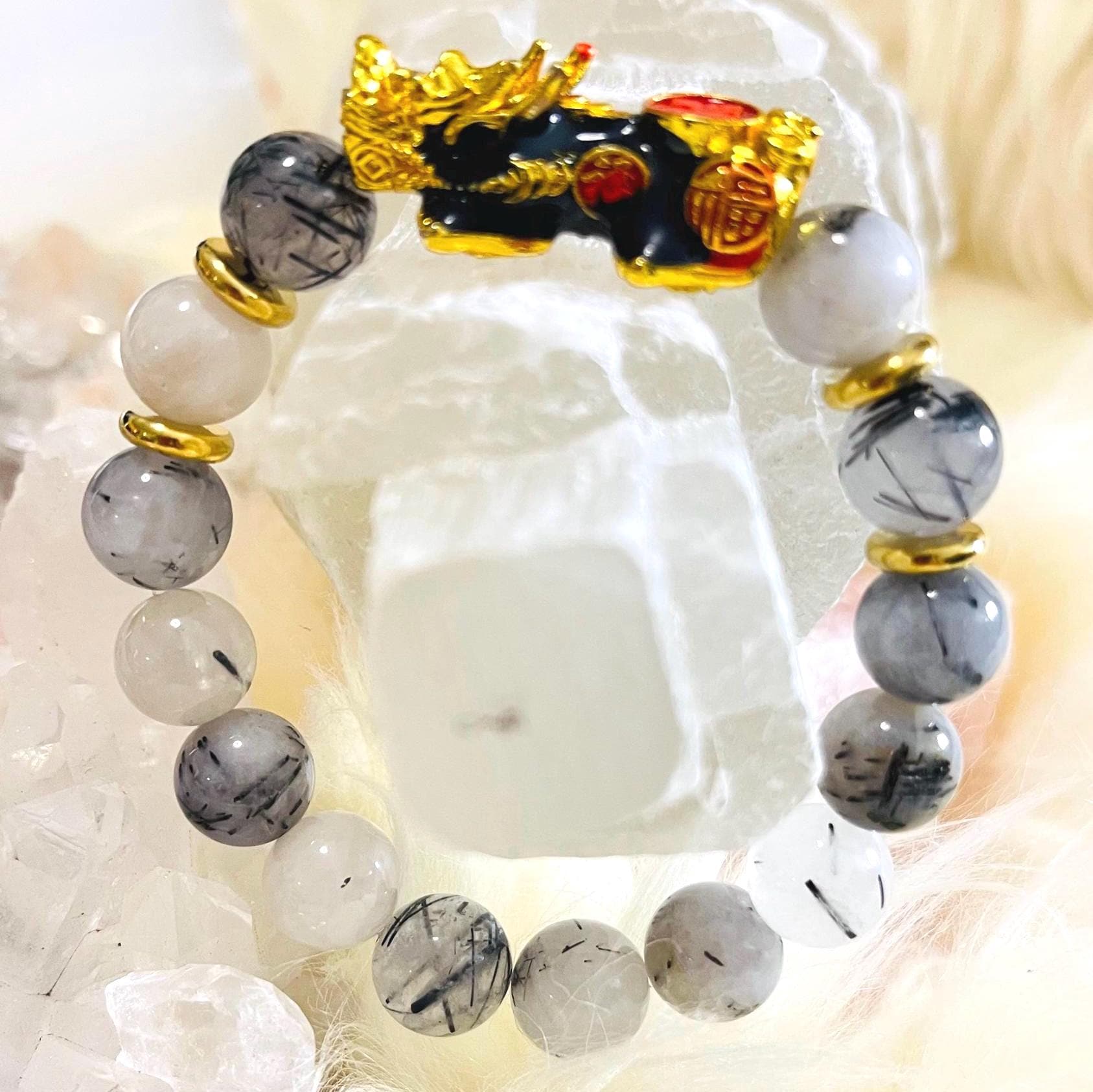 Unlock powerful protection and prosperity energy with a Rutilated Tourmaline bracelet with Dragon Pixiu, a statement piece of feng shui wealth jewelry made for people who want clarity, confidence, and strong spiritual shielding. Rutilated Tourmaline—often featuring striking golden needle-like inclusions—combines the amplifying qualities of rutile with tourmaline’s grounding strength. Wearing a Rutilated Tourmaline crystal bracelet is believed to support energy cleansing, emotional balance, and mental focus, helping clear negativity, reduce self-doubt, and strengthen your determination. Many wear it to enhance manifestation, attract opportunities, and stay aligned with goals while feeling protected from unwanted influences.
