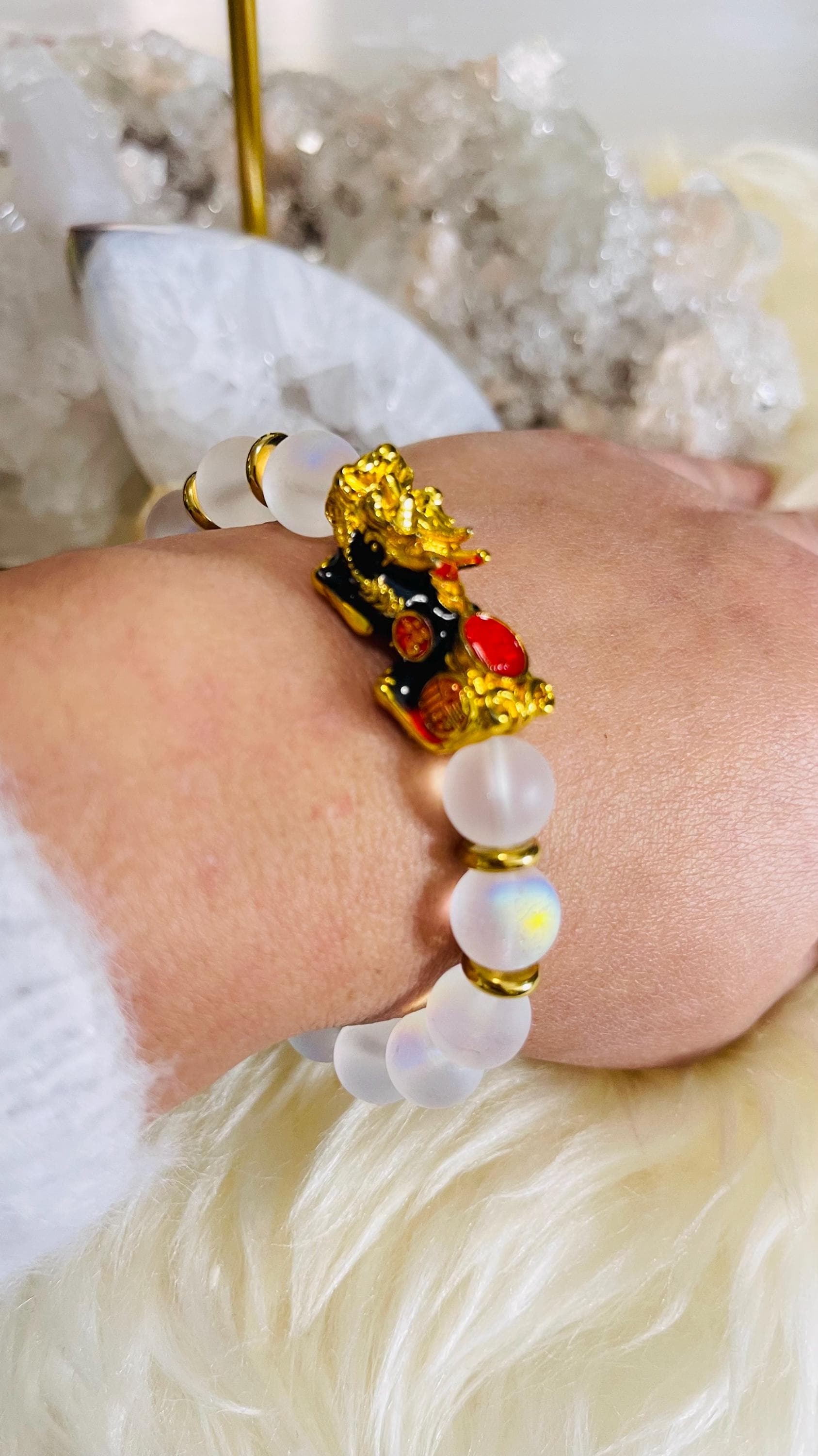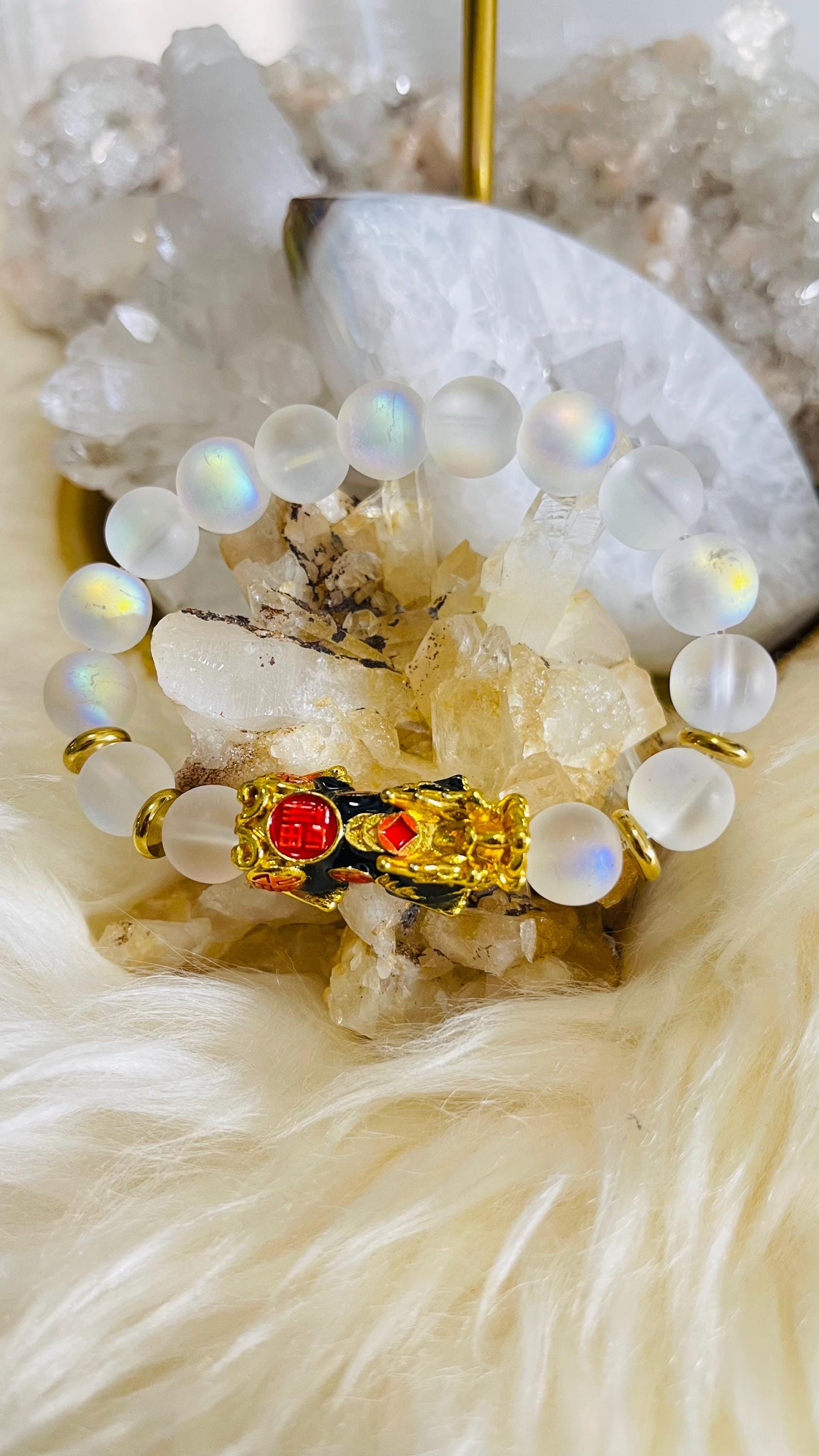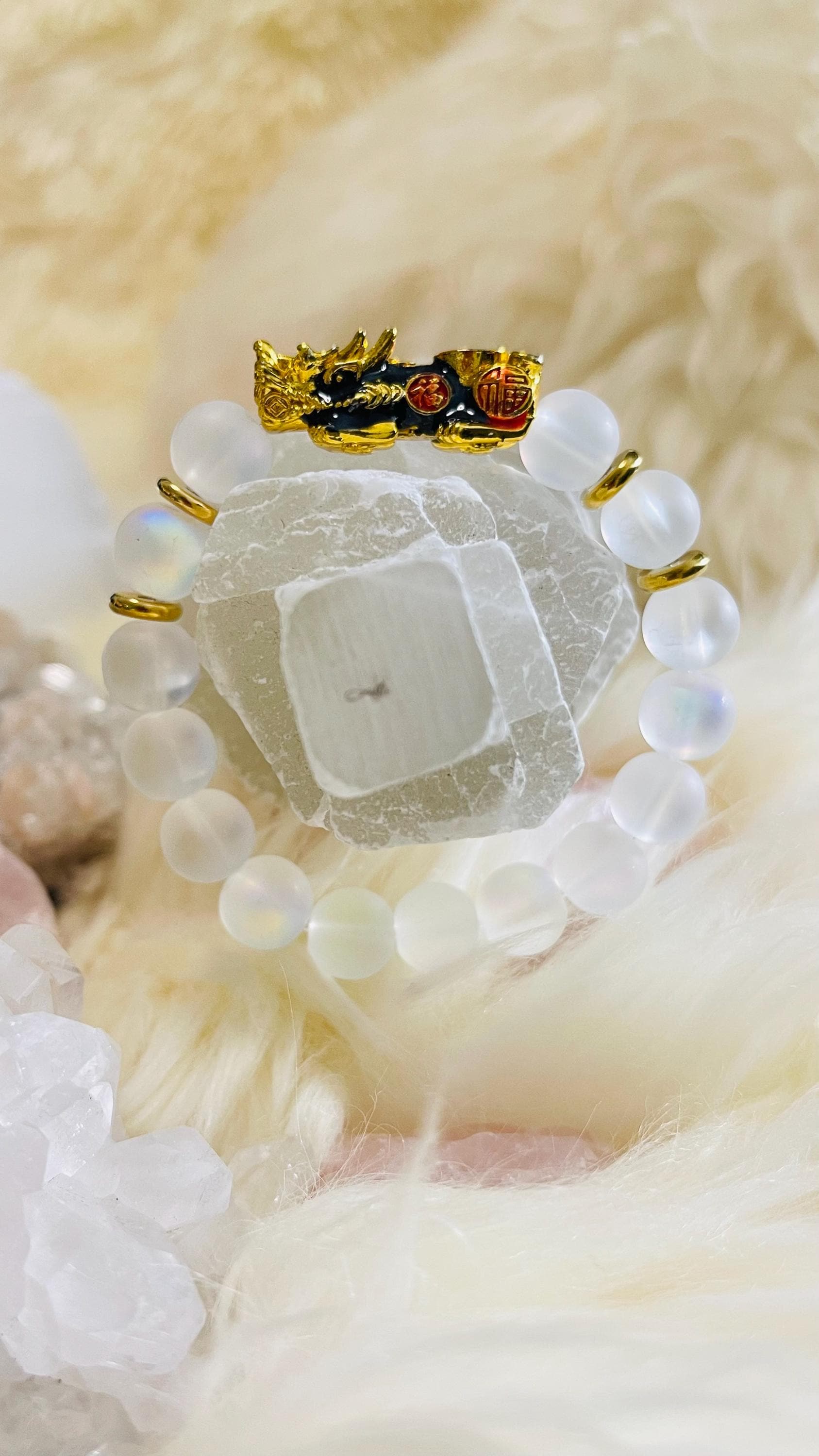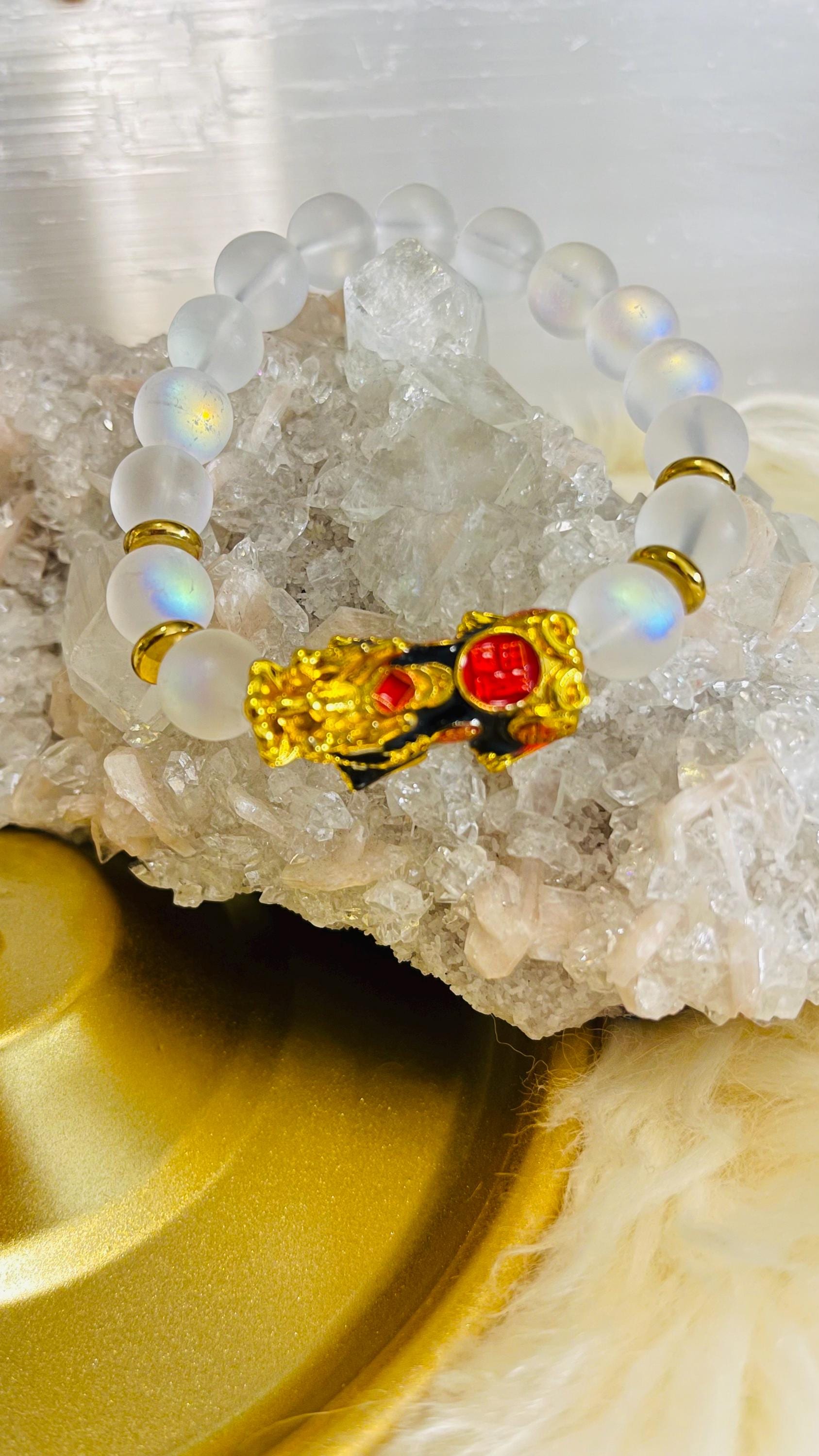 Invite calm intuition and prosperous protection with a lab-grown Moonstone bracelet with Dragon Pixiu, a modern piece of feng shui wealth jewelry made for balance, clarity, and new beginnings. Moonstone is celebrated as a stone of intuition, emotional harmony, and fresh starts, linked with gentle, soothing energy that helps you move through change with grace. Wearing a Moonstone crystal bracelet is believed to support inner calm, self-reflection, and confident decision-making, especially when life feels uncertain. With lab-grown Moonstone, you still enjoy the luminous “moon glow” look while choosing a more consistent, crafted option that many people prefer for everyday wear.