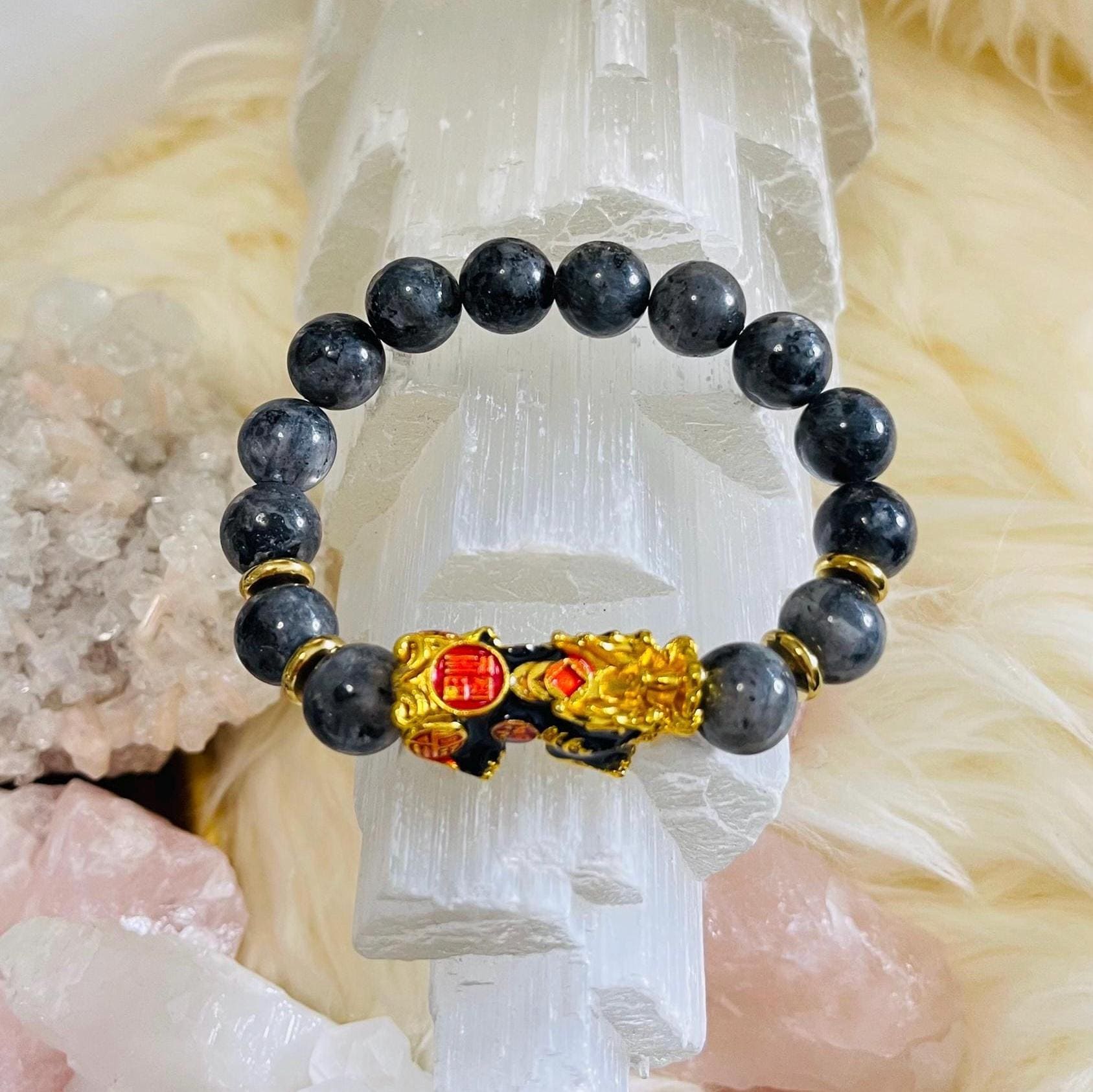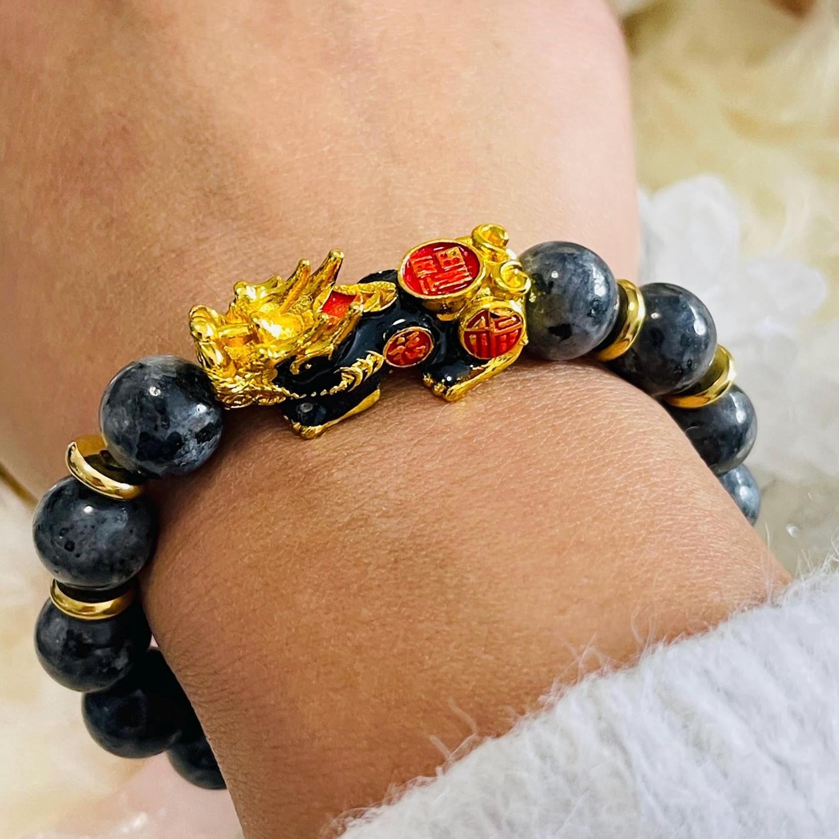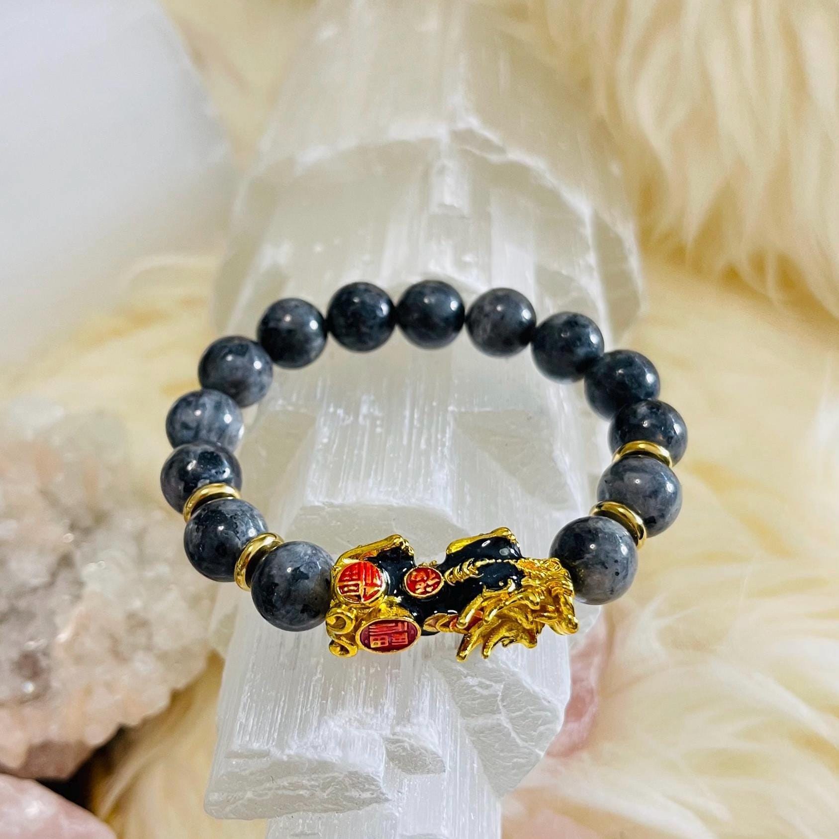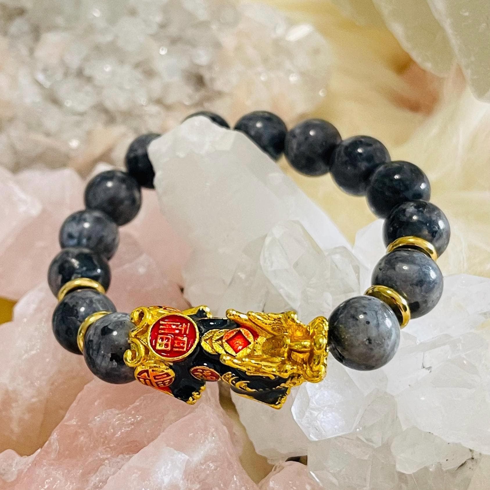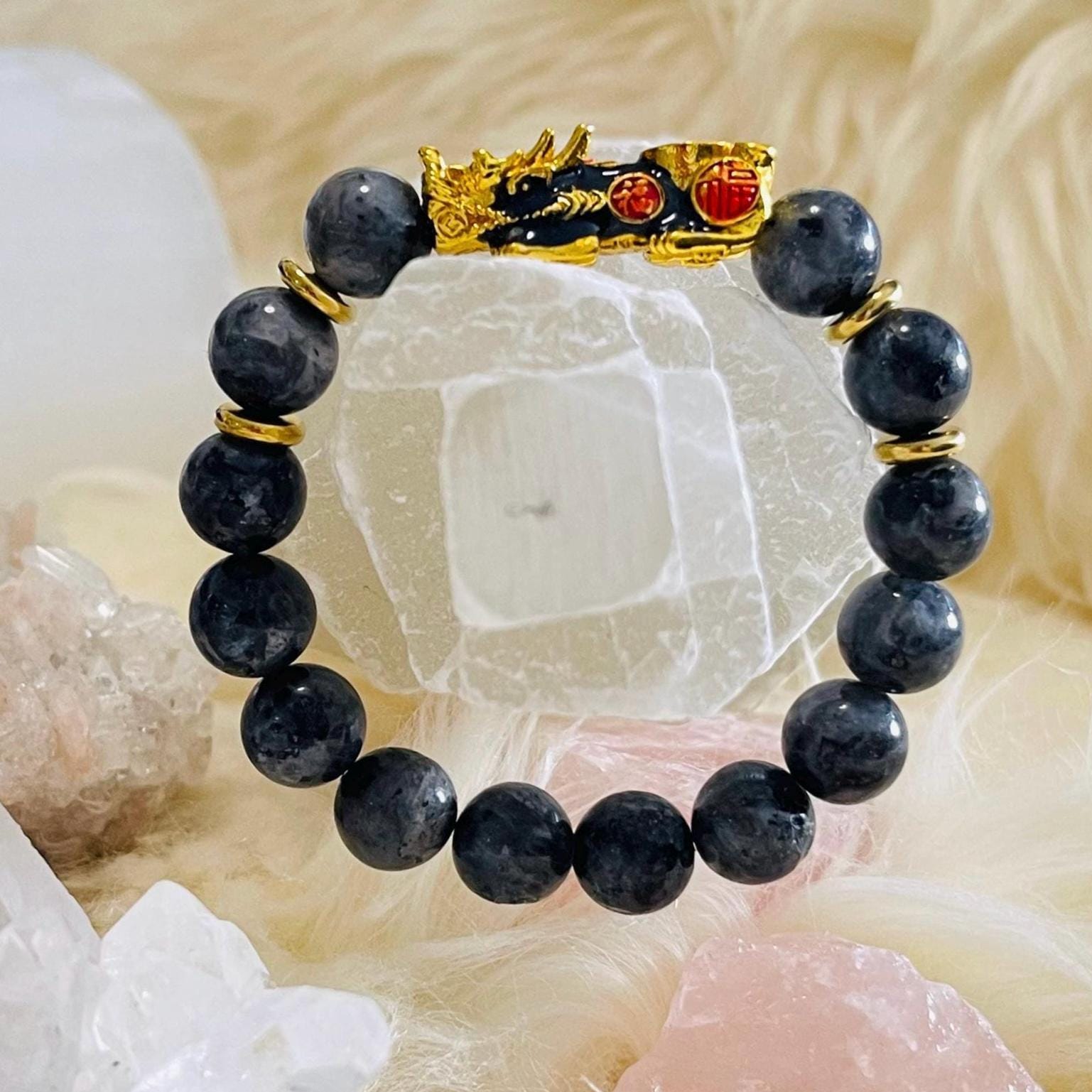 Step into grounded protection and smart prosperity with a Larvikite bracelet with Dragon Pixiu, a bold piece of feng shui wealth jewelry made for stability, focus, and energetic shielding. Larvikite—often called “Black Moonstone” for its subtle blue-silver flash—is valued as a stone of grounding, mental clarity, and inner strength. Wearing a Larvikite crystal bracelet is believed to help calm an overactive mind, sharpen concentration, and support clear decision-making, especially during stressful seasons. Many also wear Larvikite for protection, as it’s thought to absorb negative energy, strengthen boundaries, and keep your aura feeling steady and clean.