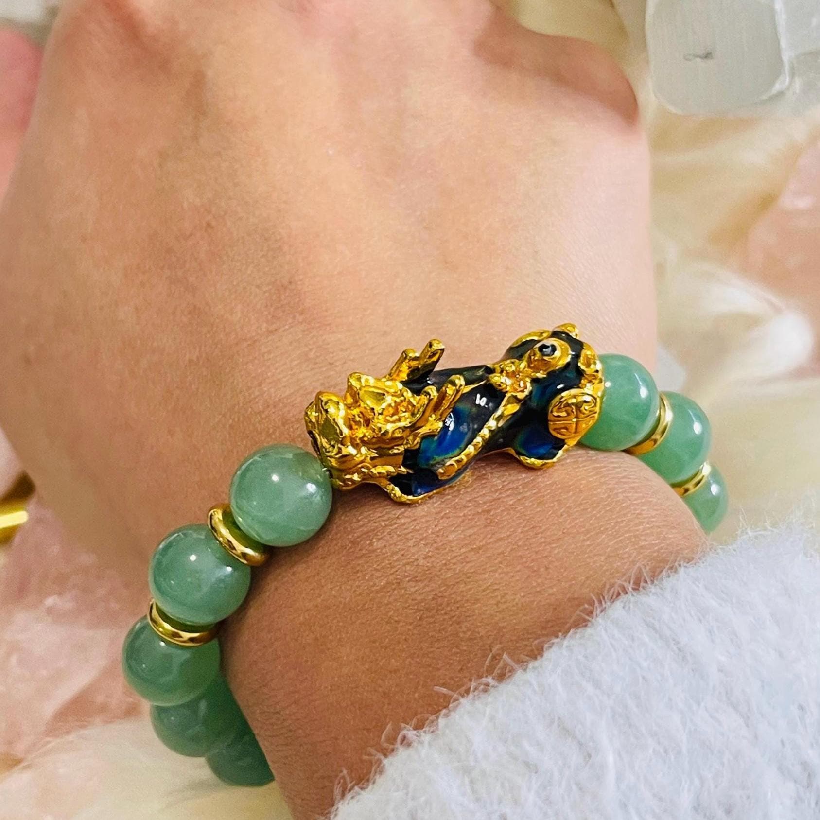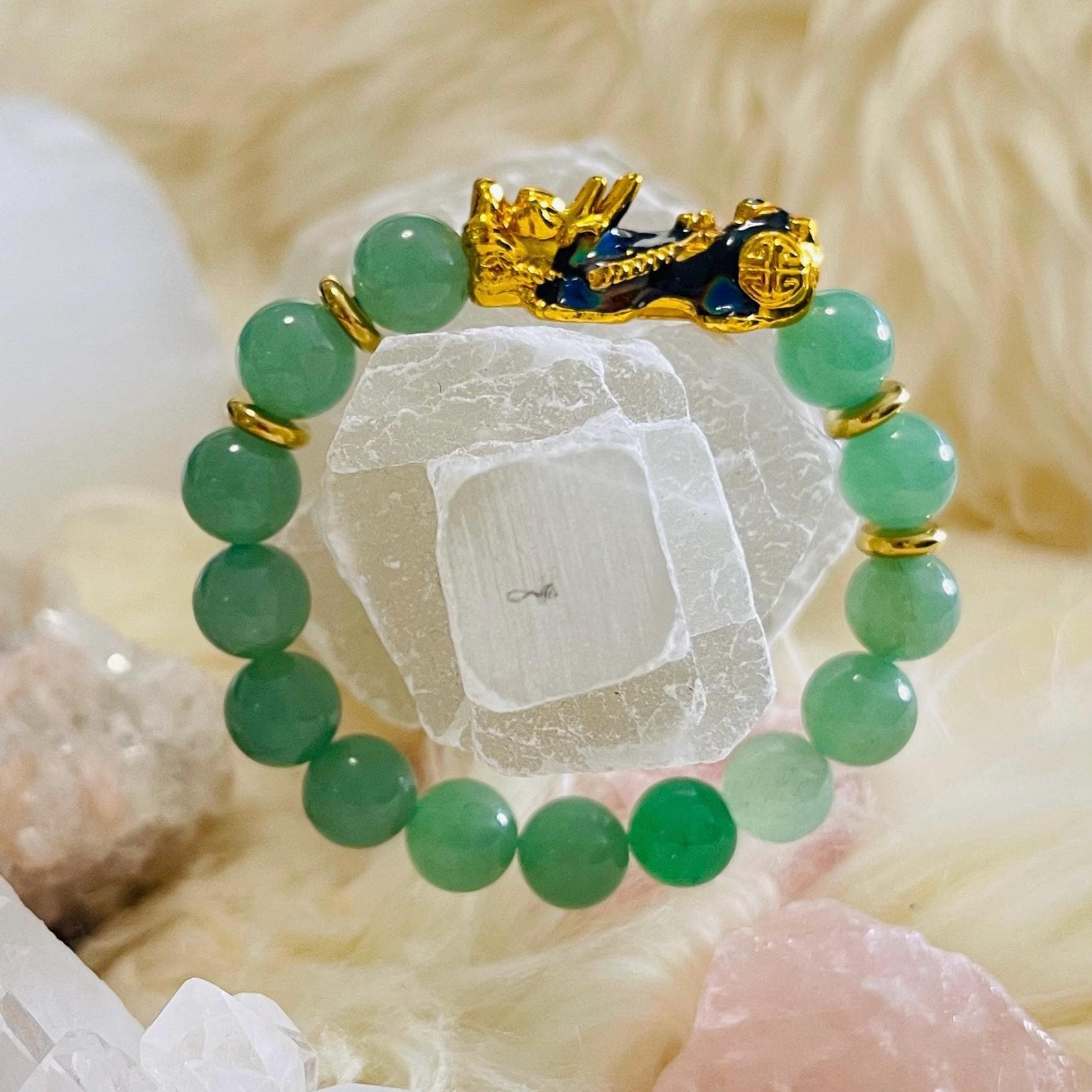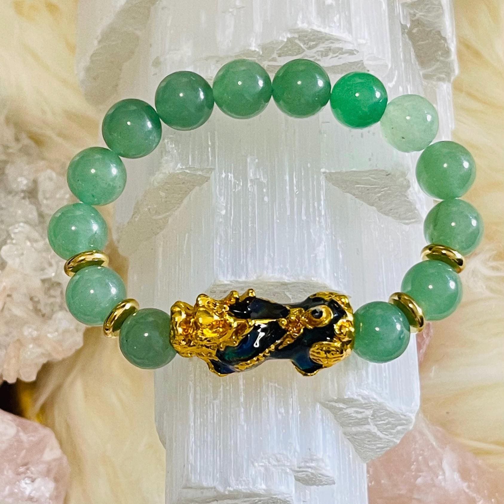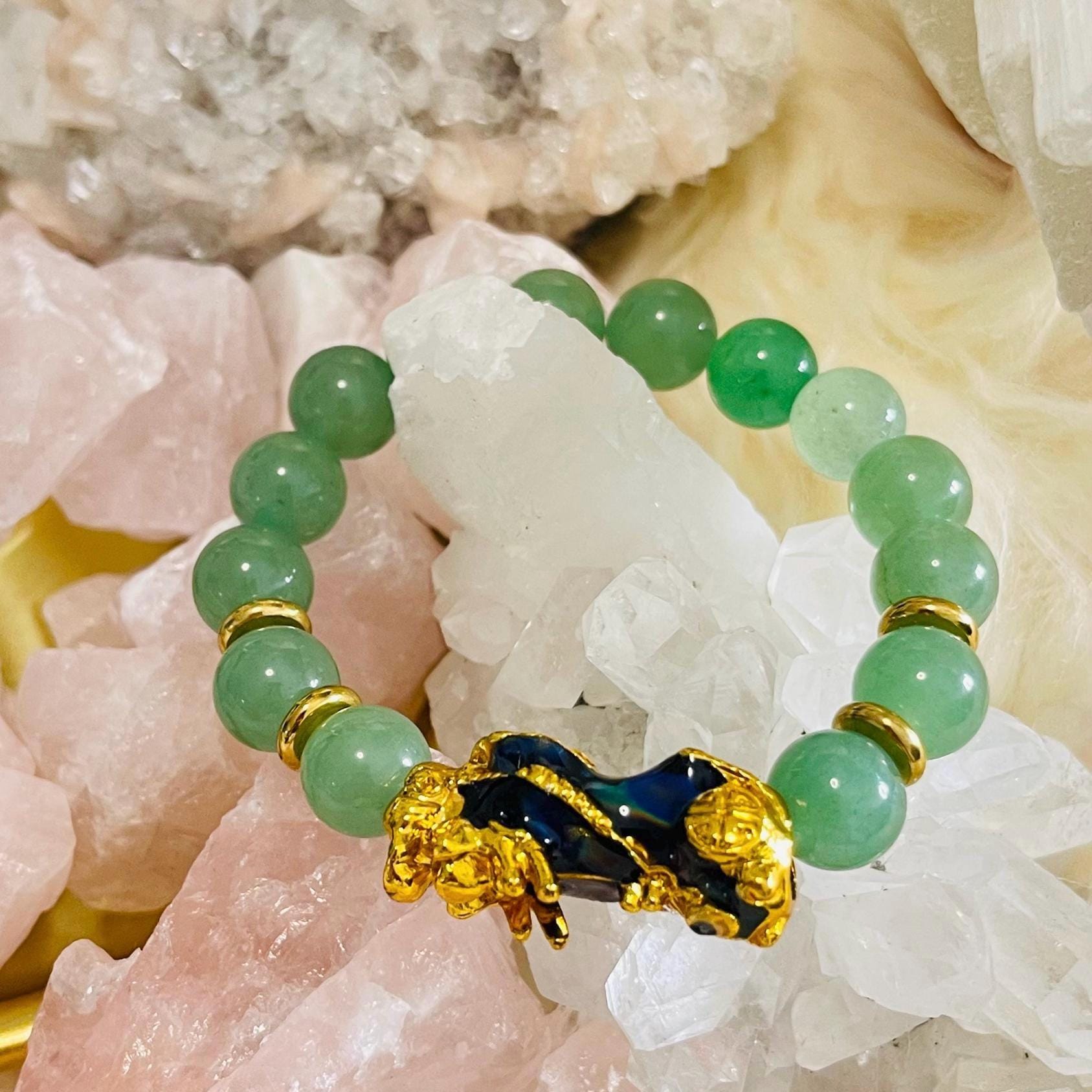 Attract luck and steady abundance with an Aventurine bracelet with Dragon Pixiu, a favorite in feng shui wealth jewelry for prosperity and protection. Green Aventurine is known as the “stone of opportunity,” believed to support good luck, confidence, and emotional balance. Wearing an Aventurine crystal bracelet may help encourage optimism, calm stress, and keep you open to new chances in career, business, and money goals.