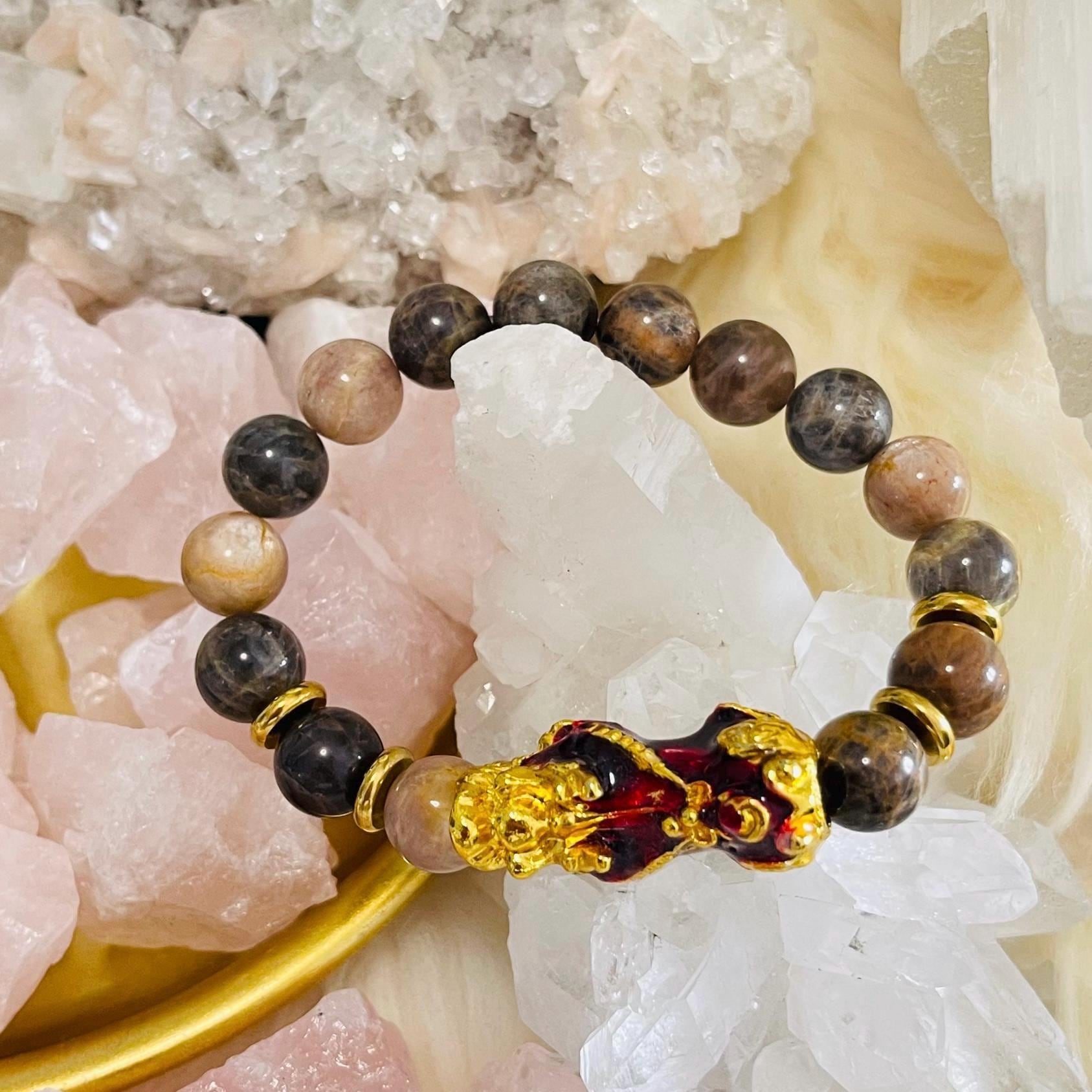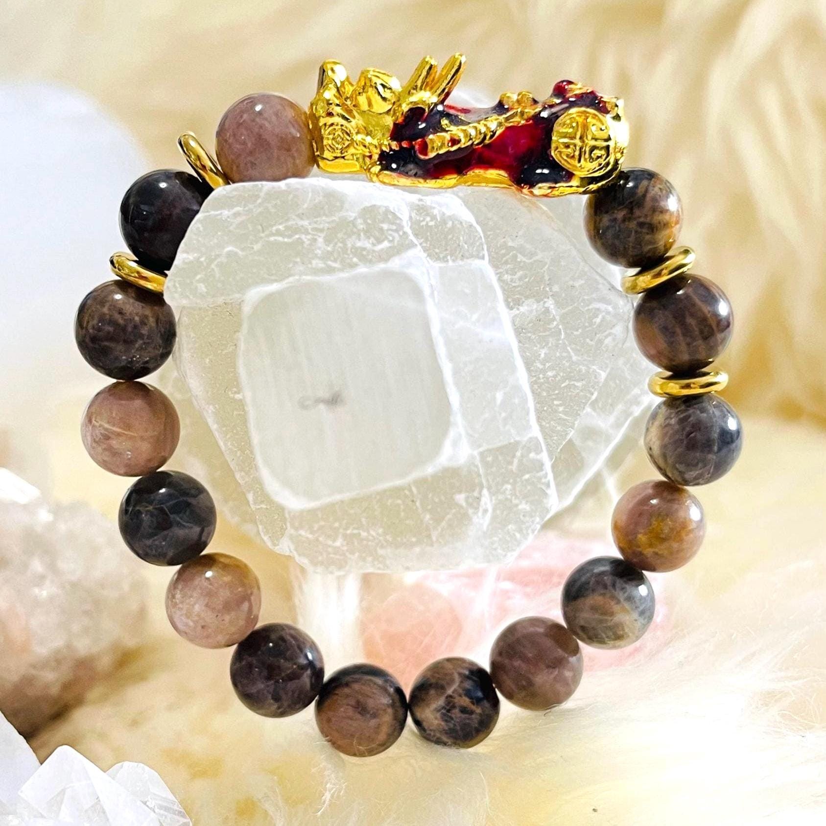 Shine brighter and attract protected prosperity with a Sunstone bracelet with Dragon Pixiu, a vibrant piece of feng shui wealth jewelry for confidence and success. Sunstone is known for its uplifting energy, often linked to joy, motivation, and personal power. Wearing a Sunstone crystal bracelet is believed to support optimism, leadership, and self-worth, helping you take bold steps, clear self-doubt, and welcome new opportunities—especially in career and business.