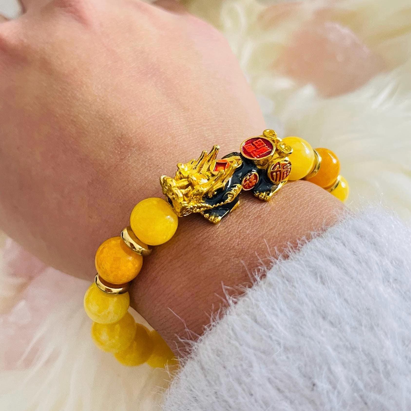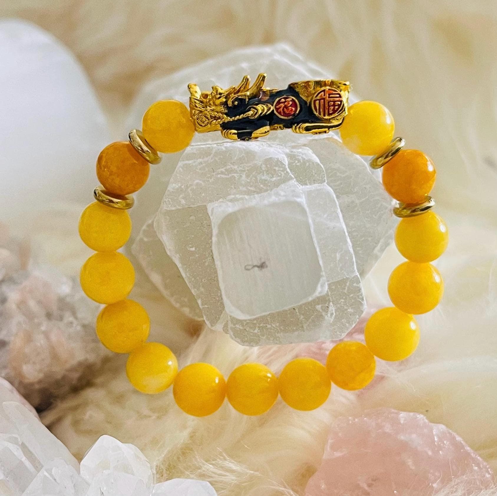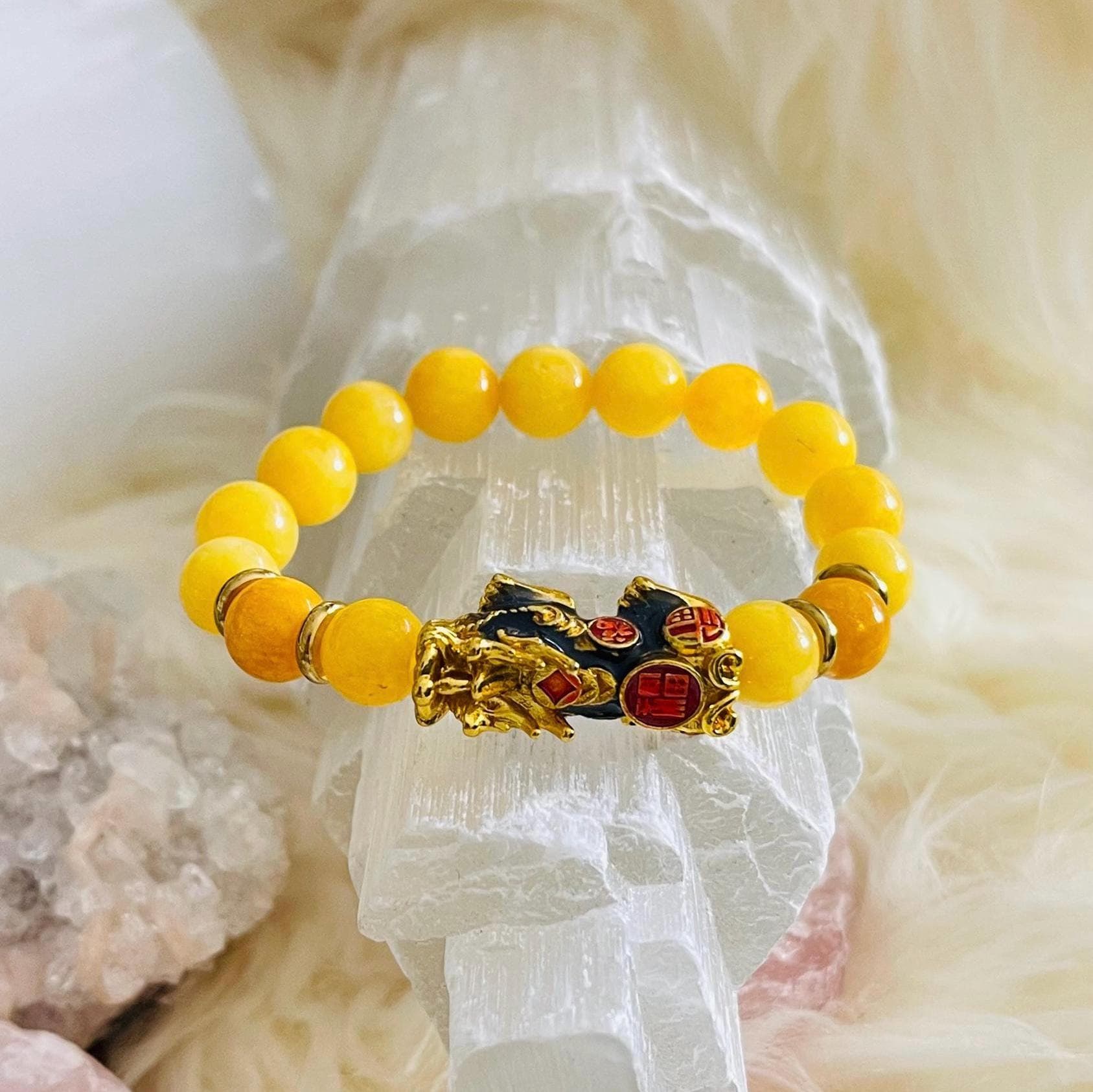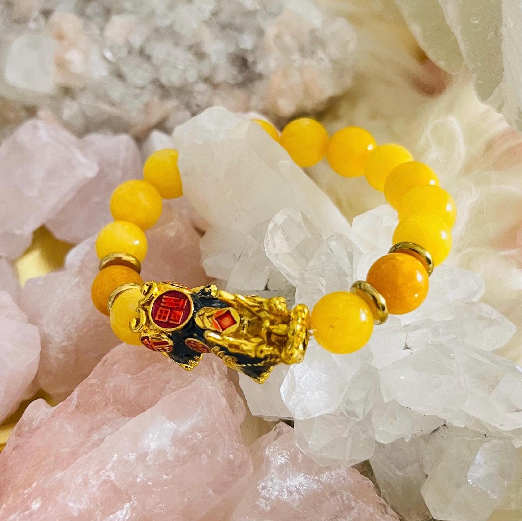 Invite joy, abundance, and protected prosperity with our Yellow Jade Dragon Pixiu Bracelet—a radiant piece of feng shui wealth jewelry designed to attract money luck while keeping your energy calm and balanced. Yellow Jade is traditionally associated with good fortune, wisdom, and emotional harmony, believed to encourage positive thinking, steady confidence, and smart decision-making. Wear this Yellow Jade crystal bracelet to support inner peace, motivation, and consistent progress—perfect for career growth, business success, and new beginnings.
