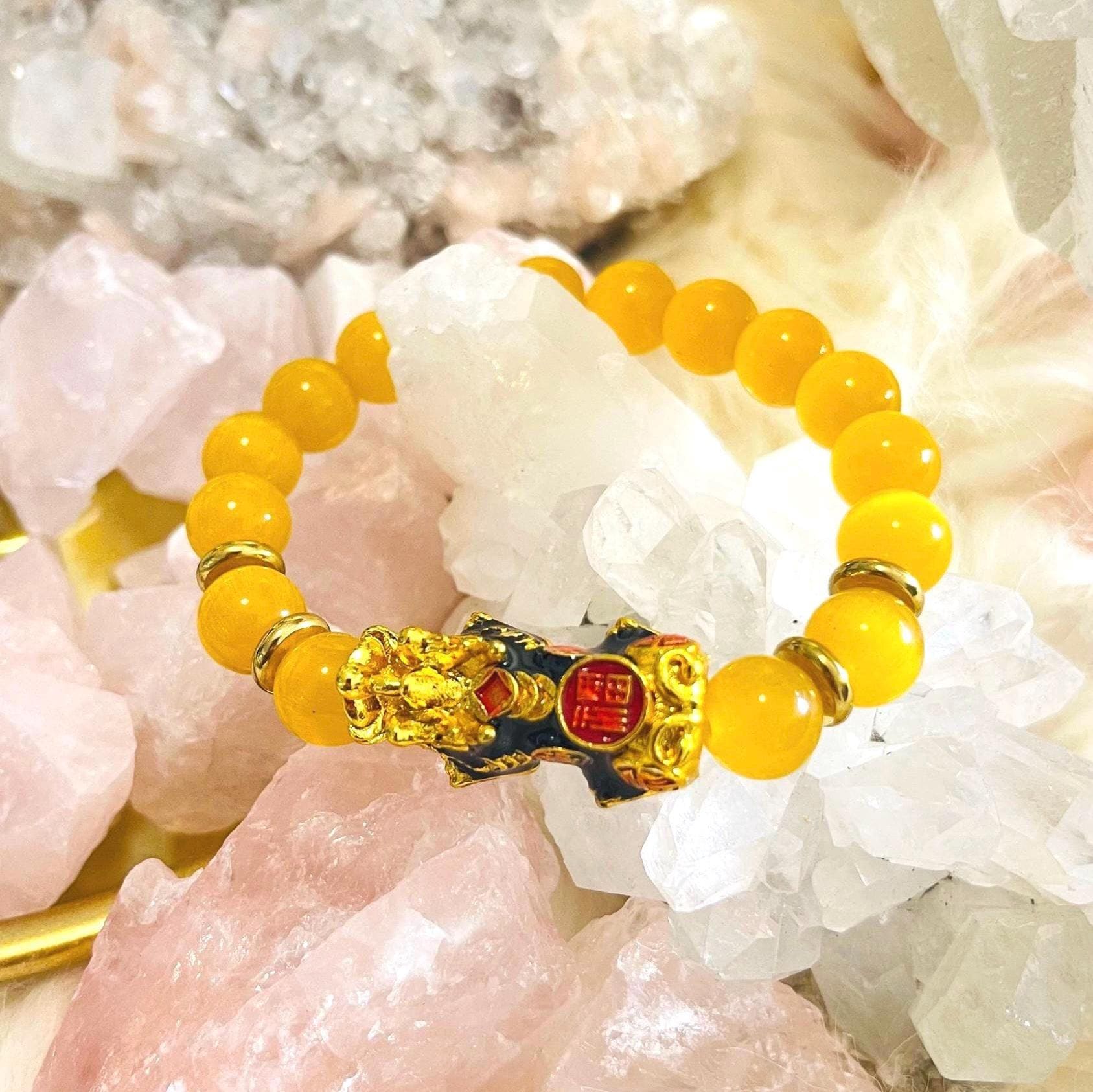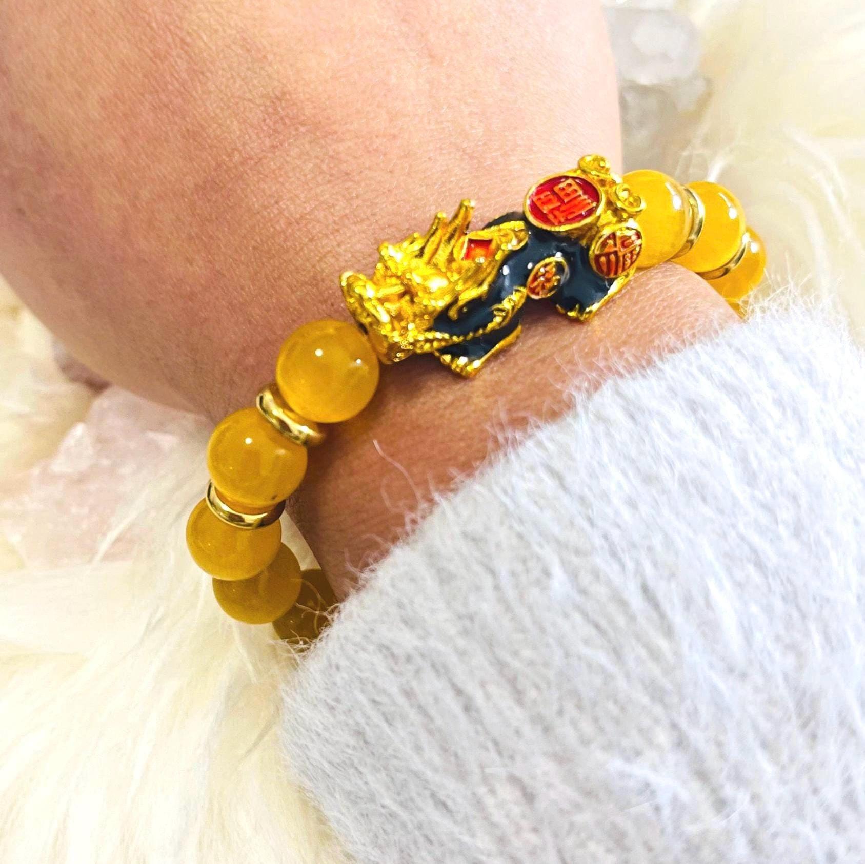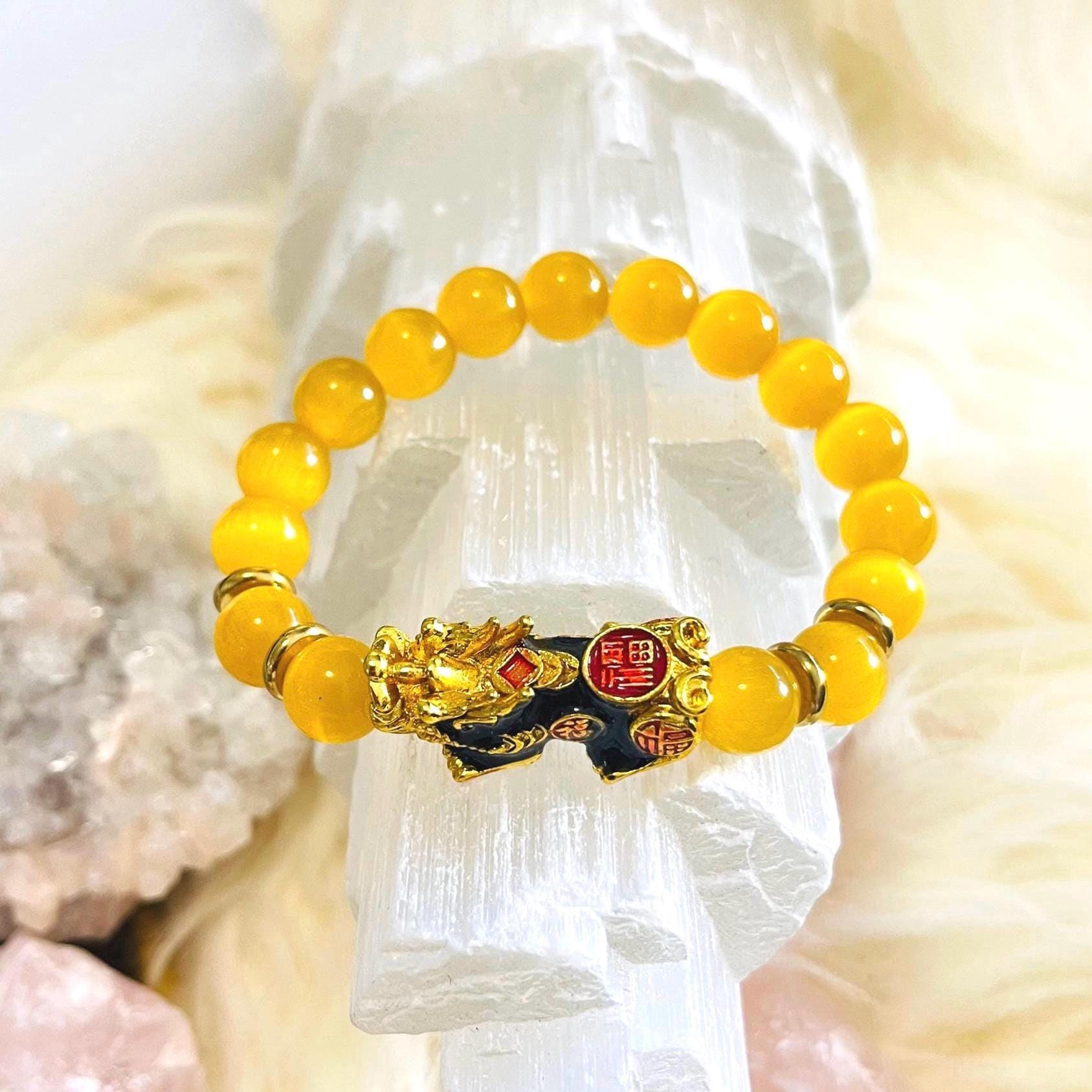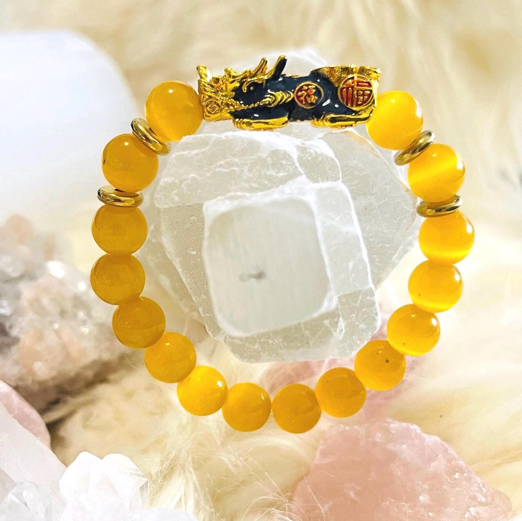 Brighten your energy and attract protected prosperity with our Yellow Cat’s Eye Dragon Pixiu Bracelet—a radiant piece of feng shui wealth jewelry designed for money luck, confidence, and daily protection. Yellow Cat’s Eye is admired for its glowing “eye” shimmer (chatoyancy) and is often associated with focus, optimism, and energetic shielding. Wearing a Yellow Cat’s Eye bracelet is believed to support mental clarity, calm the mind, and strengthen determination—perfect for busy workdays, studying, interviews, and goal-setting.