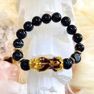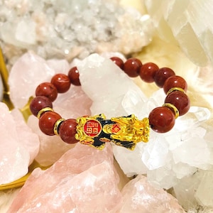 At the center is a detailed Dragon Pixiu (Pi Yao) charm—an iconic feng shui symbol for wealth attraction and protection. Pixiu is said to draw in prosperity, guard your fortune, and repel negative energy, helping opportunities flow while protecting what you’ve earned. In Dragon form, Pixiu represents power, authority, and victory, amplifying ambition and success energy.