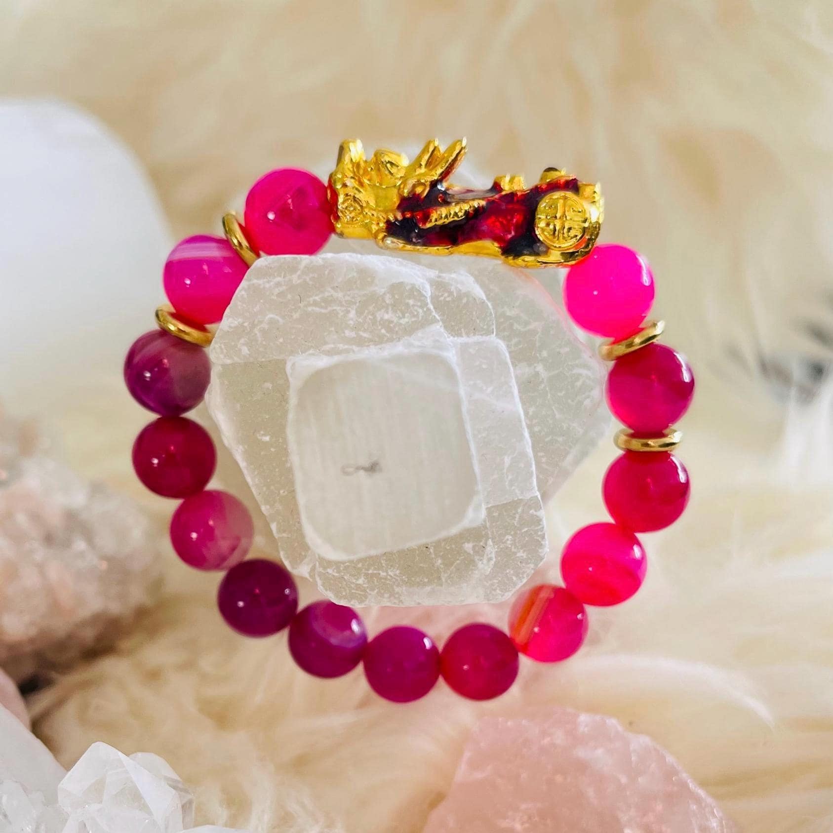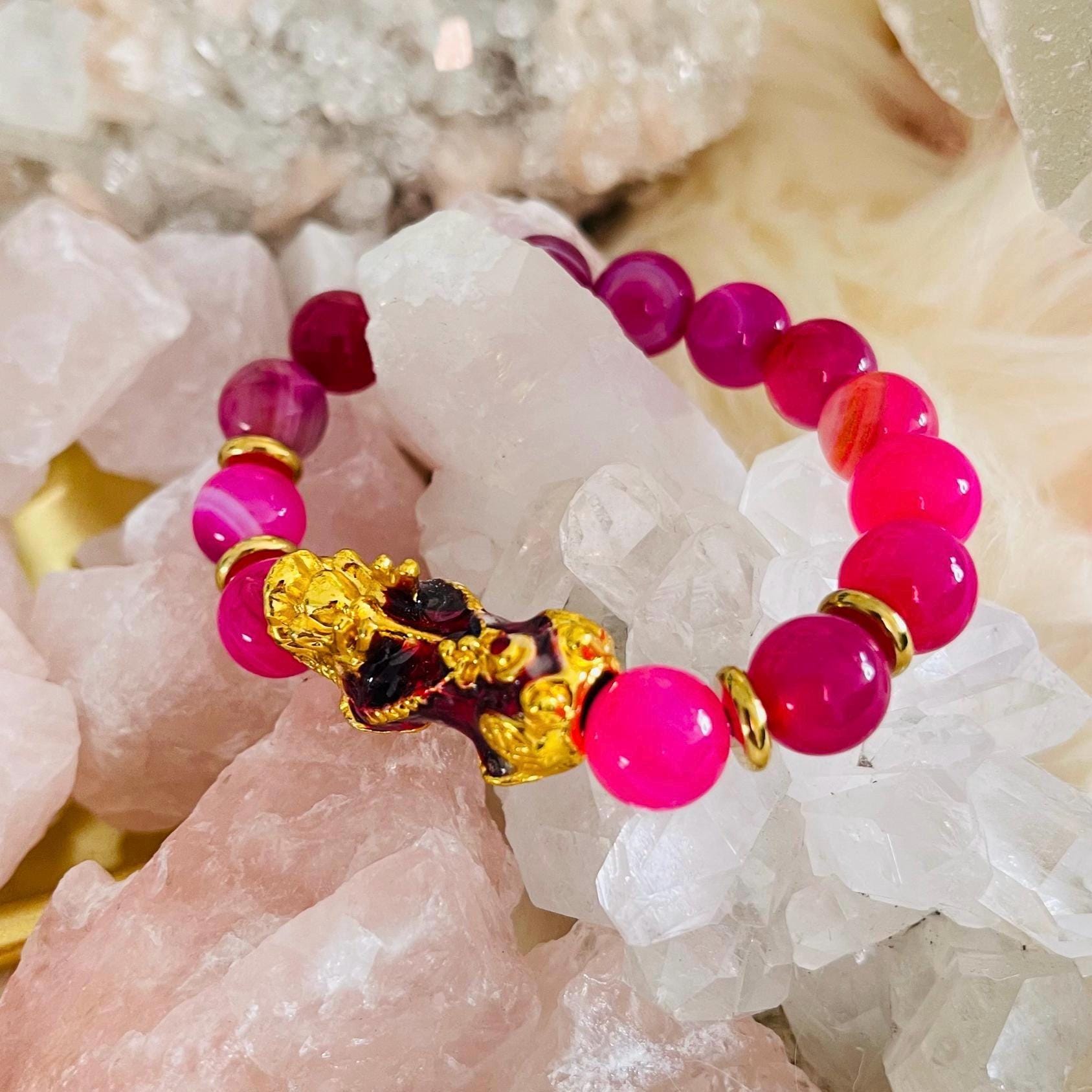 A thoughtful gift for birthdays, anniversaries, new chapters, or business launches, this Pink Agate Pixiu bracelet is the perfect lucky charm bracelet for prosperity, protection, and heart healing.