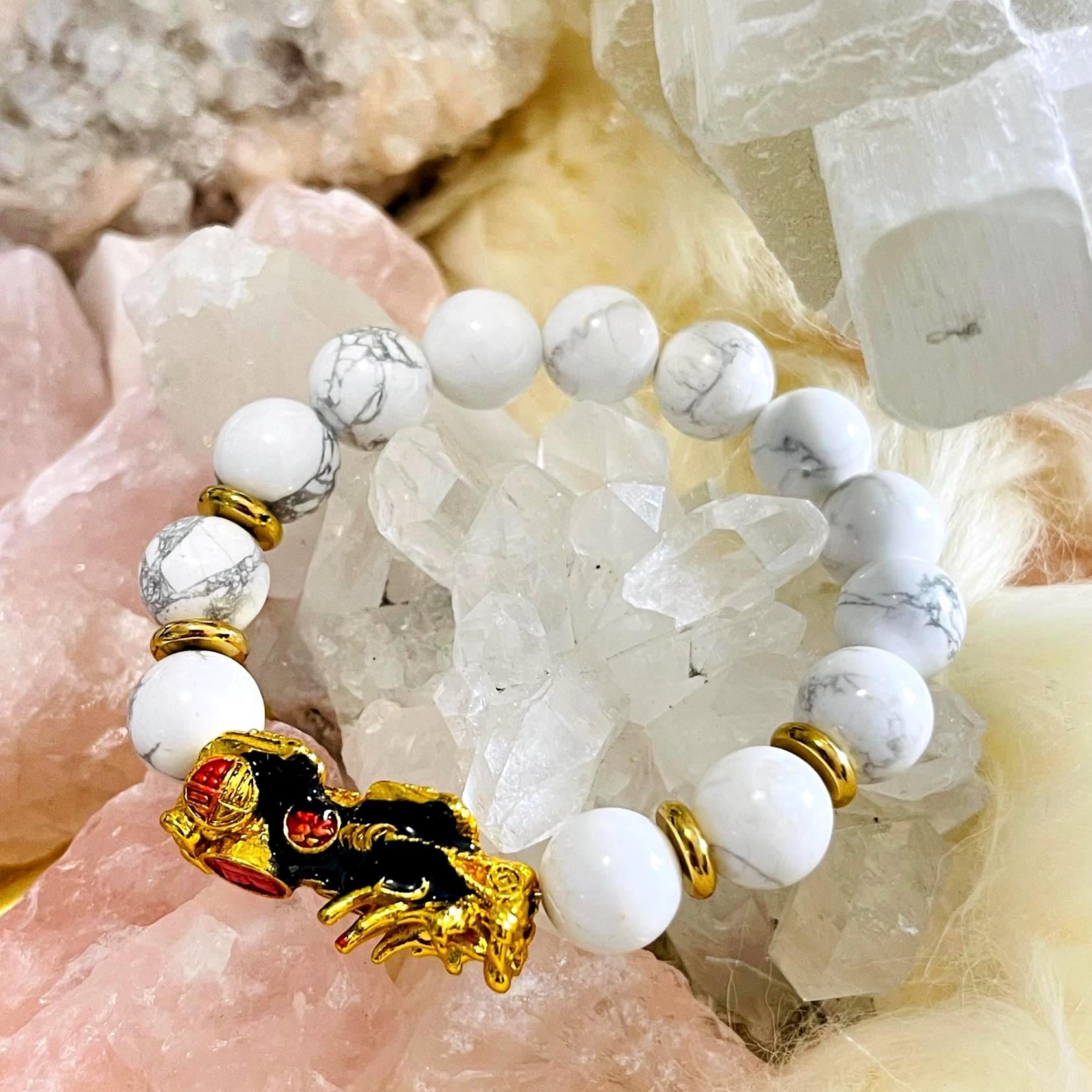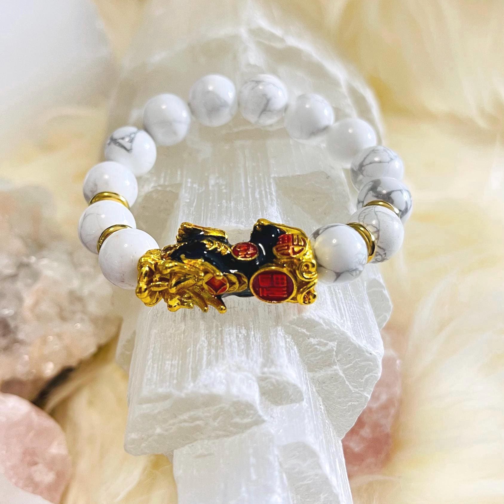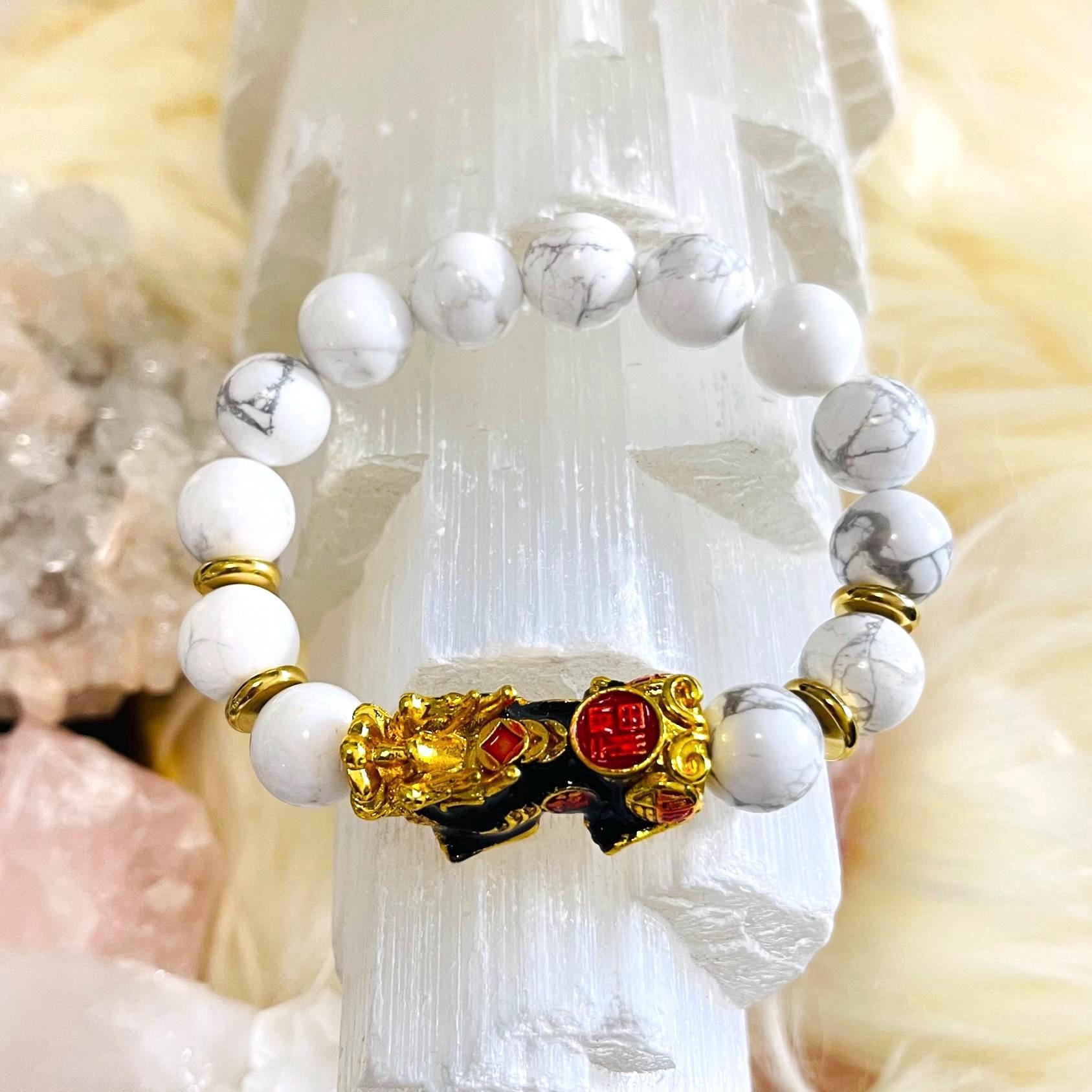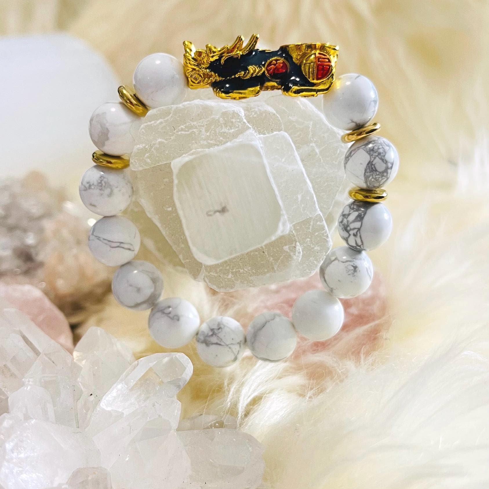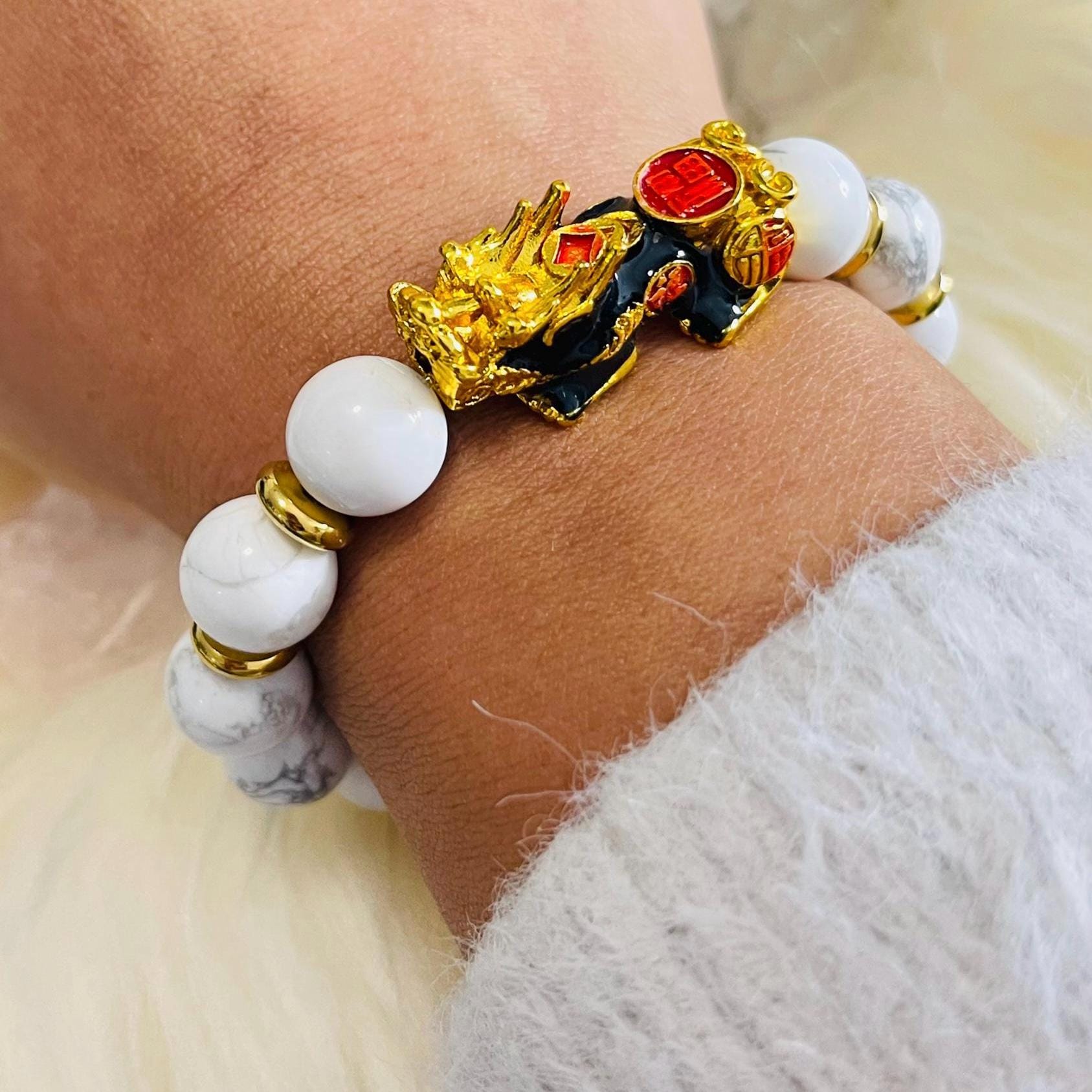 Find calm, protection, and prosperity in one powerful piece: our Howlite Dragon Pixiu Bracelet—a stylish feng shui wealth bracelet designed to attract money luck while keeping your mind grounded and your energy protected. Howlite is loved for its soft white-marble look and its reputation as a crystal for peace, patience, and emotional balance. Wearing a Howlite crystal bracelet is believed to reduce stress, quiet overthinking, and support a calmer mood—perfect for everyday wear, busy workdays, or anyone who wants a more relaxed mindset.