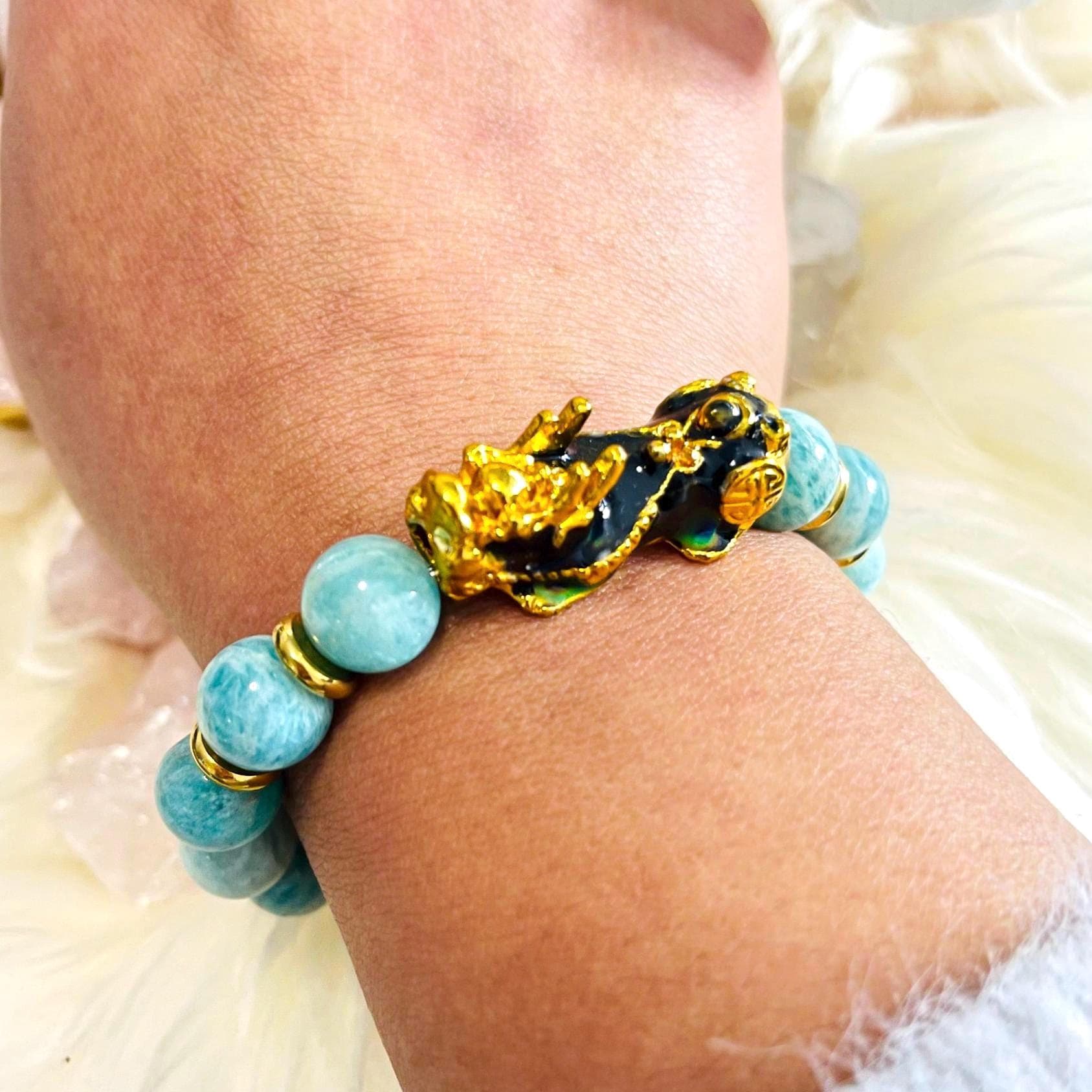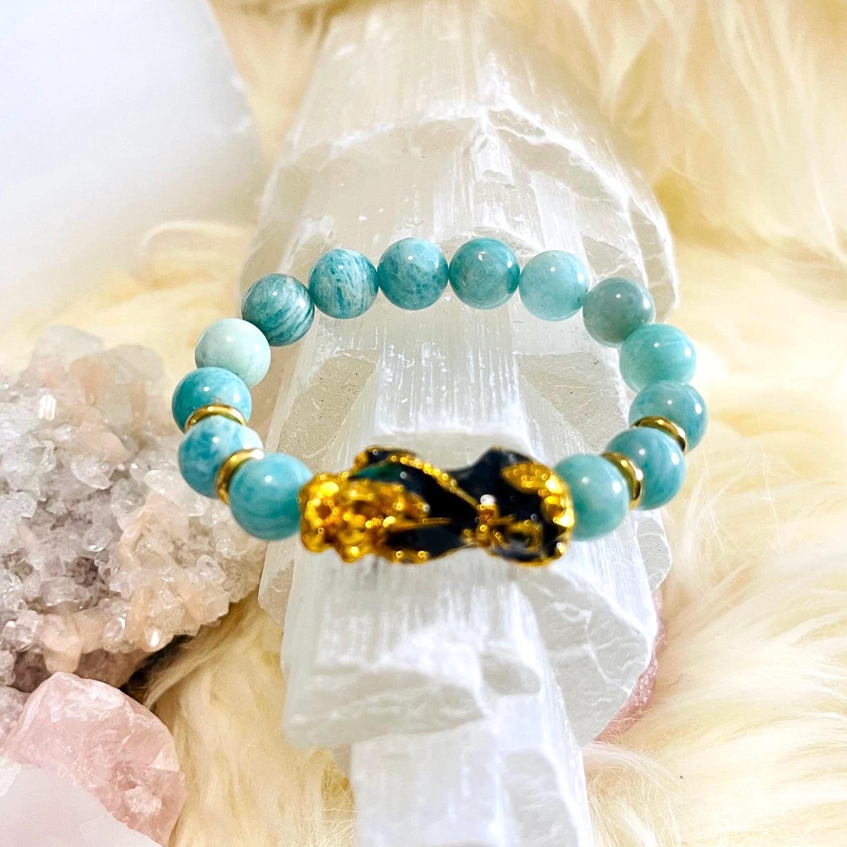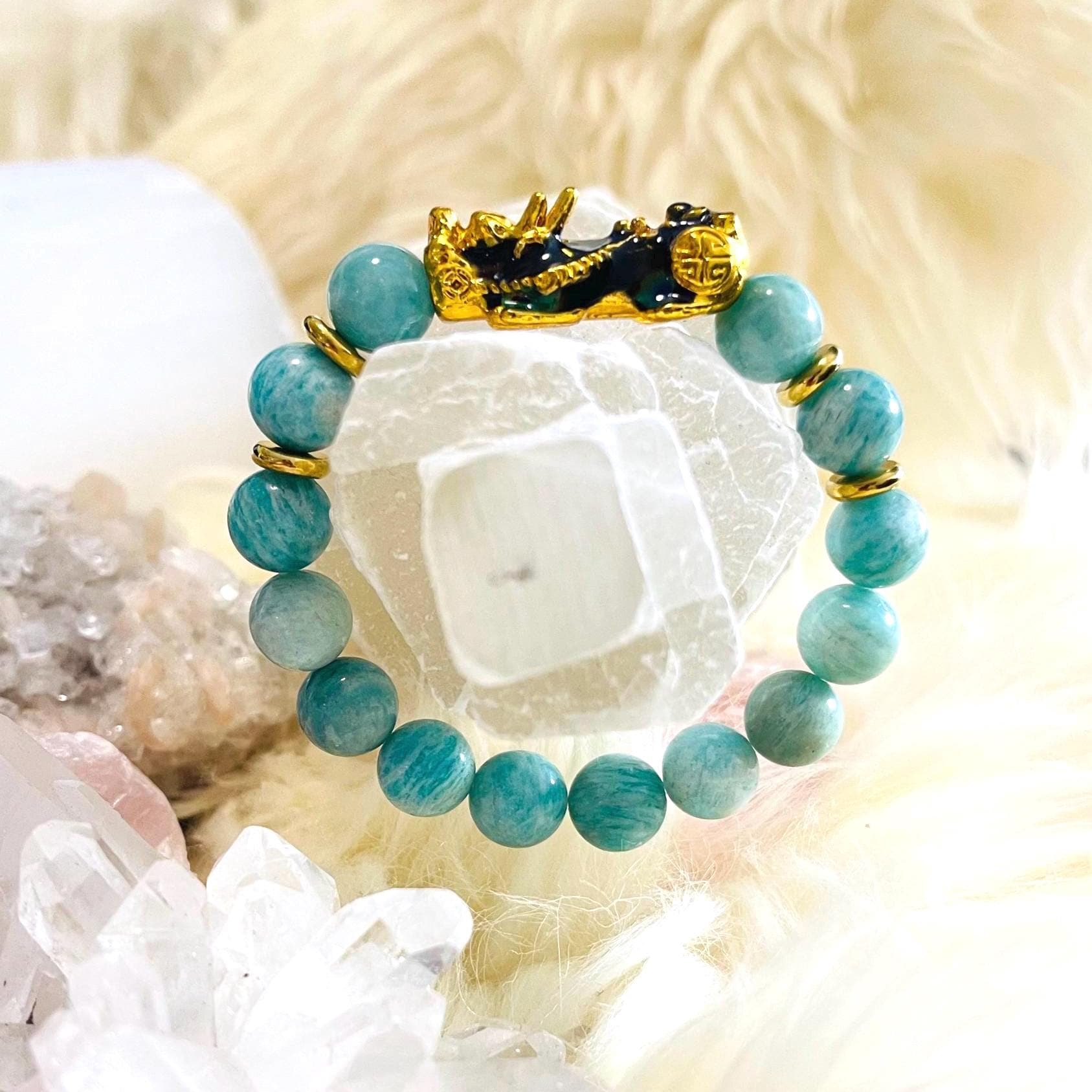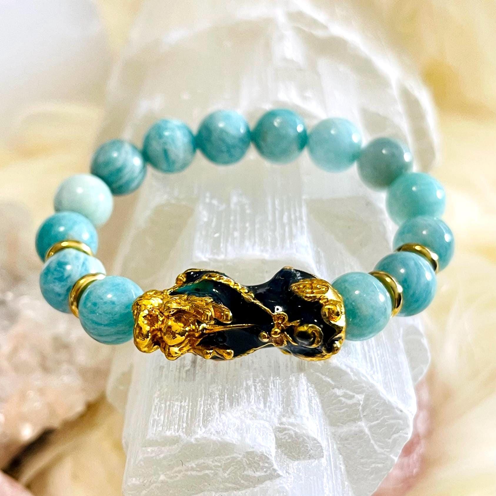 Invite calm confidence, clear communication, and protected prosperity with our Amazonite Dragon Pixiu Bracelet—a standout piece of feng shui wealth jewelry designed to attract money luck while keeping your energy balanced and focused. With its beautiful blue-green tone, Amazonite is loved as a crystal for soothing stress, emotional harmony, and truth. Wearing an Amazonite crystal bracelet is believed to quiet overthinking, ease tension, and help you express yourself with calm clarity—perfect for busy workdays, important conversations, and new beginnings.