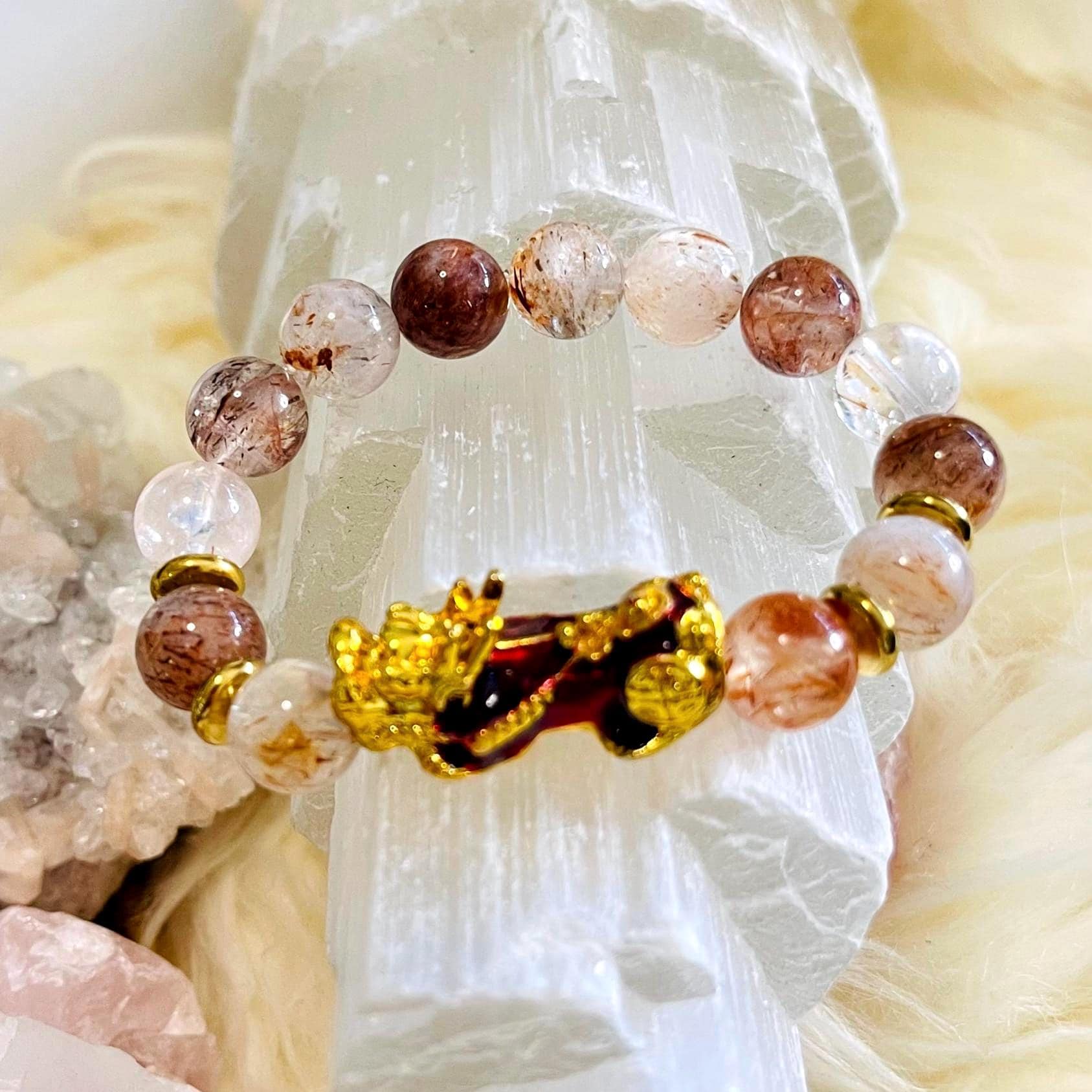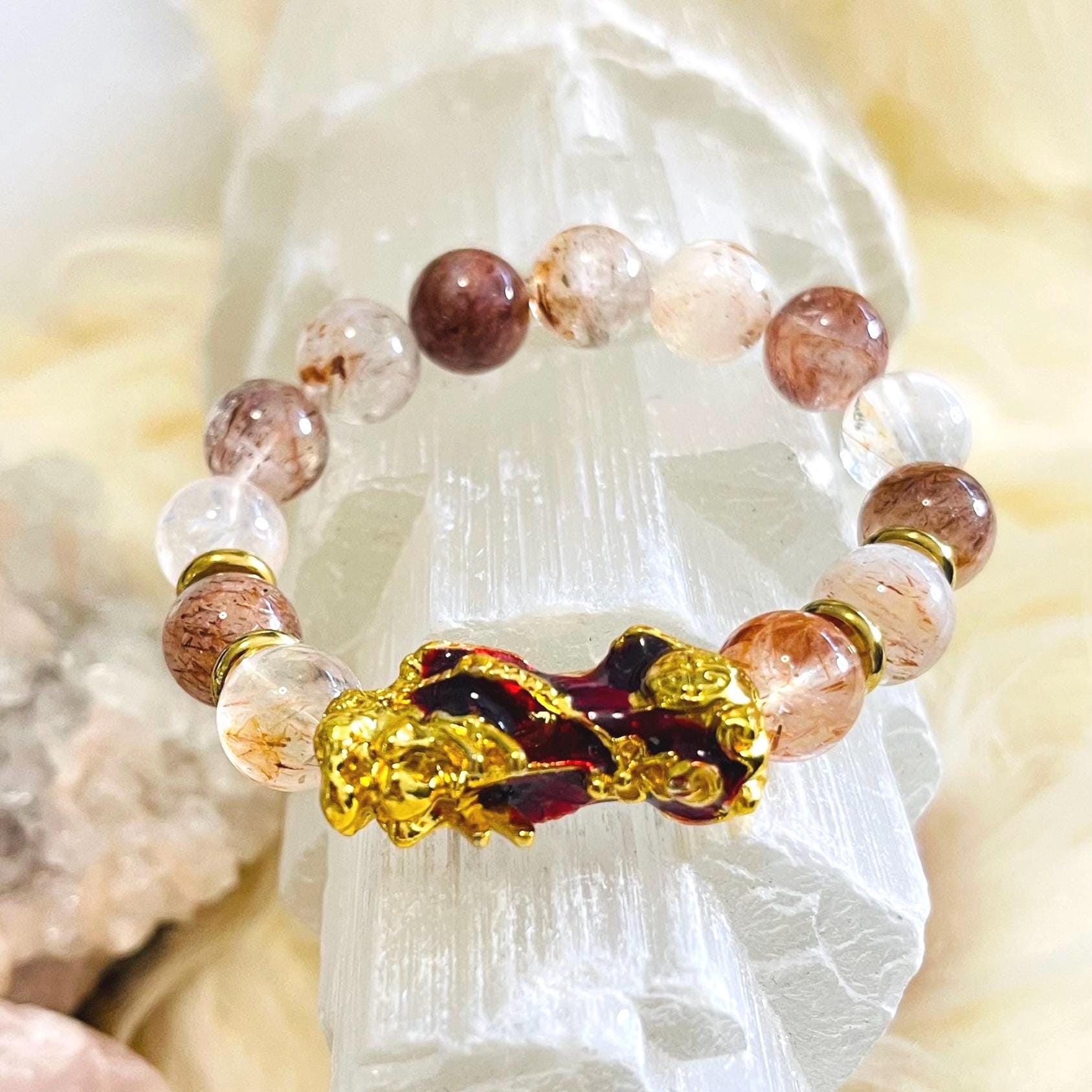 Golden Super Seven bracelet, Super Seven crystal bracelet, Pixiu bracelet, dragon Pixiu bracelet, feng shui bracelet, wealth bracelet, money luck bracelet, protection bracelet, prosperity bracelet, manifestation jewelry, beaded gemstone bracelet, unisex crystal bracelet.