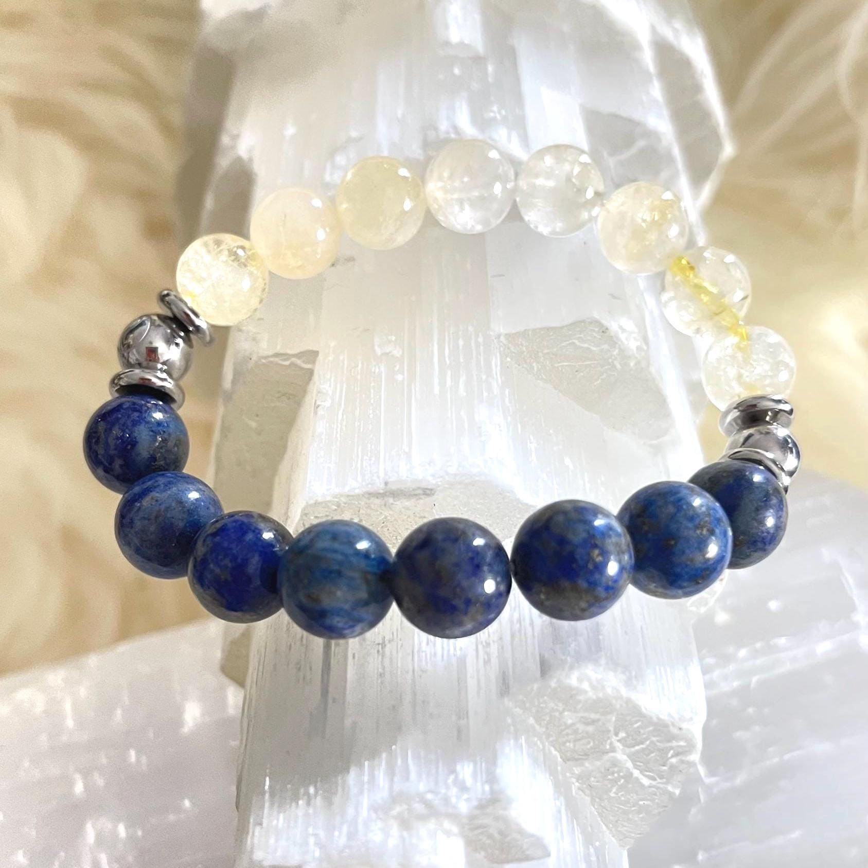 Citrine, often called the stone of abundance and positivity, is associated with joy, creativity, and manifestation. It is believed to attract success, encourage motivation, and uplift energy, balancing beautifully with the grounding qualities of lapis lazuli.