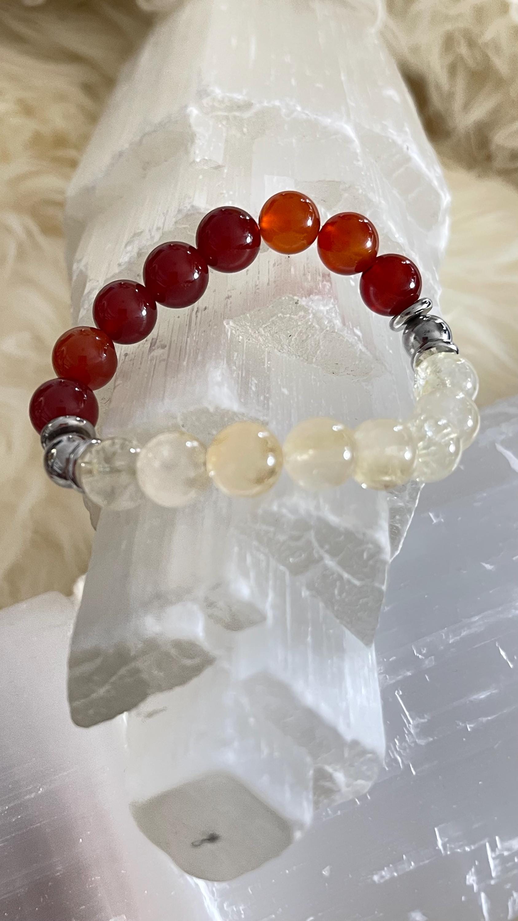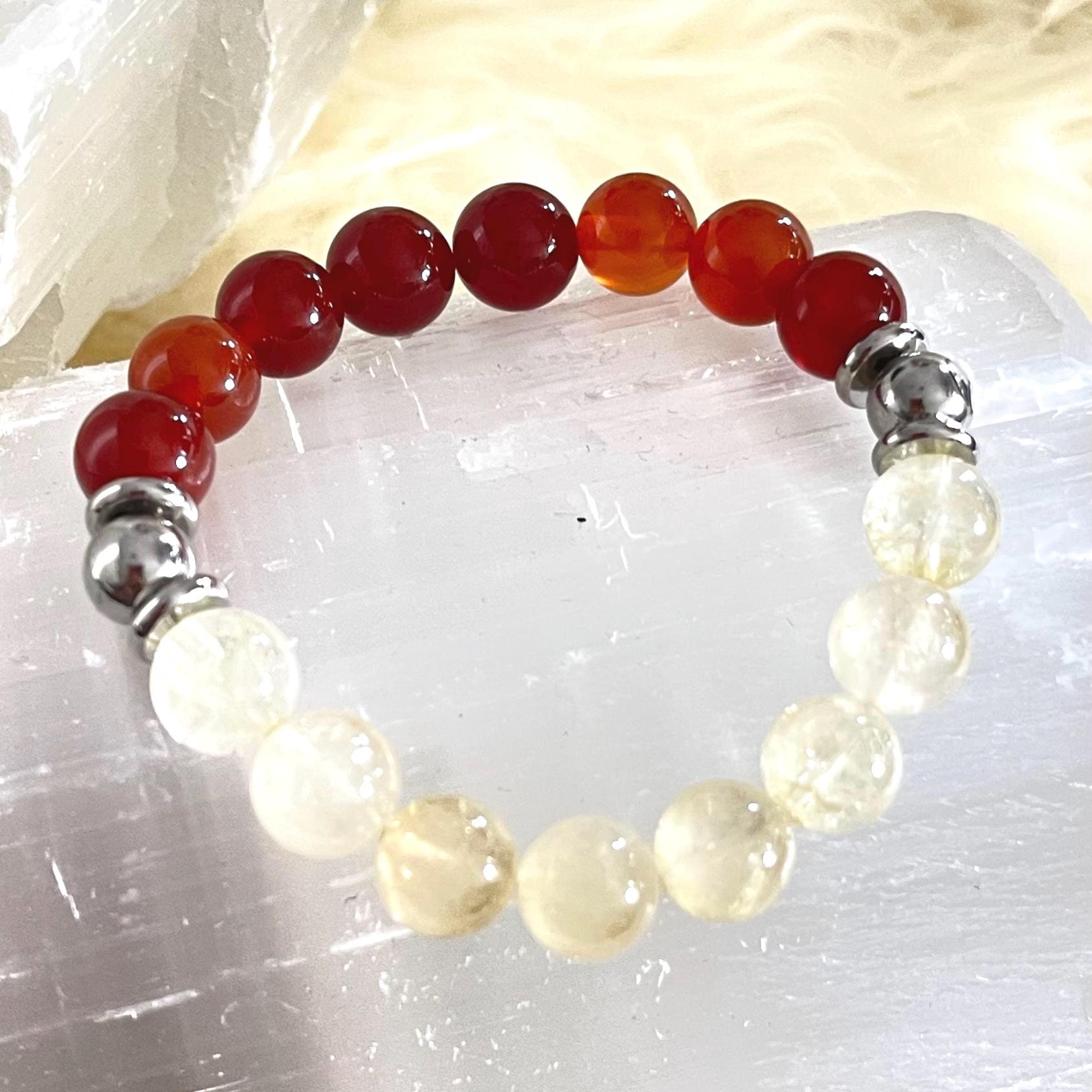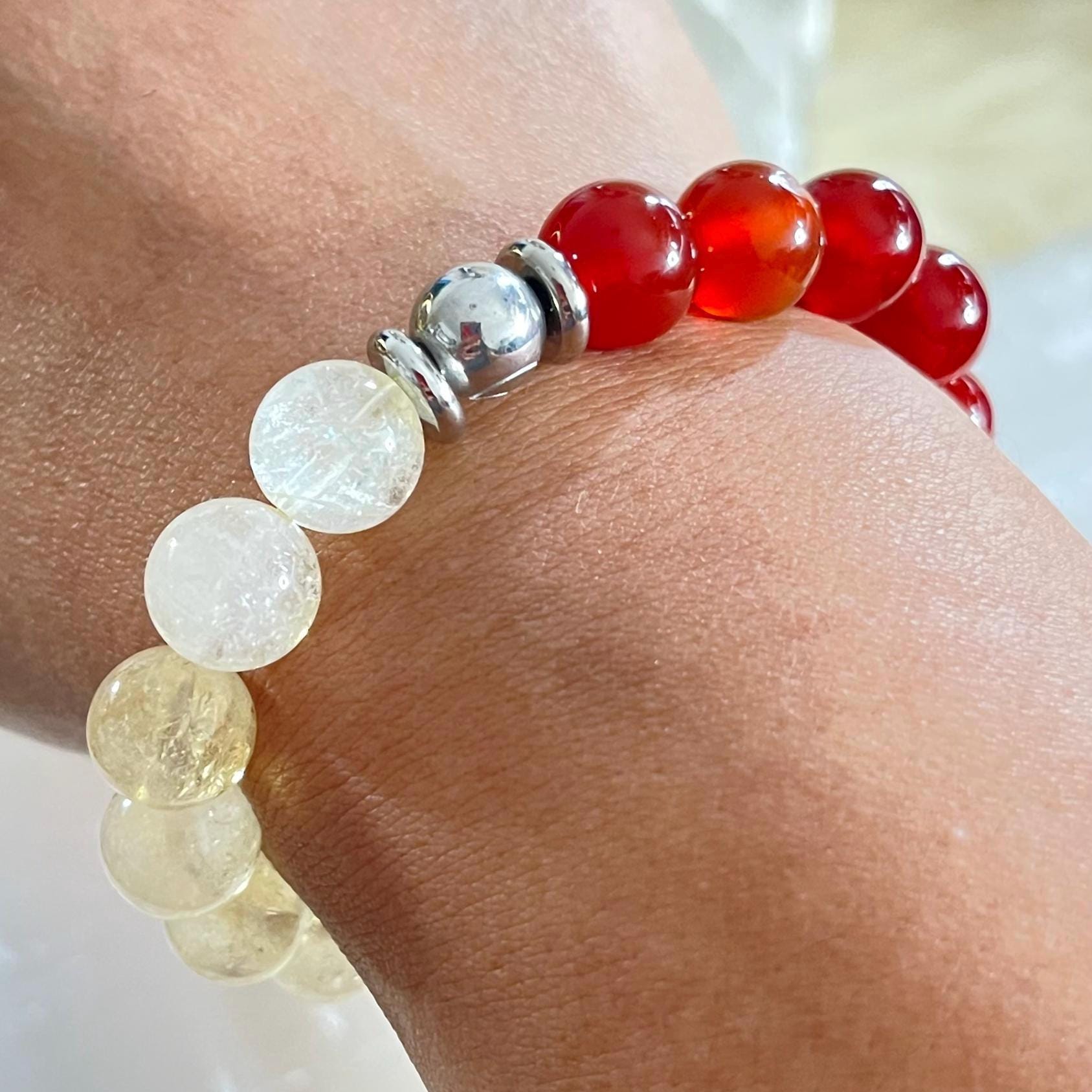 Citrine, often called the stone of abundance and positivity, is believed to attract success, prosperity, and joy. It supports motivation, creativity, and clarity while helping to clear negative energy. Together, carnelian and citrine create a powerful combination for confidence, drive, and manifestation.