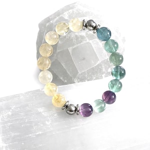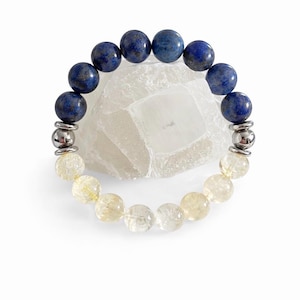 This bracelet is made with 10mm natural crystal beads, selected for their rich color and quality. It is strung on a strong elastic cord for comfort and ease of wear, allowing the bracelet to slip on effortlessly without clasps. Sleek stainless steel accent beads add a modern, polished finish while offering durability and tarnish resistance.