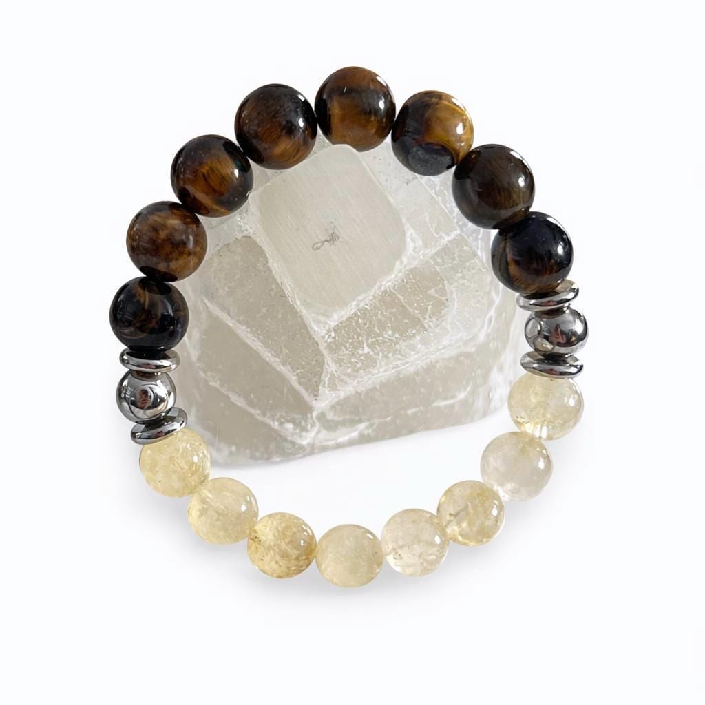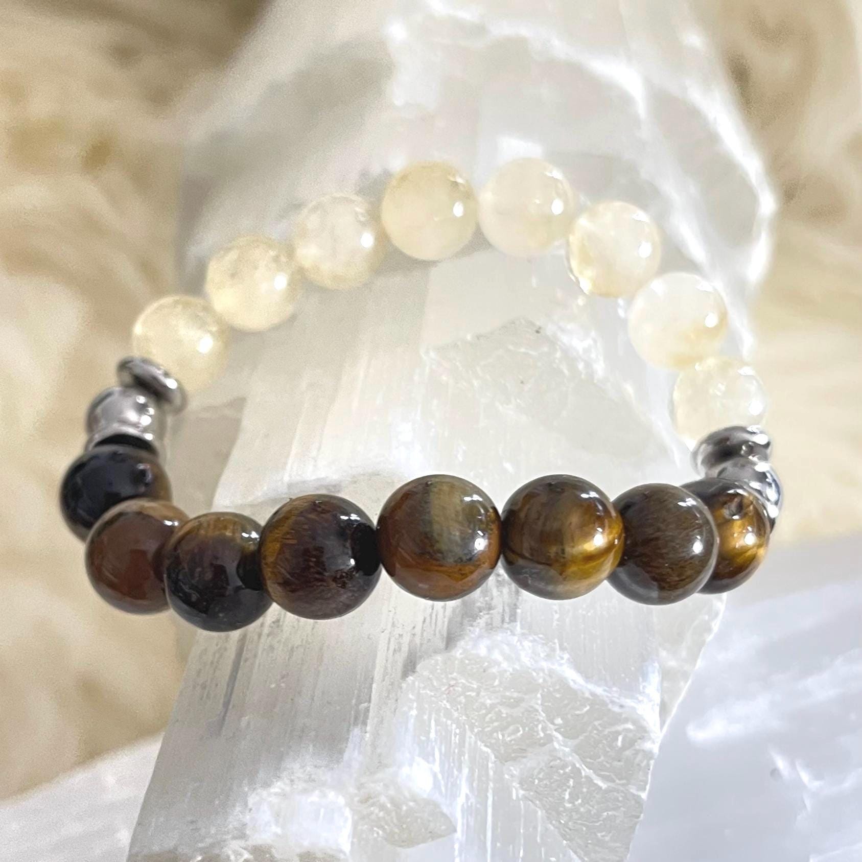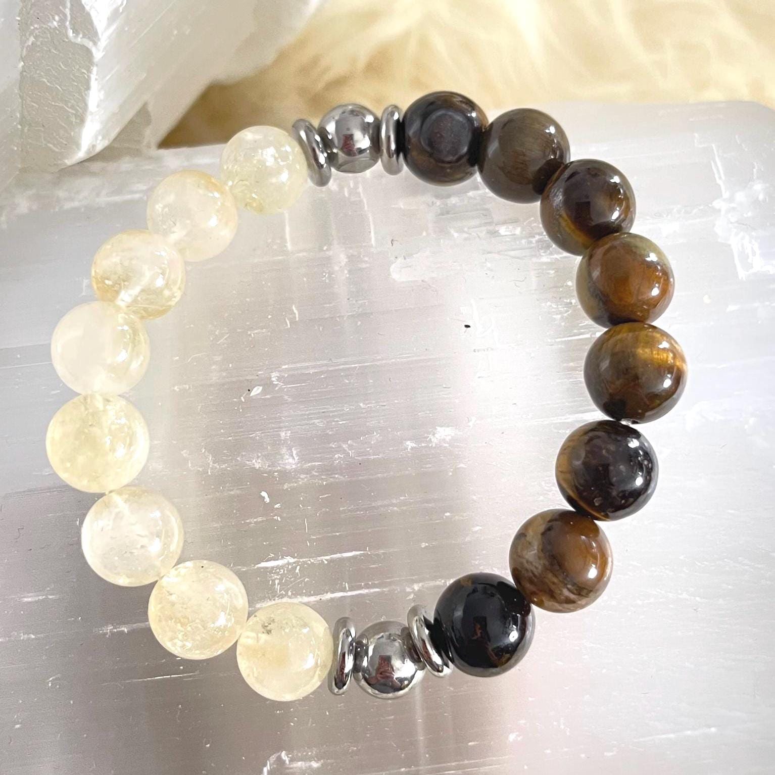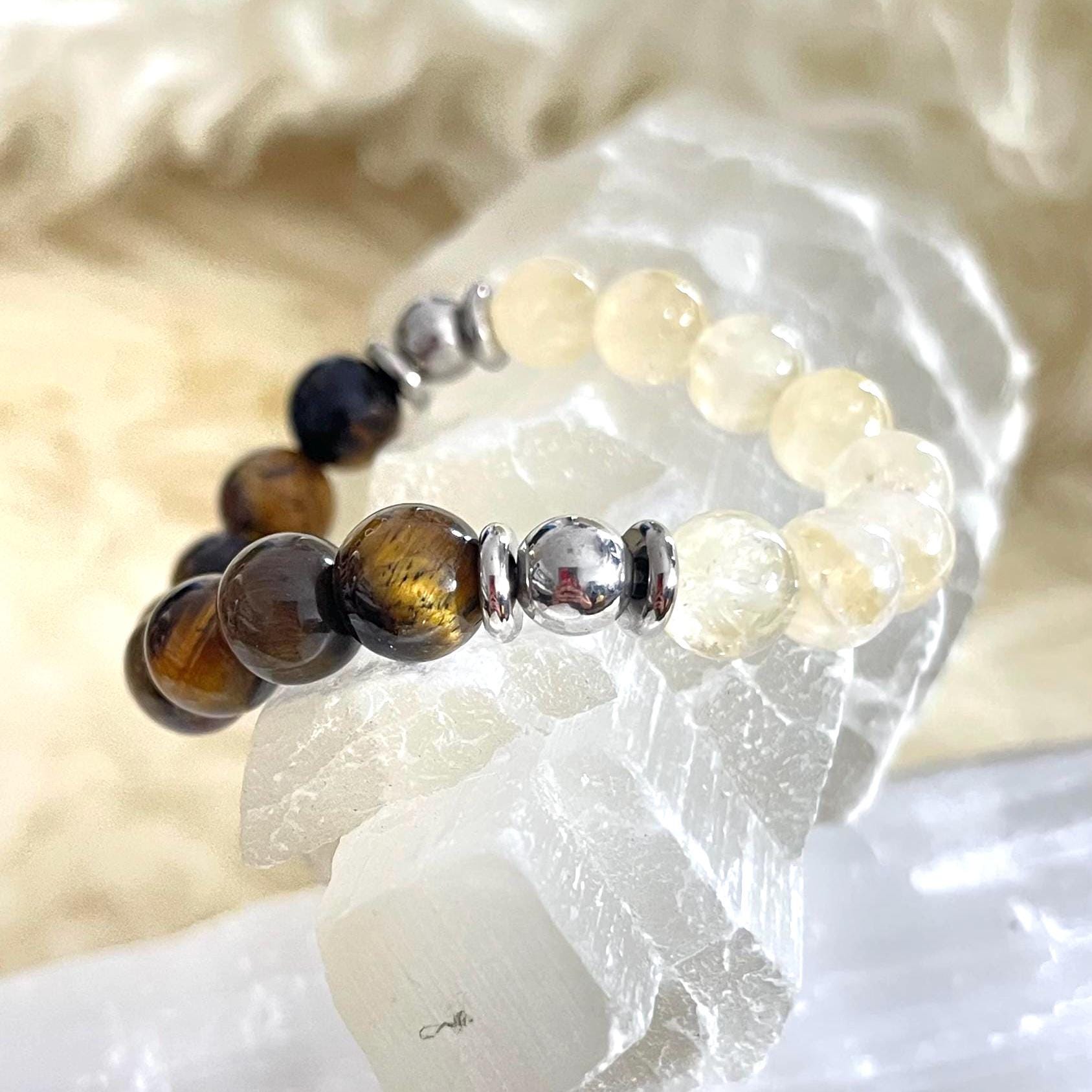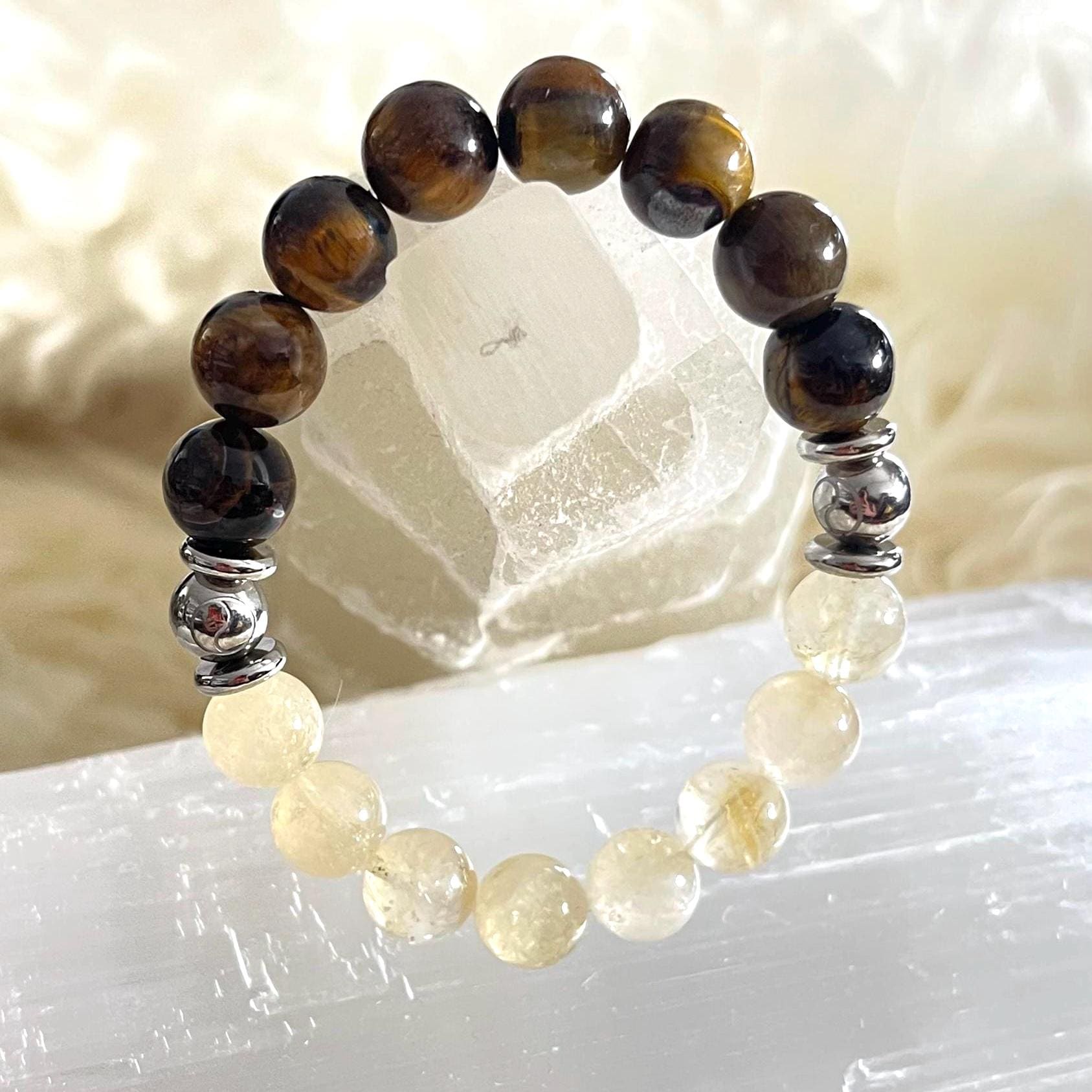Citrine, commonly referred to as the stone of abundance and positivity, is believed to attract success, prosperity, and joy. Its uplifting energy encourages motivation, creativity, and a positive mindset while helping to clear negative energy. Together, tiger eye and citrine create a powerful combination for confidence, manifestation, and success.