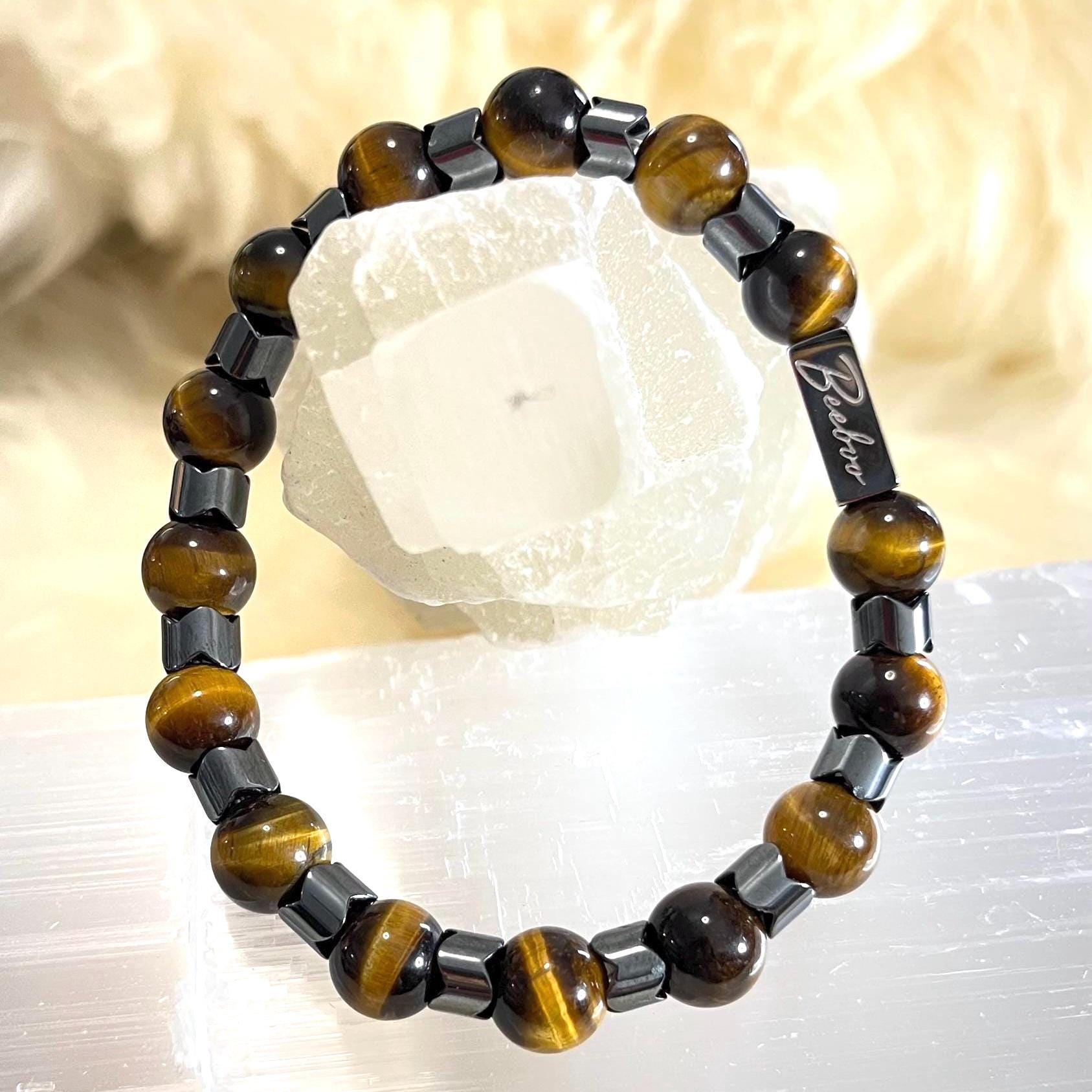Elevate your everyday style with this Tiger Eye & Hematite Men’s Bracelet—a bold, modern piece designed for confidence, balance, and timeless appeal. Handcrafted with smooth 10mm Tiger Eye and Hematite beads, this bracelet blends rich golden-brown shimmer with sleek metallic tones for a powerful, masculine look. It’s made with a strong elastic cord for a comfortable slip-on fit and finished with stainless steel, non-tarnish metal accents for a clean, durable finish. Each bracelet arrives in an elegant gift box, ready for gifting.