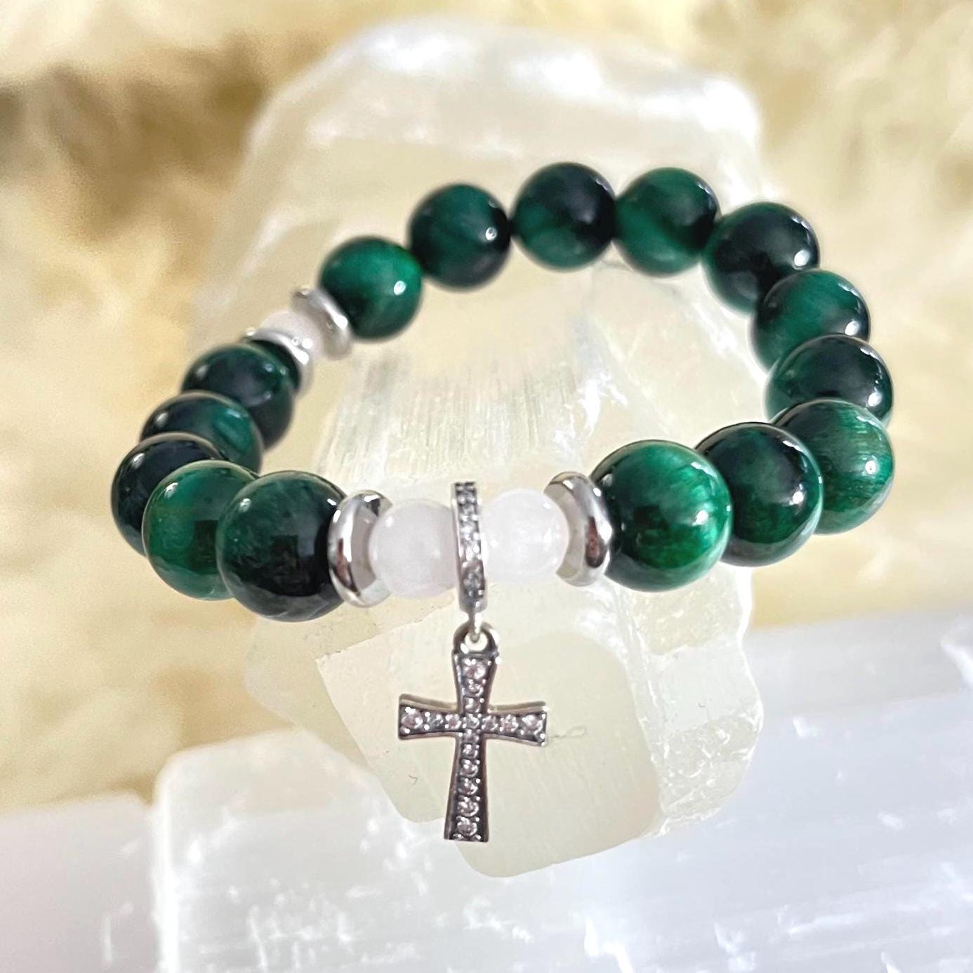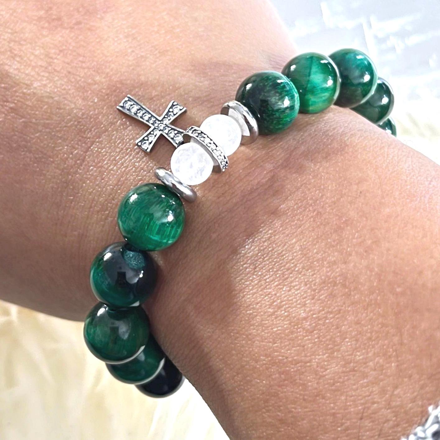 Carry faith and strength with this Green Tiger Eye Rosary Collection Bracelet, handcrafted with smooth 10mm Green Tiger Eye beads and finished with elegant 925 sterling silver accents. Designed to be meaningful yet easy to wear, this bracelet is strung on a durable elastic cord for a comfortable slip-on fit—perfect for daily wear, prayer, or special occasions. Each piece arrives in an elegant gift box, making it a beautiful, ready-to-gift keepsake.