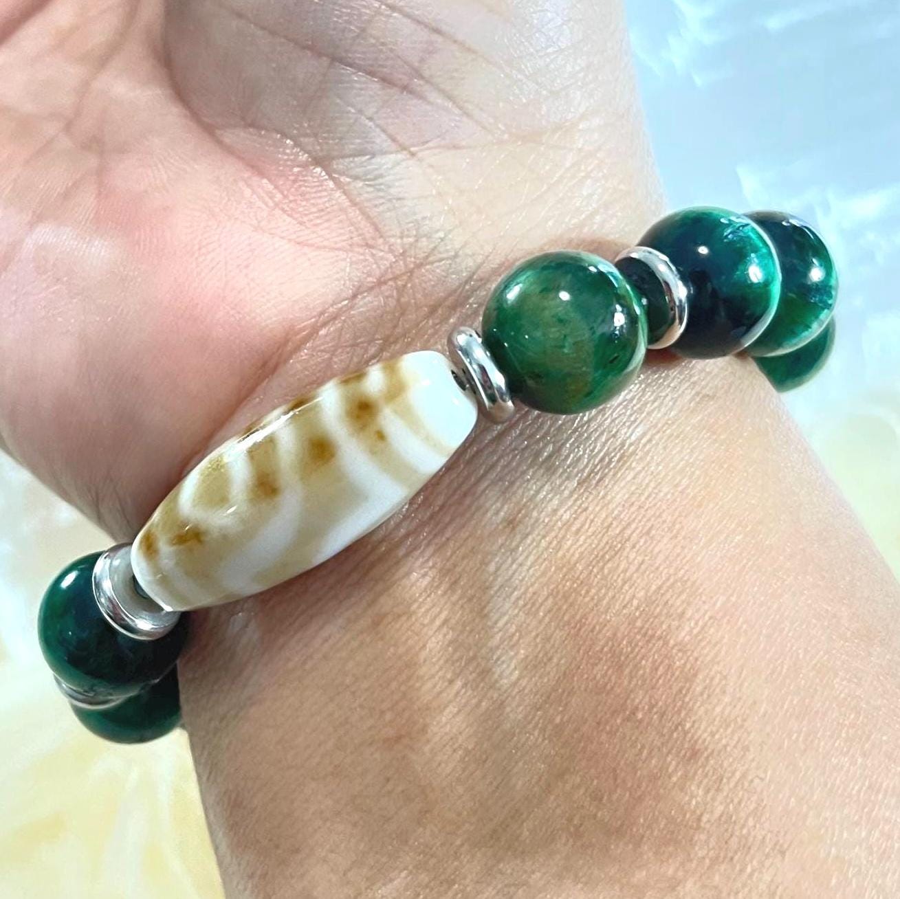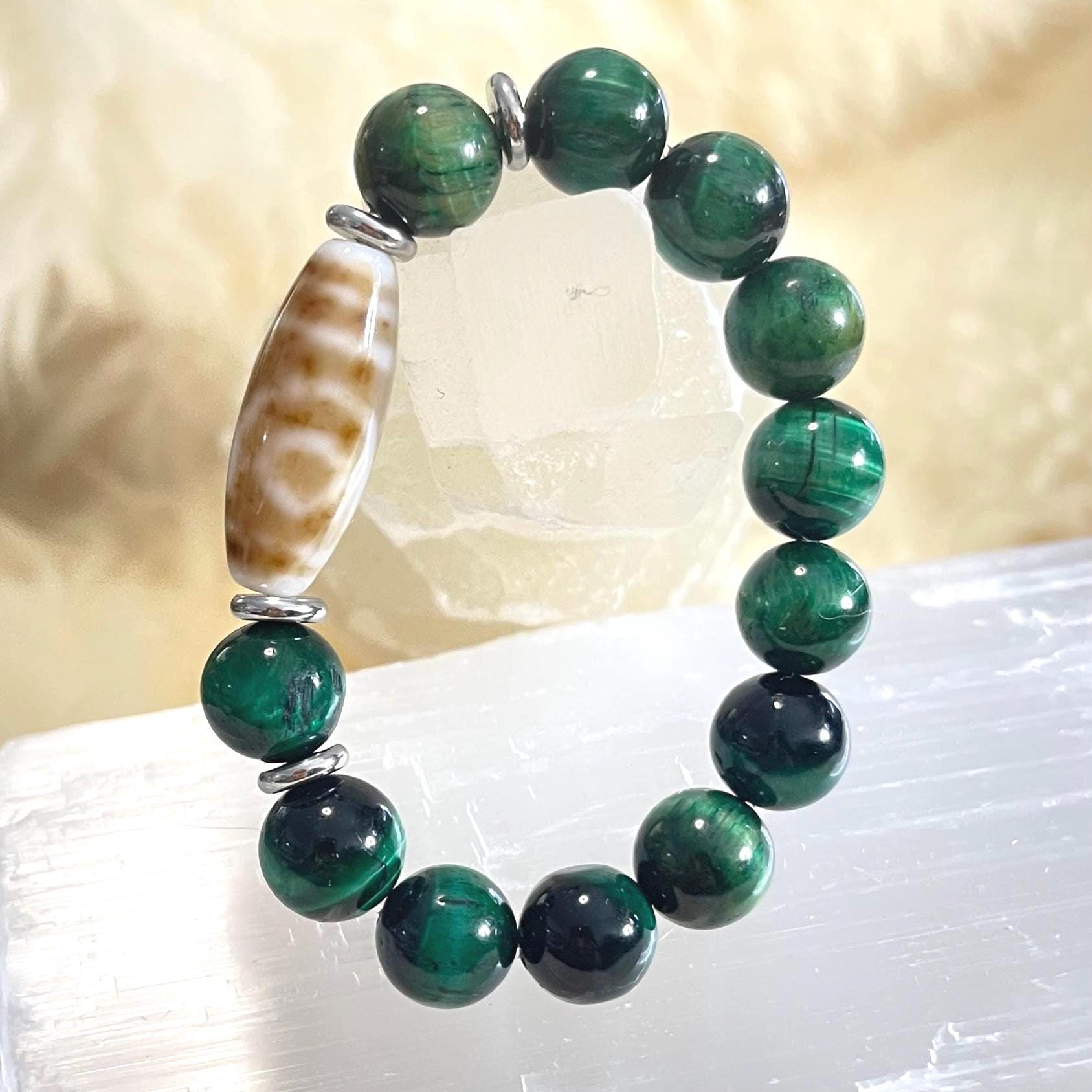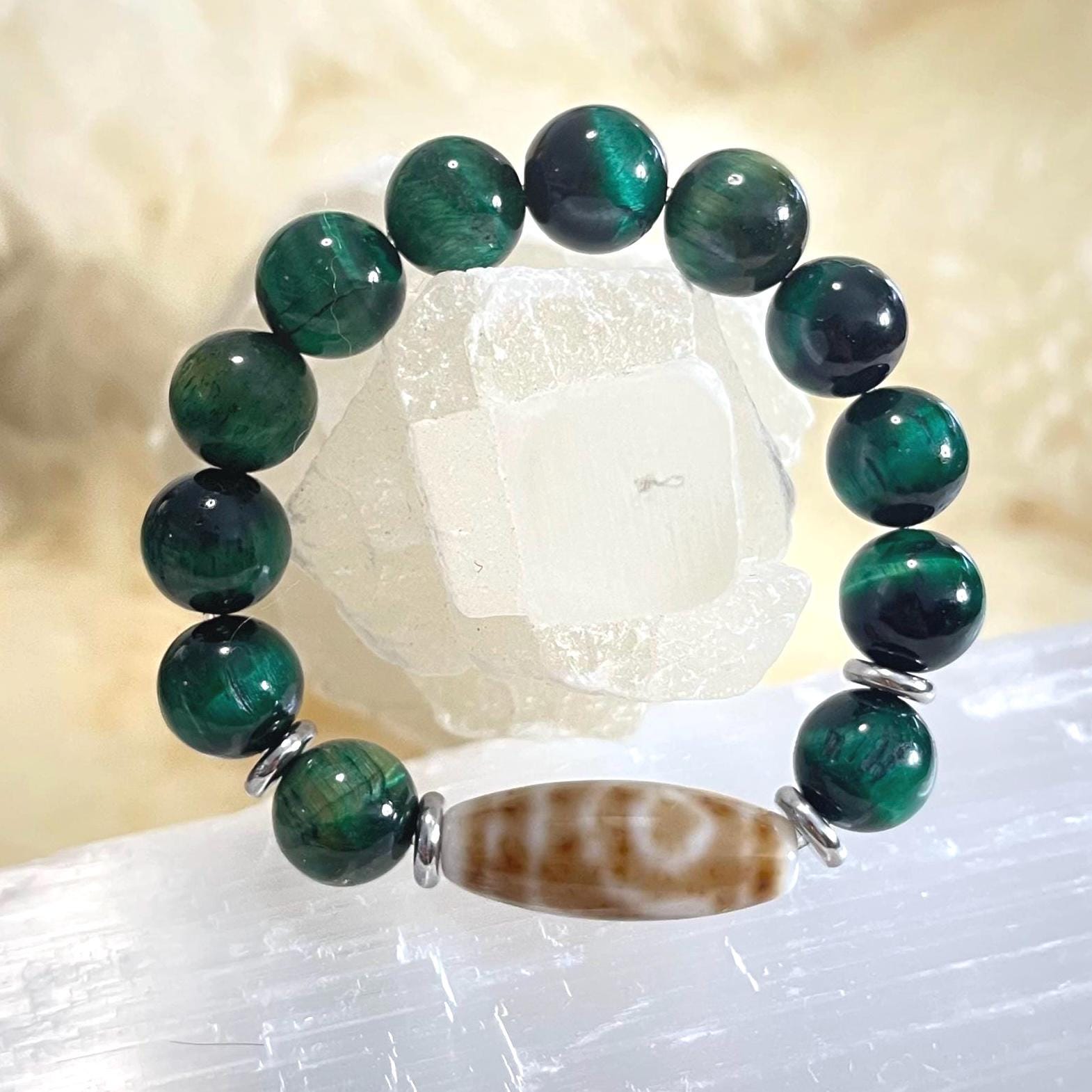 Bold color, strong symbolism, and everyday comfort—this handcrafted unisex stretch bracelet pairs Dzi Amulet Agate with 12mm Green Tiger Eye for a look that’s both powerful and polished. Finished with sleek stainless steel accents and strung on a durable elastic cord, it’s designed to be worn daily as a reminder of protection, focus, and steady growth.