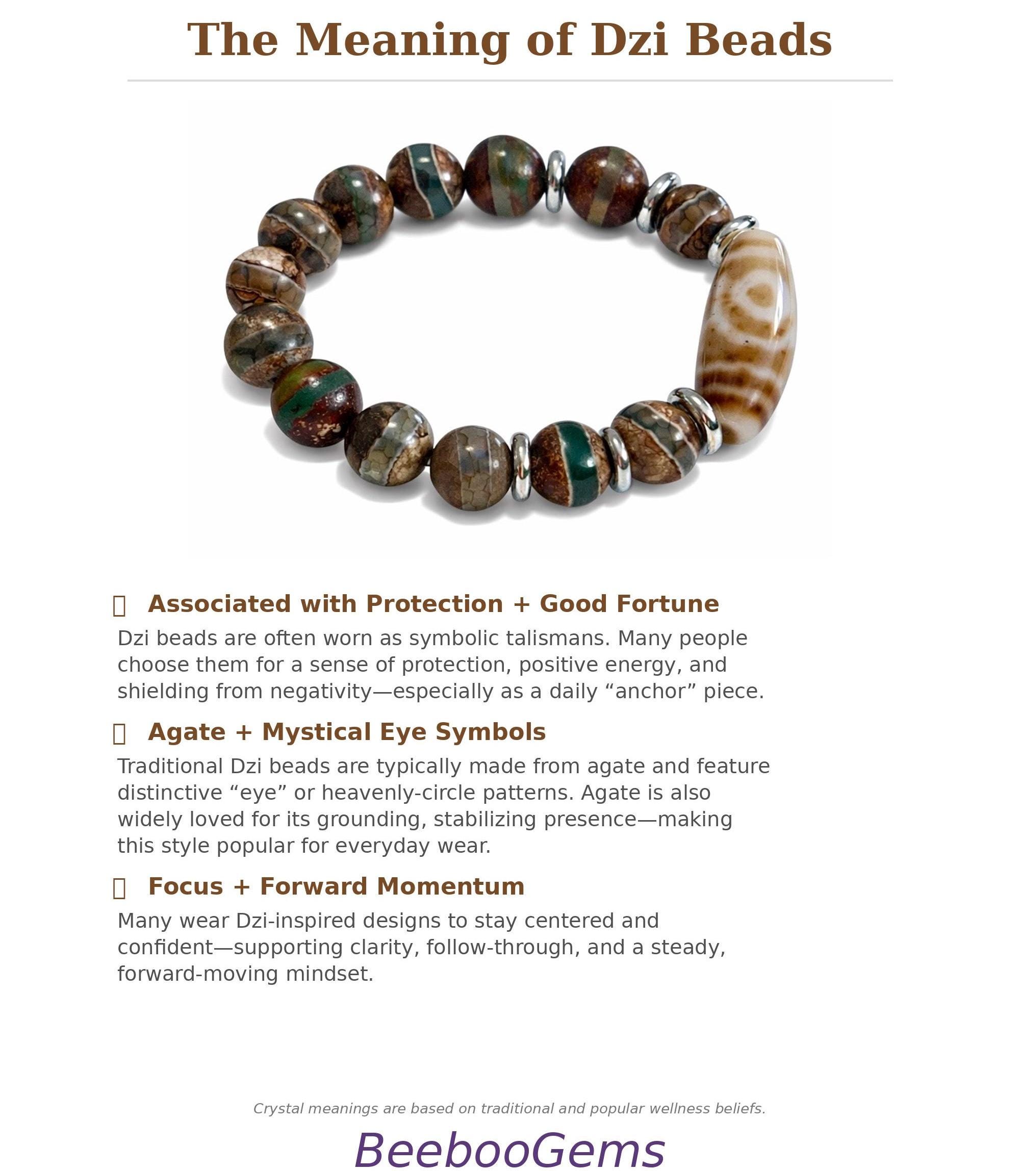 Dzi-inspired beads are traditionally associated with protection and shielding from negativity. Agate is also widely loved for its grounding presence. Together, they create a strong talisman-style feel for everyday wear.