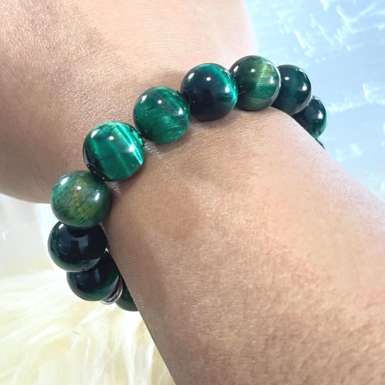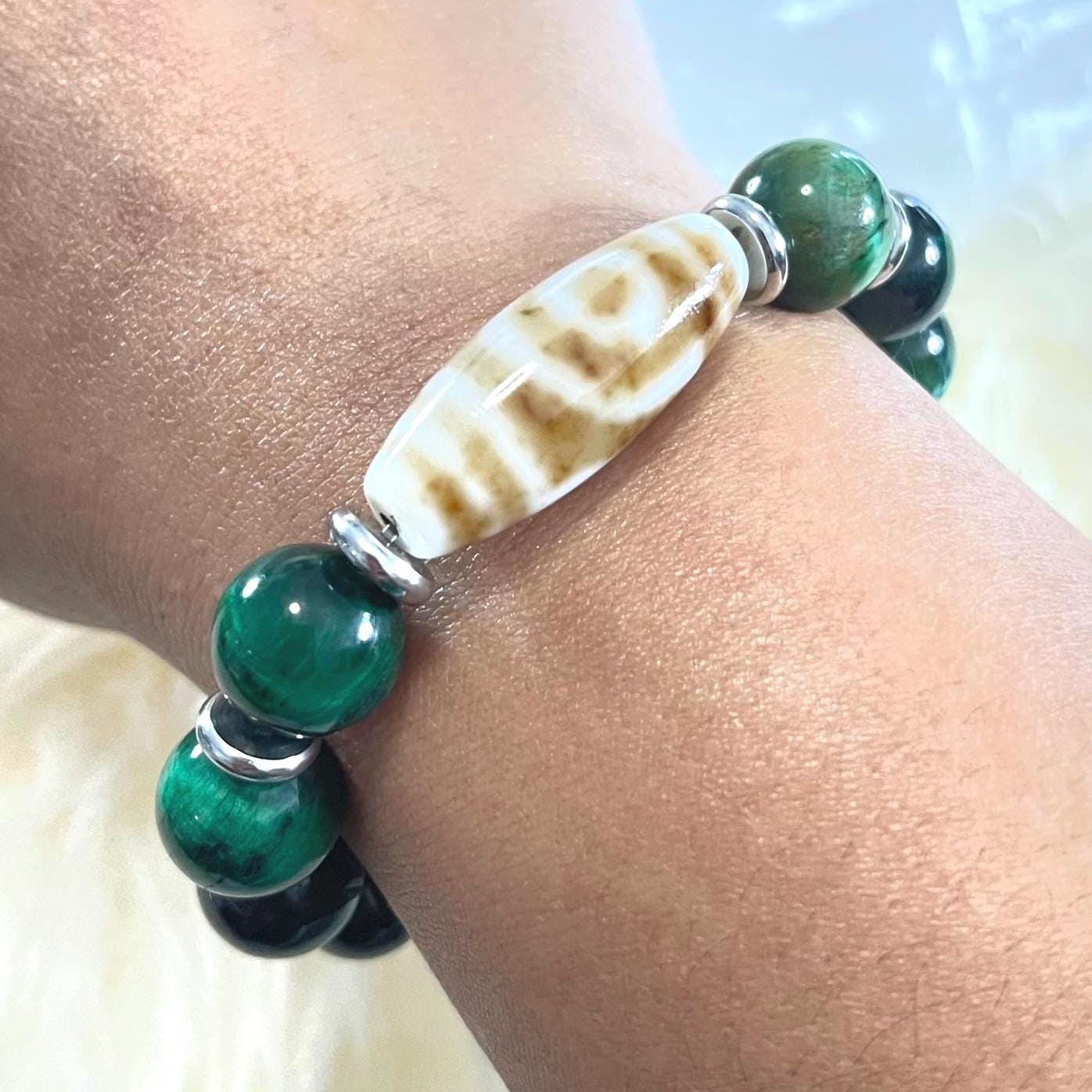 Paired with it is 12mm Green Tiger Eye, known for its mesmerizing shimmer and rich green tones that shift in the light. The 12mm bead size adds a confident presence on the wrist—noticeable, premium, and perfect for those who like a bolder gemstone look. Green Tiger Eye brings a fresh, grounded feel that pairs beautifully with the earthy patterns of Dzi agate.