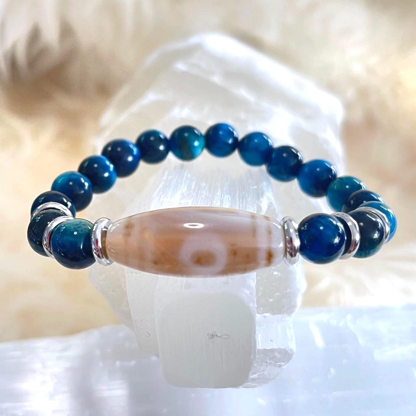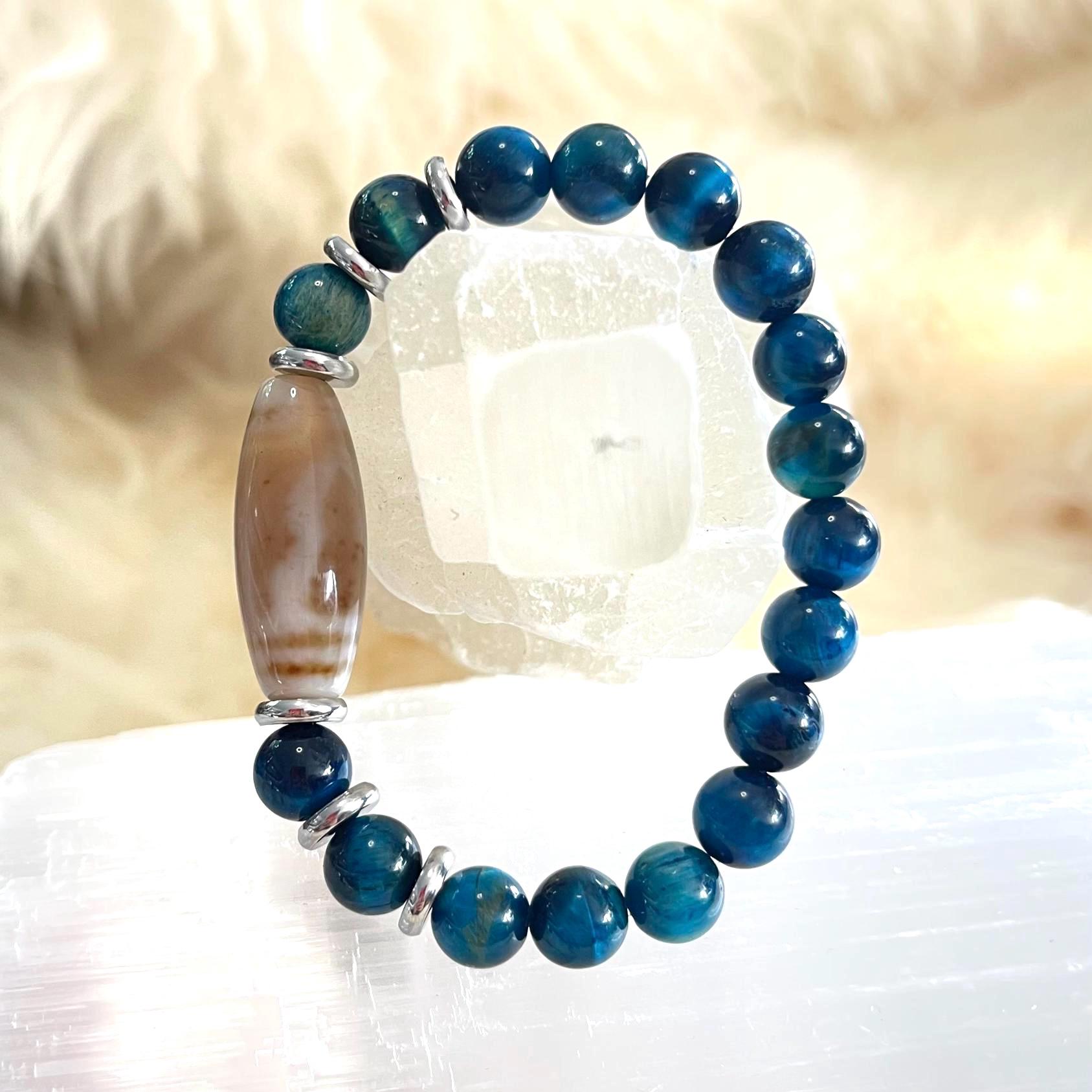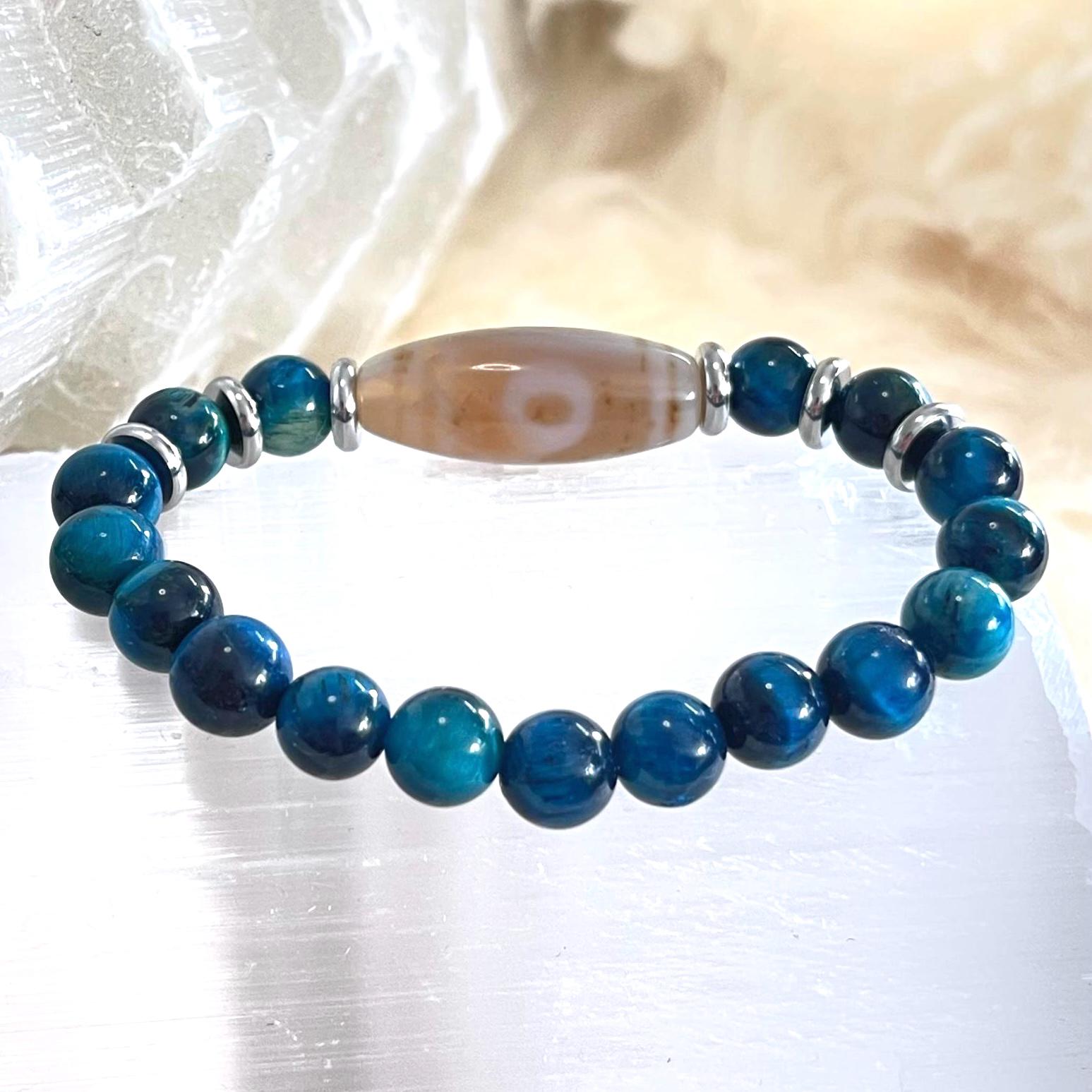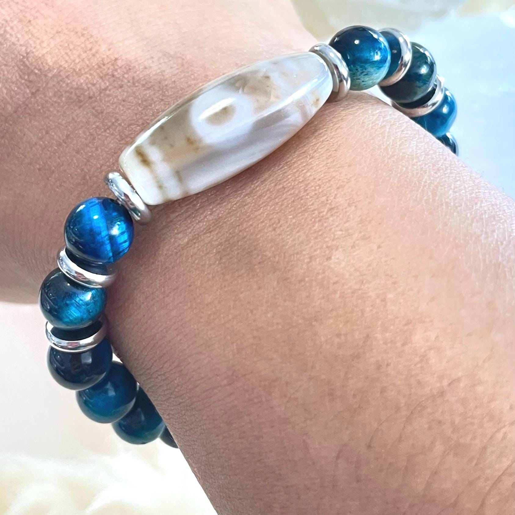 Cool-toned, calm, and confidently protective—this handcrafted unisex stretch bracelet pairs Dzi Amulet Agate with 8mm Blue Tiger Eye for a look that’s sleek, meaningful, and easy to wear every day. Finished with modern stainless steel accents and strung on a strong elastic cord, it’s built for comfort, durability, and effortless style—solo or stacked.