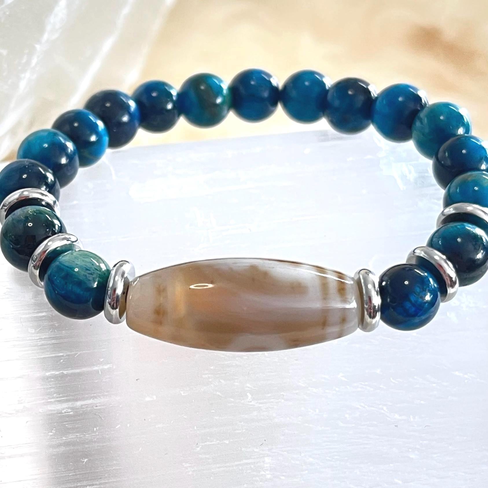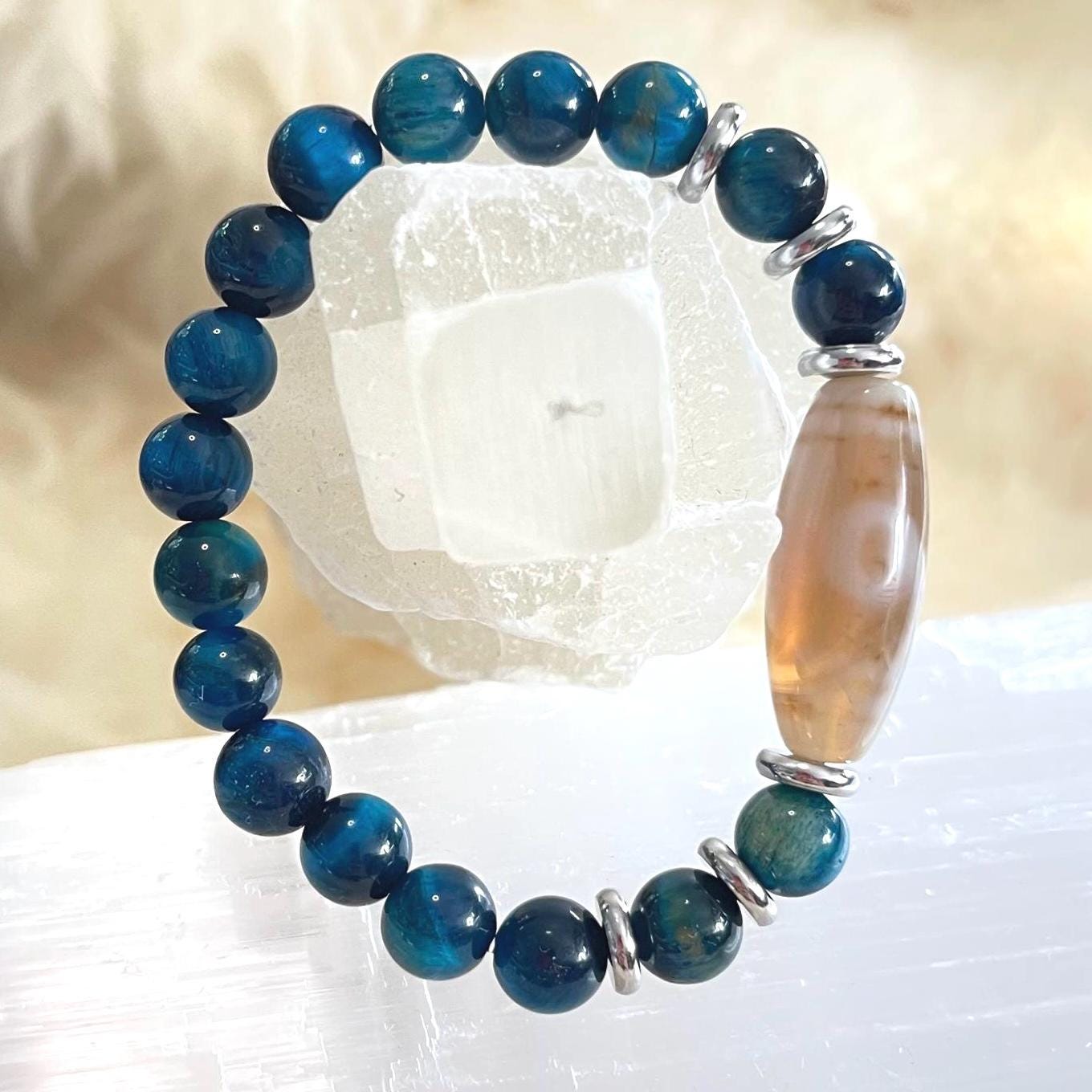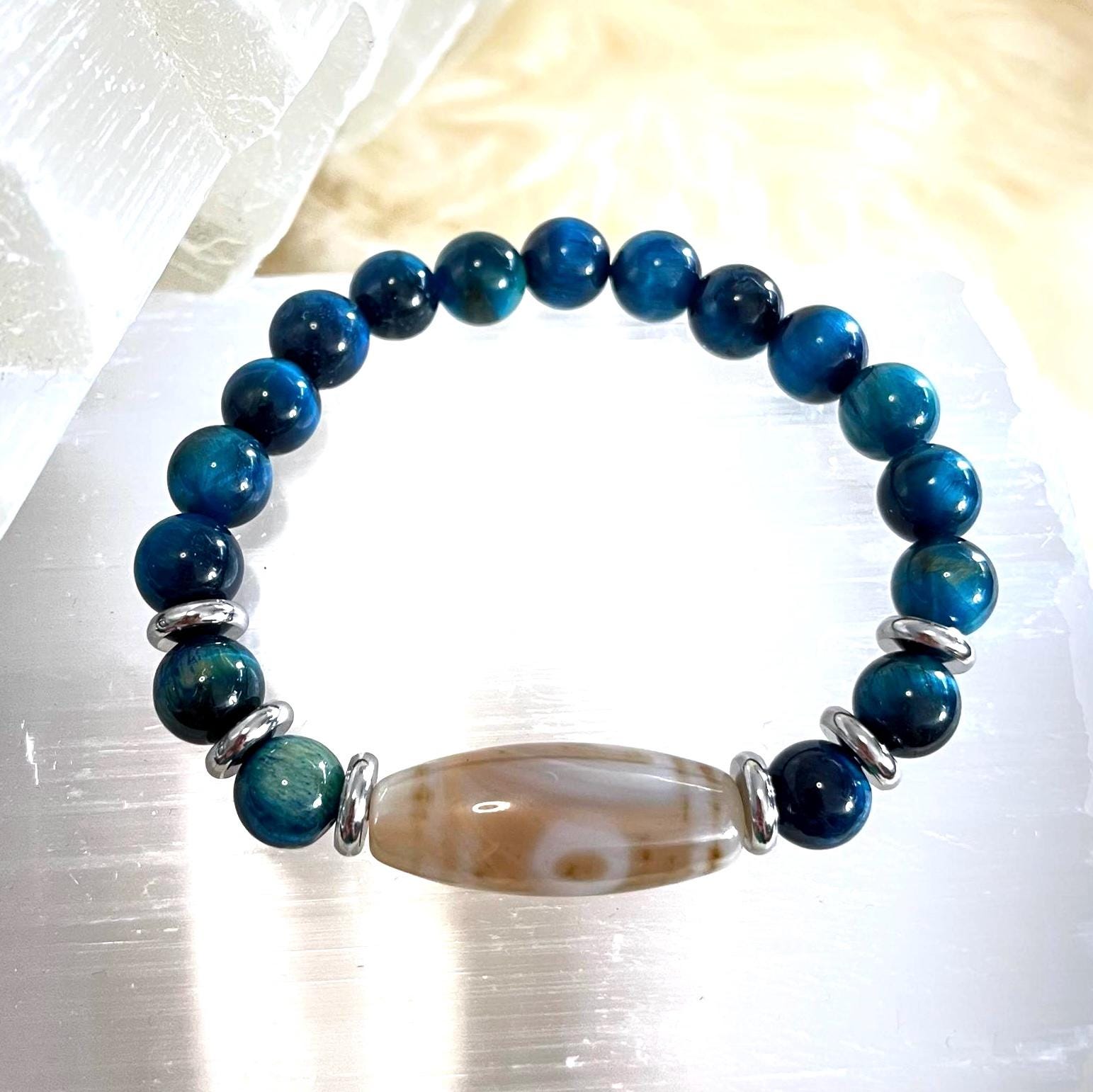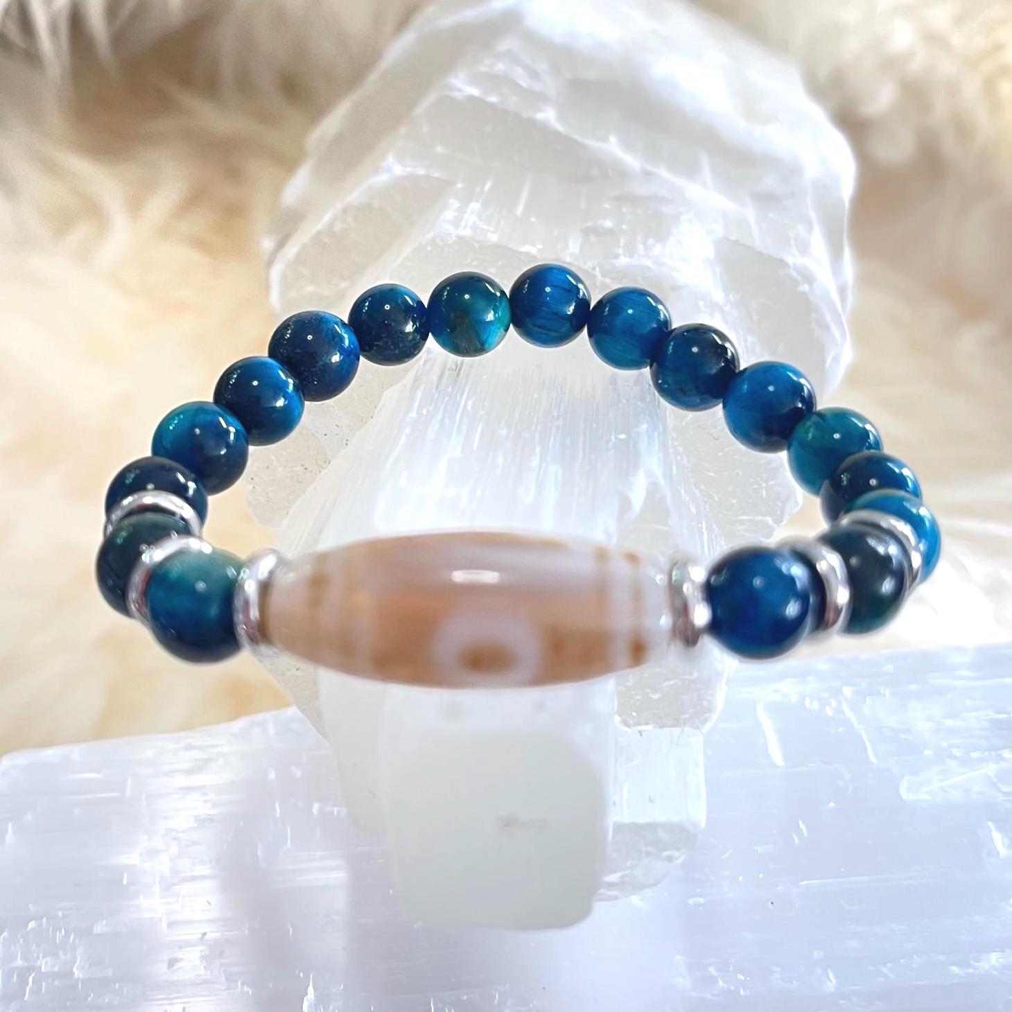 Cool-toned, calm, and confidently protective—this handcrafted unisex stretch bracelet pairs Dzi Amulet Agate with 8mm Blue Tiger Eye for a look that’s sleek, meaningful, and easy to wear every day. Finished with modern stainless steel accents and strung on a strong elastic cord, it’s built for comfort, durability, and effortless style—solo or stacked.