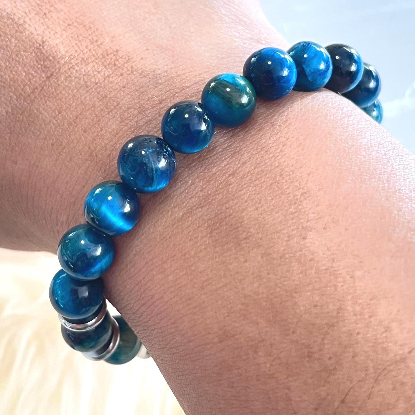 Paired with it is 8mm Blue Tiger Eye, admired for its deep blue tones and silky “cat-eye” shimmer that shifts in the light. The 8mm bead size keeps the look refined and versatile—perfect for daily wear, minimal styling, or layering with other bracelets without feeling bulky. The cool blue glow brings a modern edge while still carrying the bold, classic Tiger Eye energy.