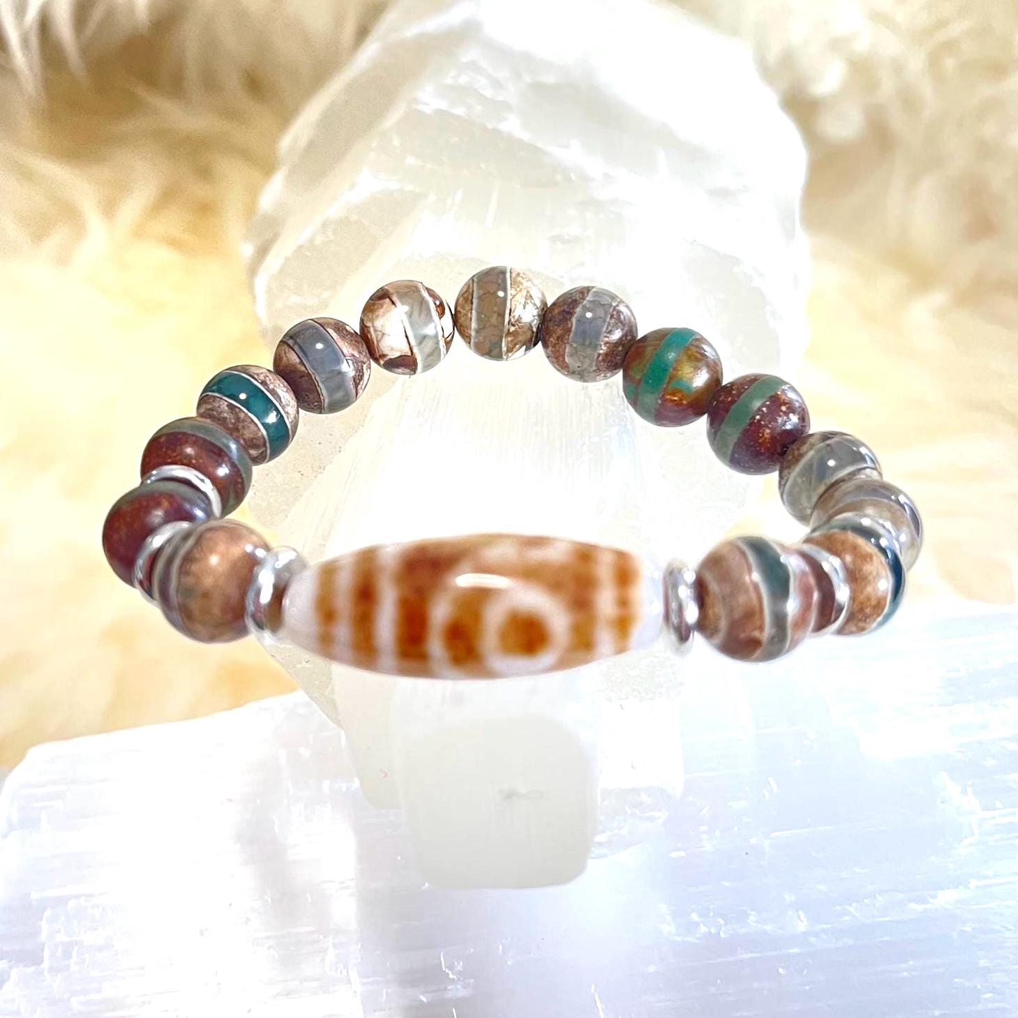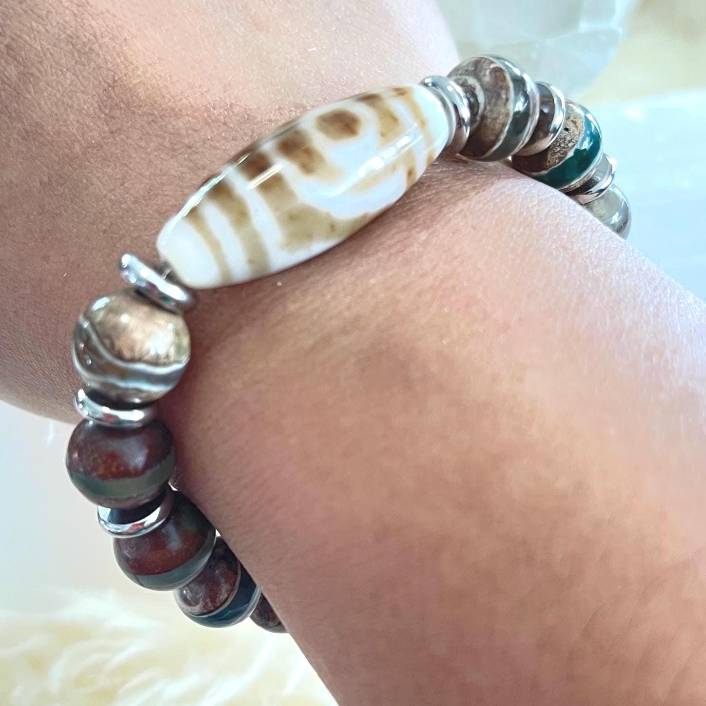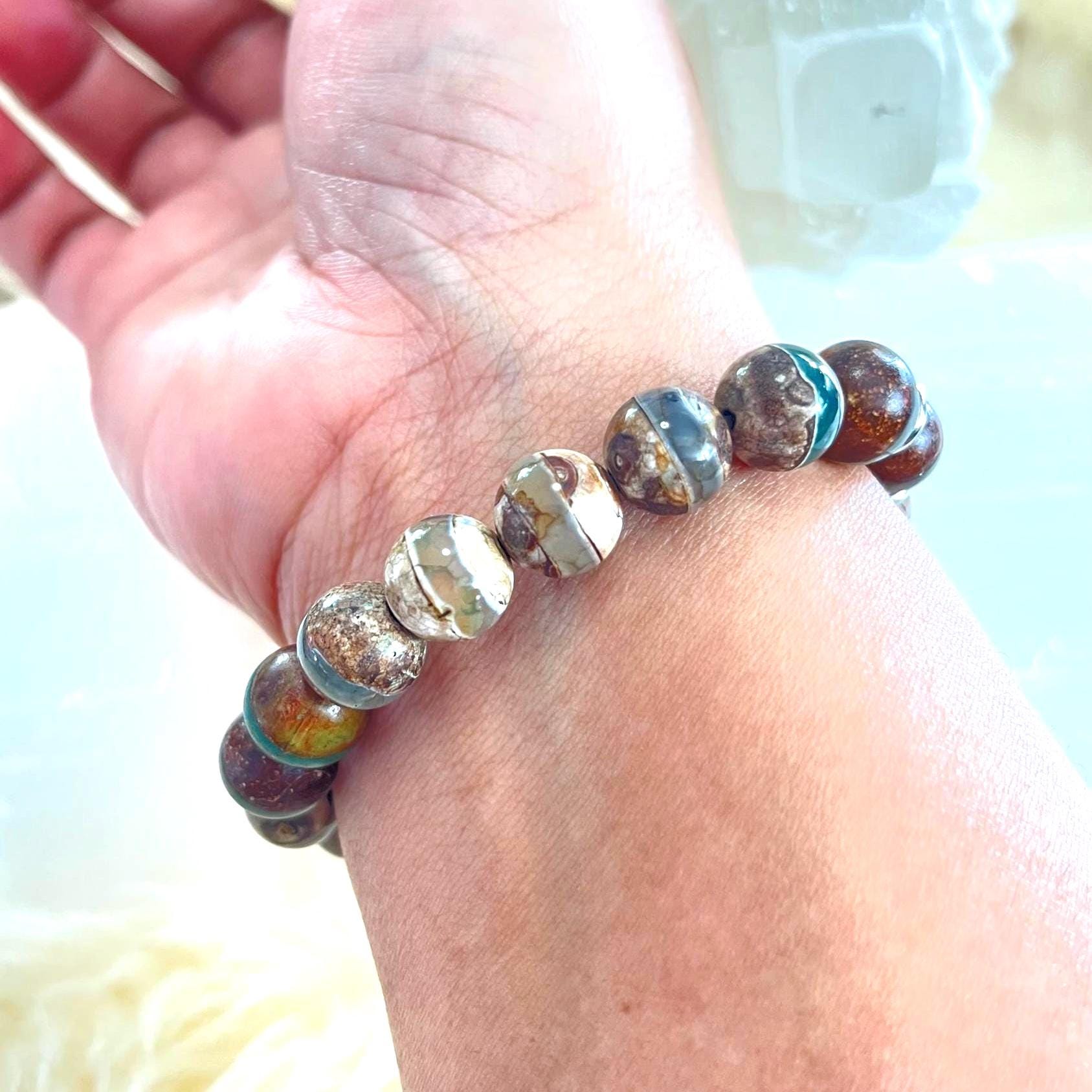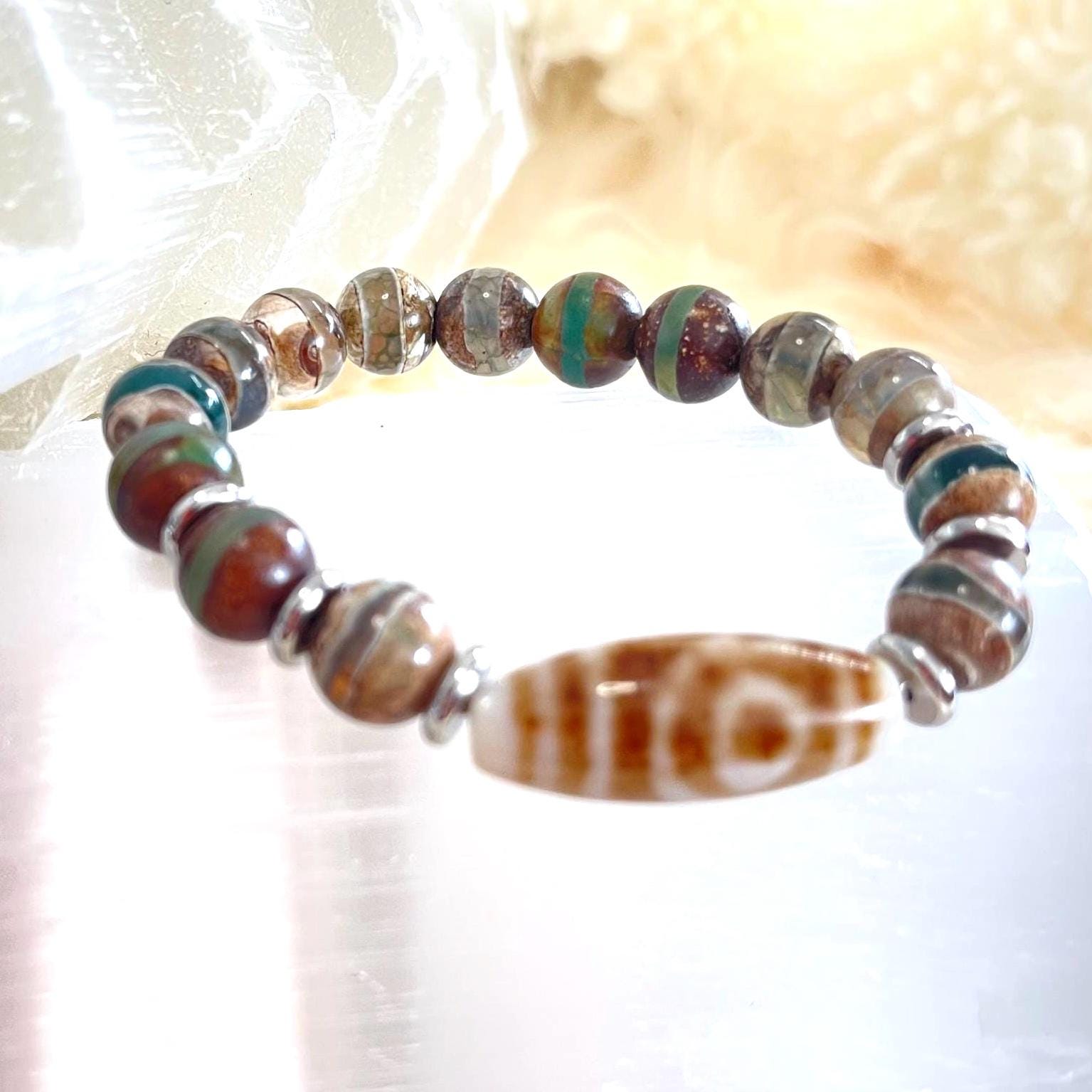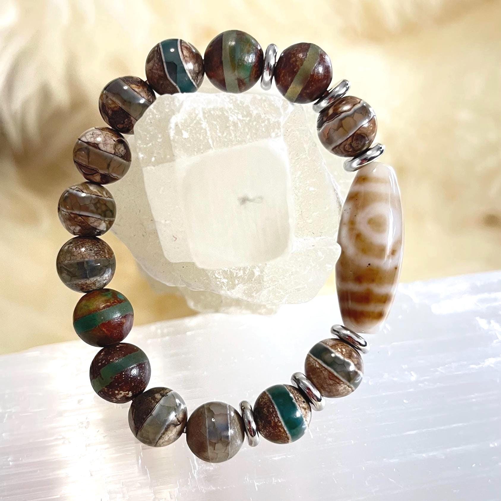 Tibetan Agate is admired for its rich, natural banding and warm, grounded color palette. Often associated with traditional amulet-style jewelry, Tibetan agate is popular among those who prefer pieces that feel both spiritual and stylish. Each bead displays unique markings and variations—no two bracelets will look exactly the same, which is part of the beauty of genuine natural stone.