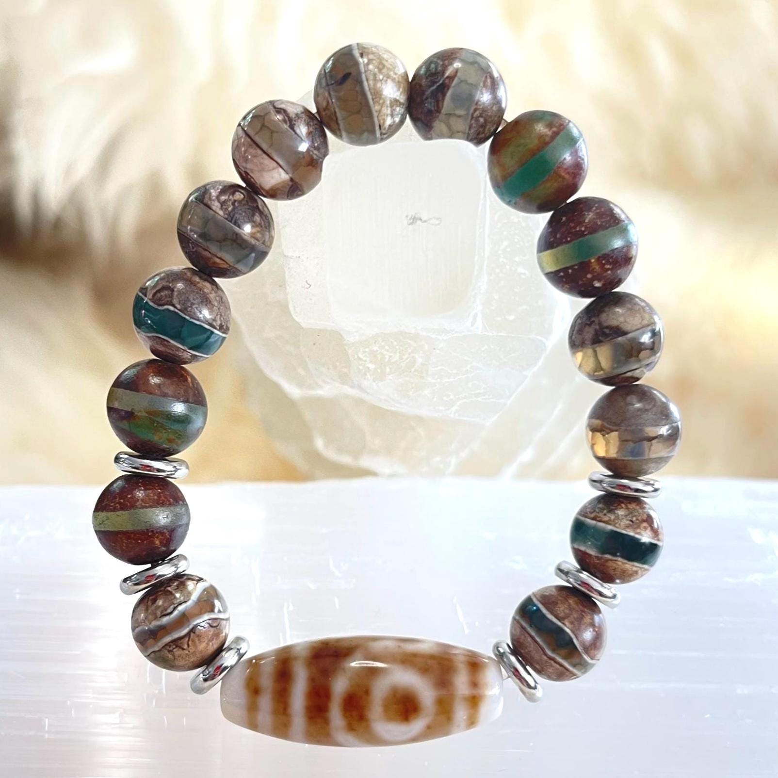 Grounded, bold, and timeless—this handcrafted unisex bracelet features 10mm Tibetan Agate beads with sleek stainless steel accents on a durable elastic cord. Tibetan agate is loved for its earthy tones and distinctive natural patterning, making each bracelet feel personal, meaningful, and one of a kind. The 10mm bead size offers the perfect balance: noticeable on the wrist without feeling oversized, ideal for everyday wear or stacking.