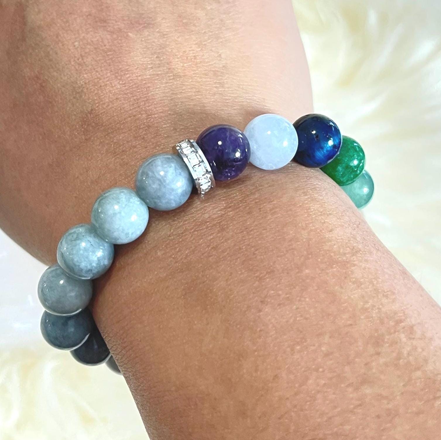This design stands out with 10mm beads, giving it a premium, statement look on the wrist. The stones are complemented by sleek stainless steel details for a modern finish, while sparkling rhinestone accents add just the right touch of elegance—catching the light beautifully without overpowering the natural gemstone beauty. It’s comfortable, practical, and stylish—perfect for daily wear, stacking, or gifting.