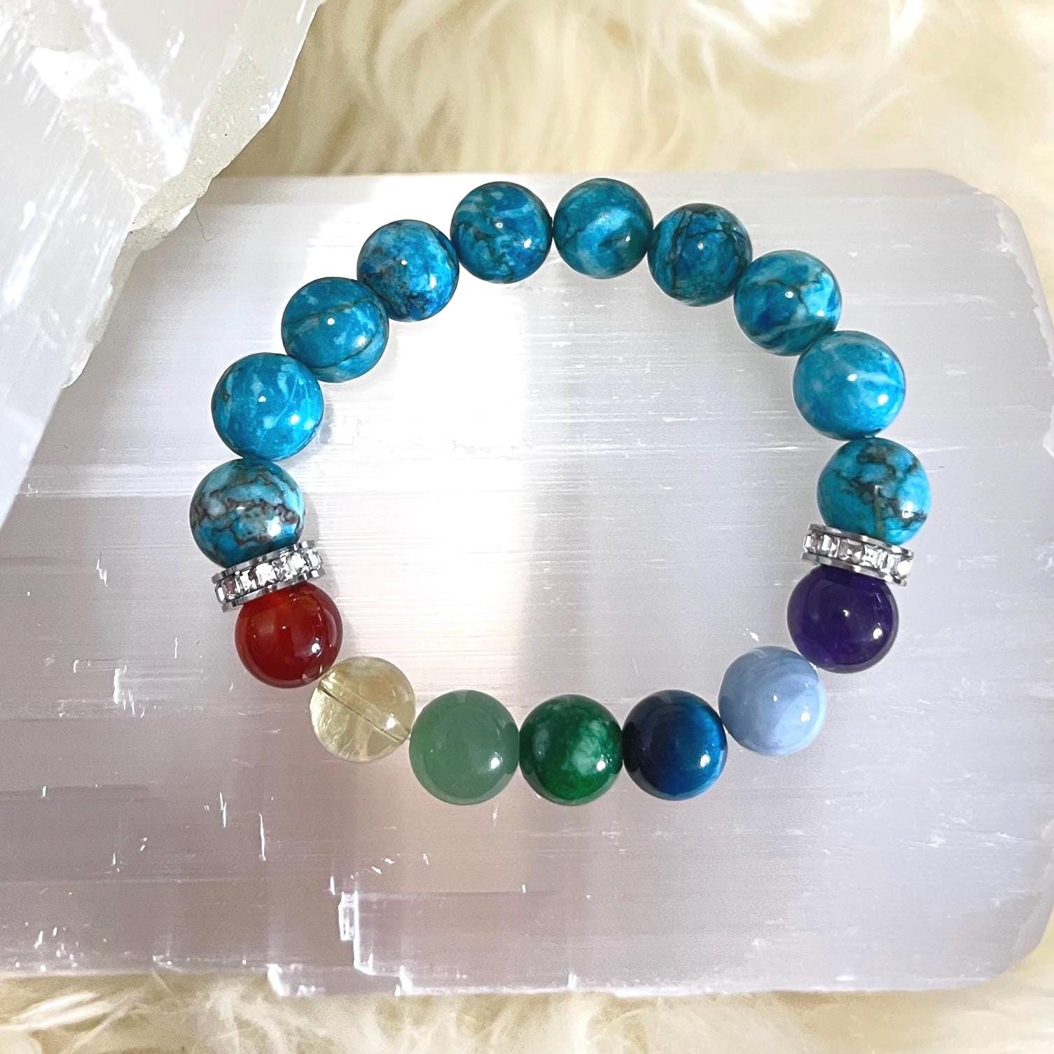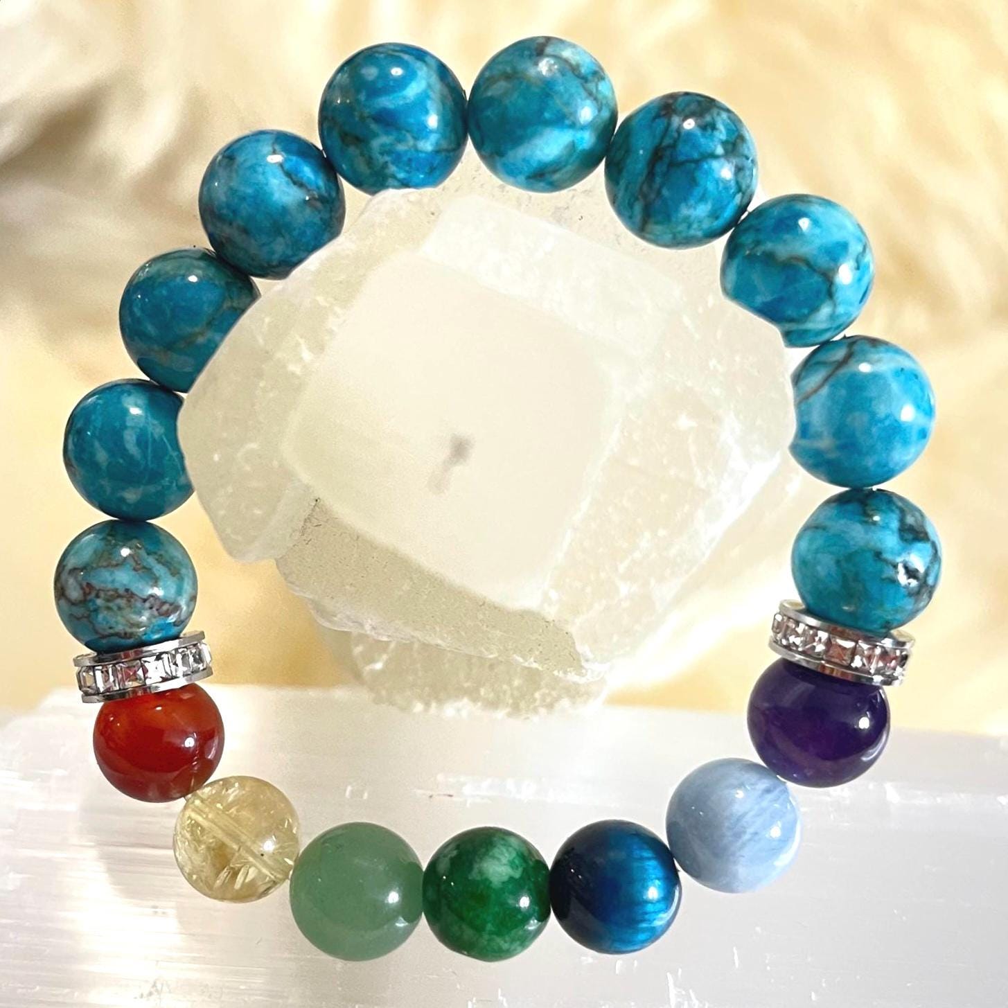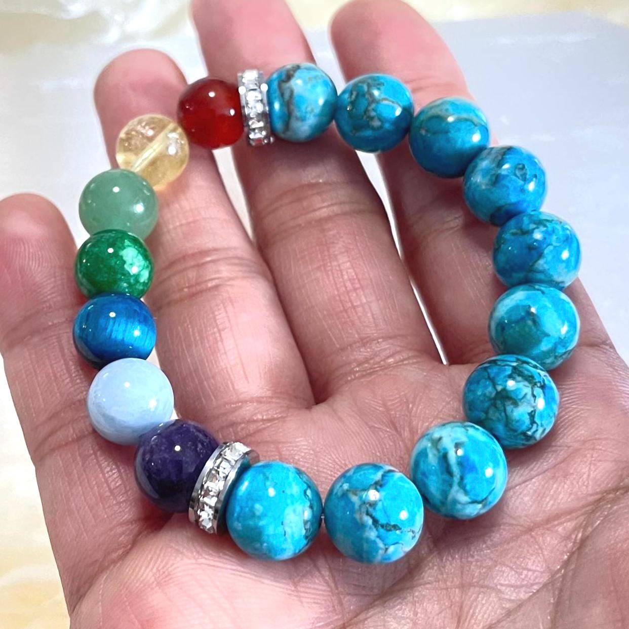 This design blends the calm, protective feel of Turquoise with the full-spectrum energy of the 7 chakra stones—creating a bracelet that feels balanced, uplifting, and easy to wear. The bright turquoise beads keep the look cohesive and eye-catching, while the chakra stones add pops of color and intention. Rhinestone spacers add just the right amount of sparkle for a clean, elevated finish.