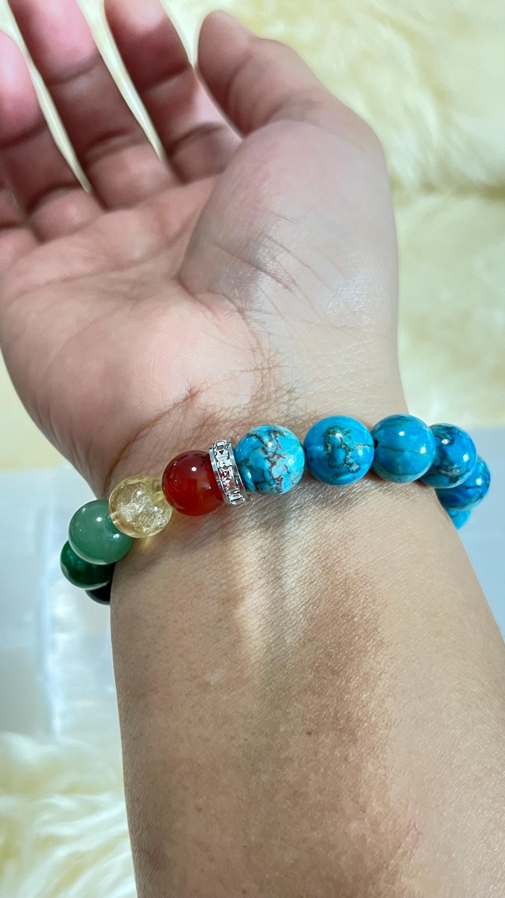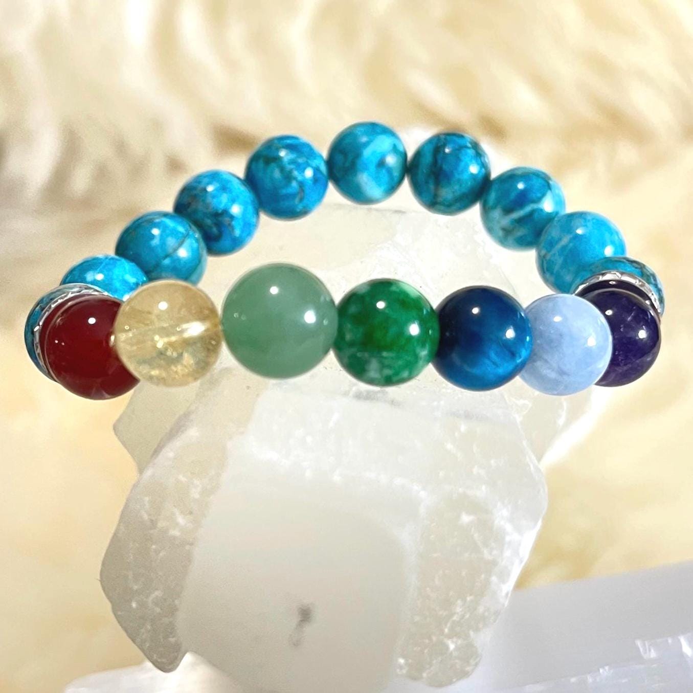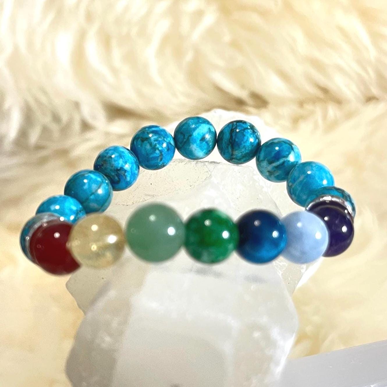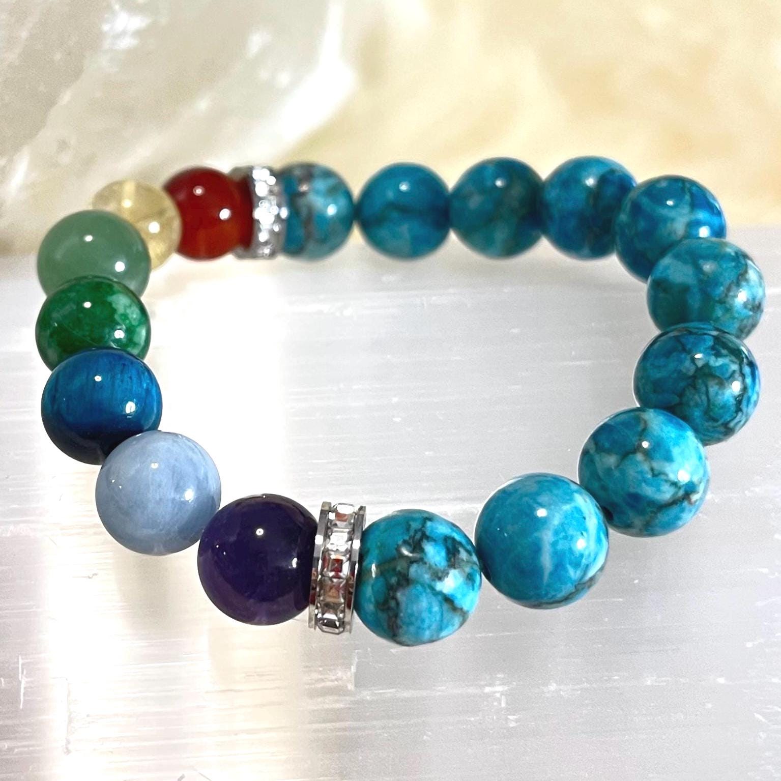 This design blends the calm, protective feel of Turquoise with the full-spectrum energy of the 7 chakra stones—creating a bracelet that feels balanced, uplifting, and easy to wear. The bright turquoise beads keep the look cohesive and eye-catching, while the chakra stones add pops of color and intention. Rhinestone spacers add just the right amount of sparkle for a clean, elevated finish.
