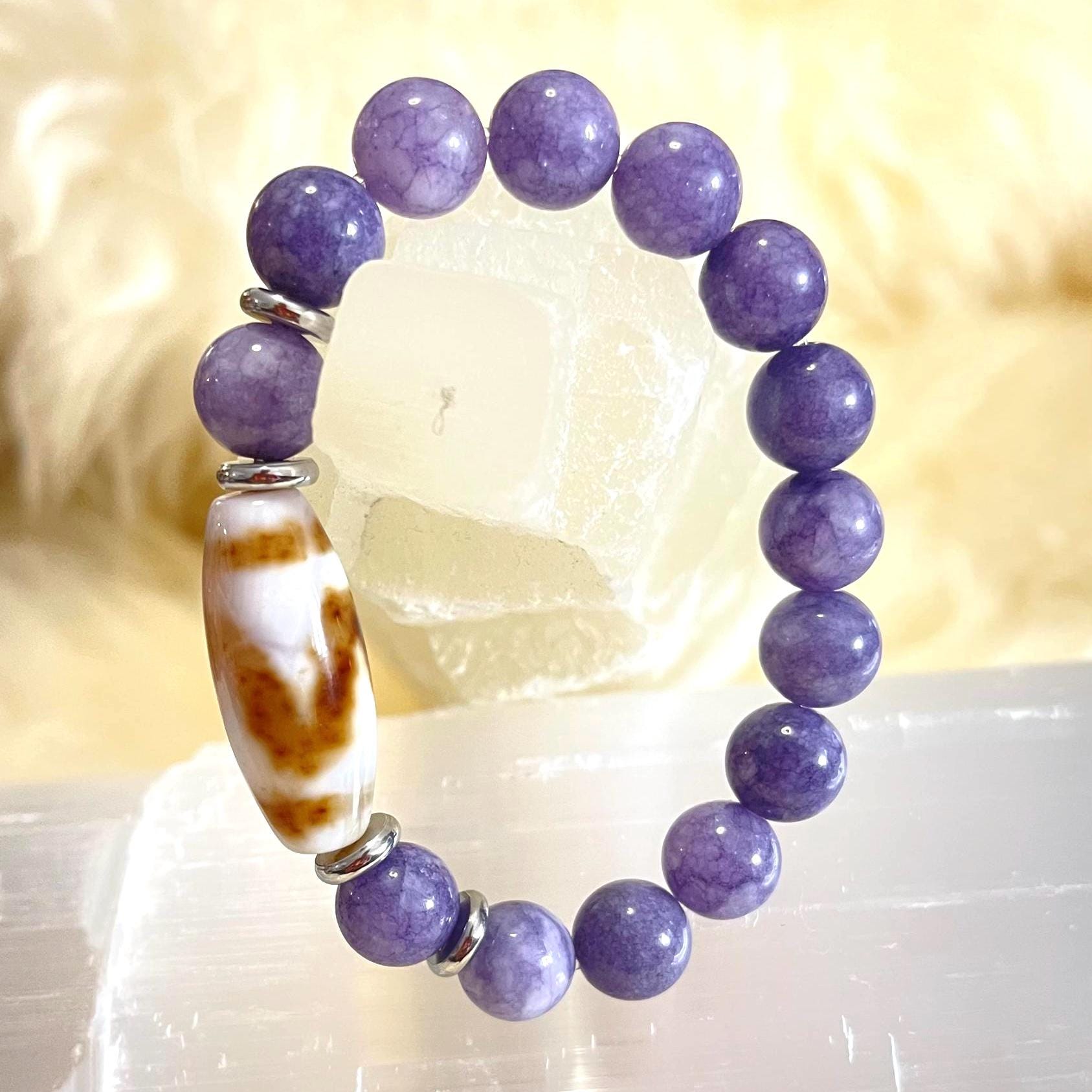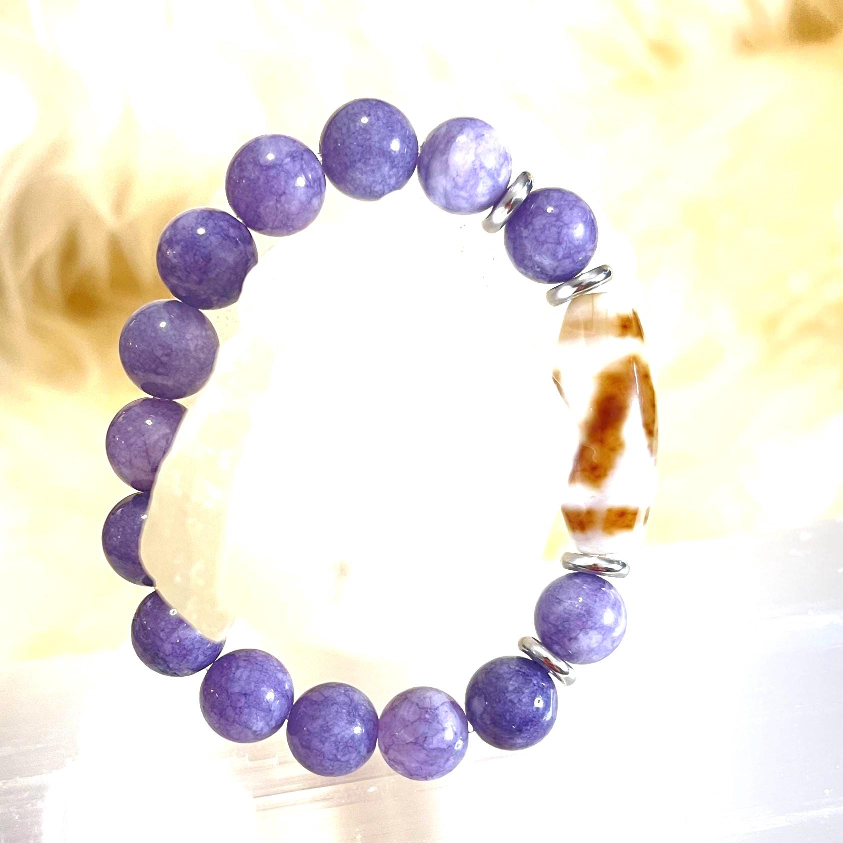 Paired with it is 10mm Purple Angelite, chosen for its soft lavender tones and calm, elevated presence. Purple Angelite adds a gentle, modern contrast to the strength of Dzi agate—balancing bold pattern with soothing color. The 10mm bead size creates a confident, premium look that works beautifully for both men and women. It’s substantial enough to be noticed, while still versatile for everyday wear.