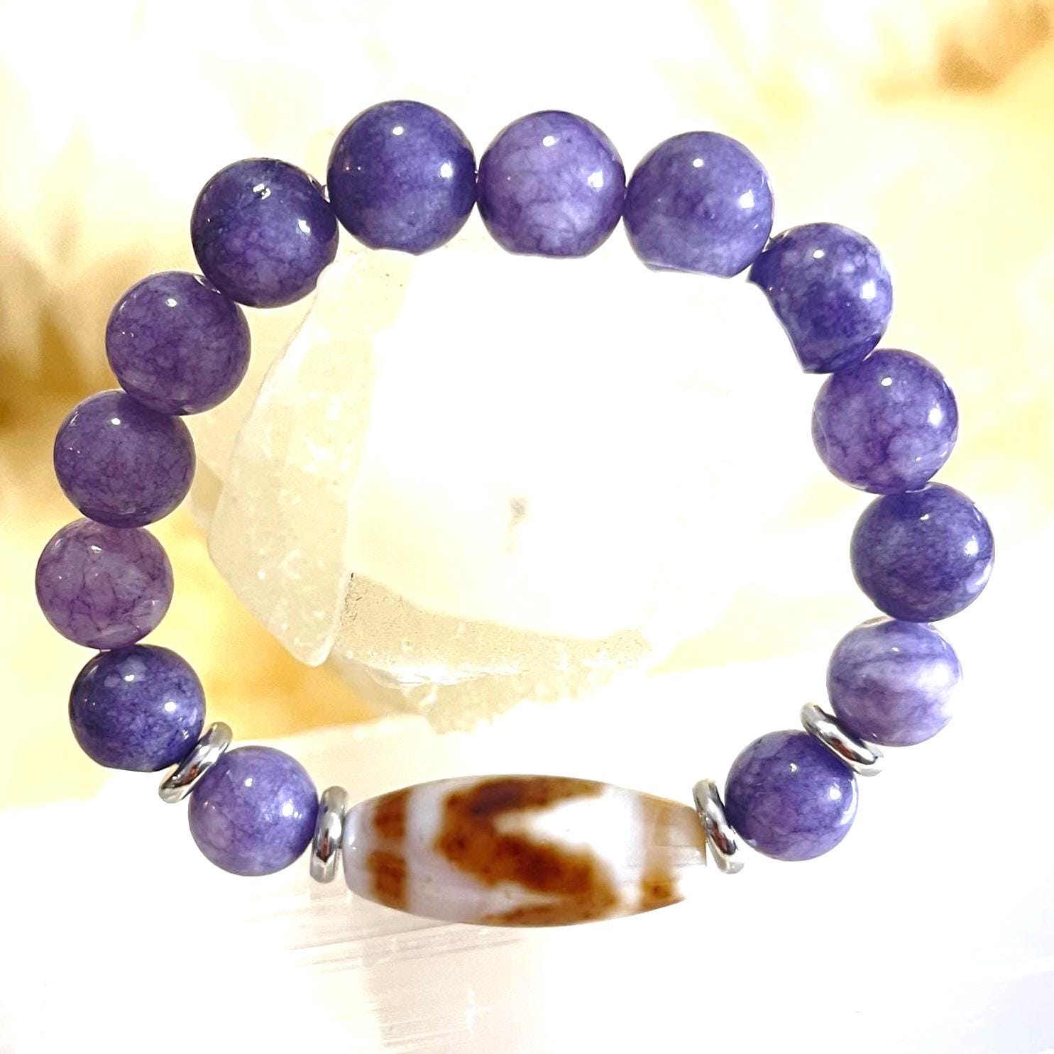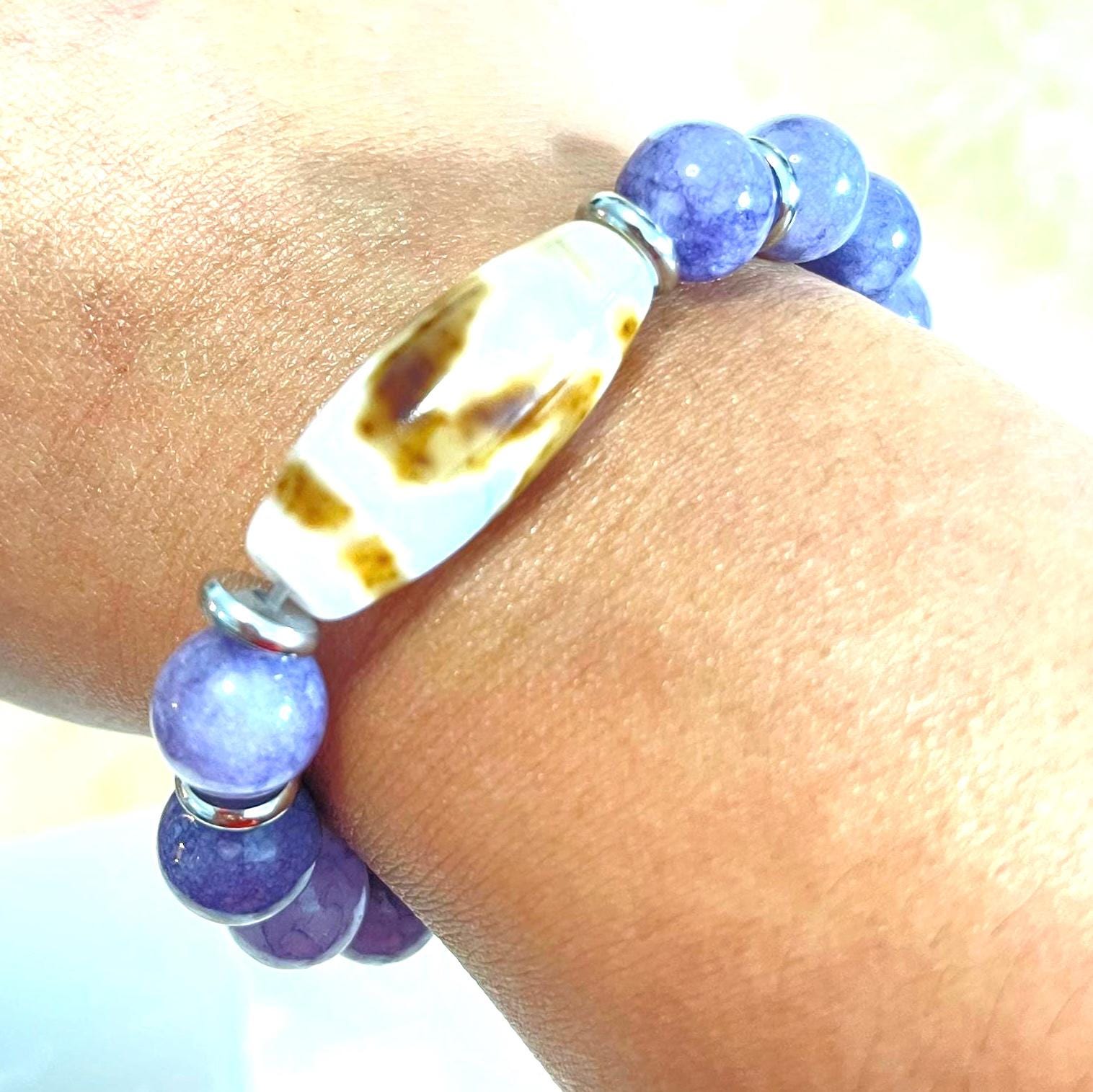 Meet your new everyday statement piece: a Unisex Dzi Amulet Agate & 10mm Purple Angelite stretch bracelet designed for style, meaning, and comfort. Handcrafted with natural stones, finished with sleek stainless steel accents, and strung on a durable elastic cord, this bracelet is easy to slip on, effortless to wear, and made to stand out—whether you keep it minimal or stack it with your favorites.