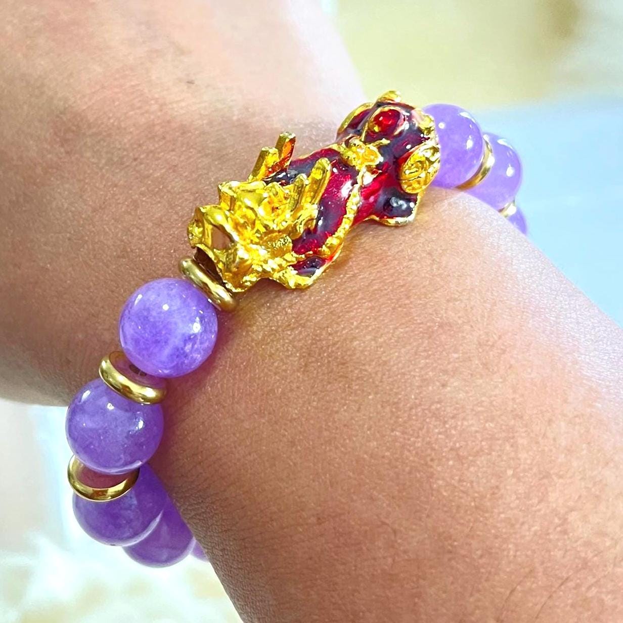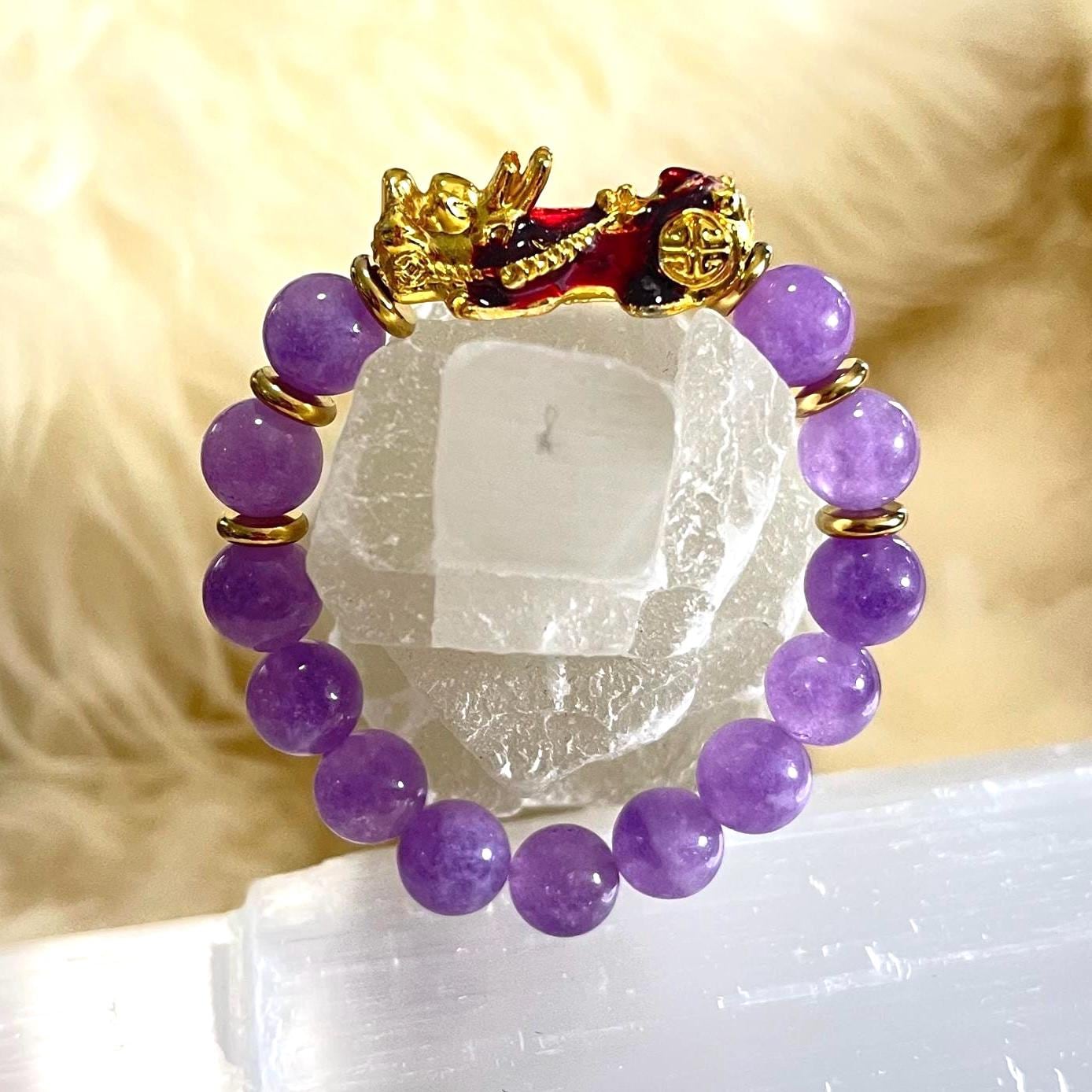 Bring calm, comfort, and protected prosperity into your daily life with our Purple Angelite Dragon Pixiu Bracelet—a rare, eye-catching piece of feng shui wealth jewelry designed to attract money luck while surrounding you with soothing, peaceful energy. With its dreamy lavender tone, Purple Angelite is loved for its gentle presence and its association with serenity, emotional balance, and spiritual support. This bracelet is made for anyone who wants to feel grounded and protected while staying soft, centered, and open to new opportunities.