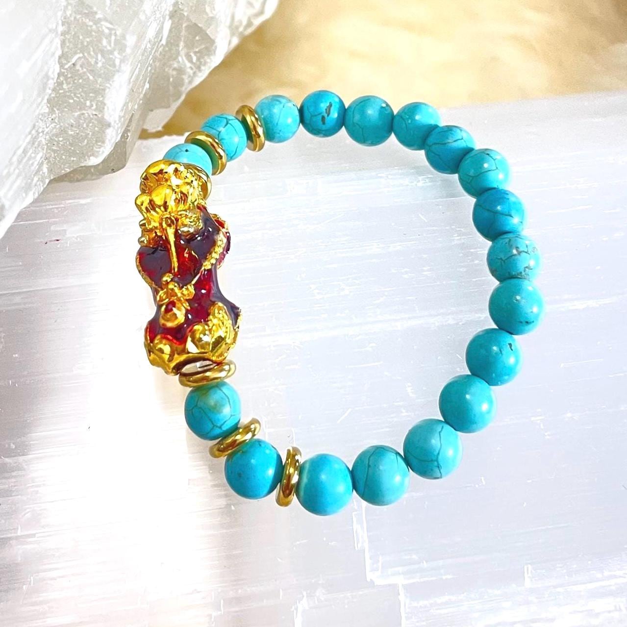 Turquoise bracelet 8mm, turquoise beaded bracelet, Pixiu bracelet, Dragon Pixiu bracelet, feng shui bracelet, wealth attraction bracelet, money luck bracelet, protection bracelet, prosperity jewelry, lucky turquoise bracelet, beaded gemstone bracelet, unisex crystal bracelet.