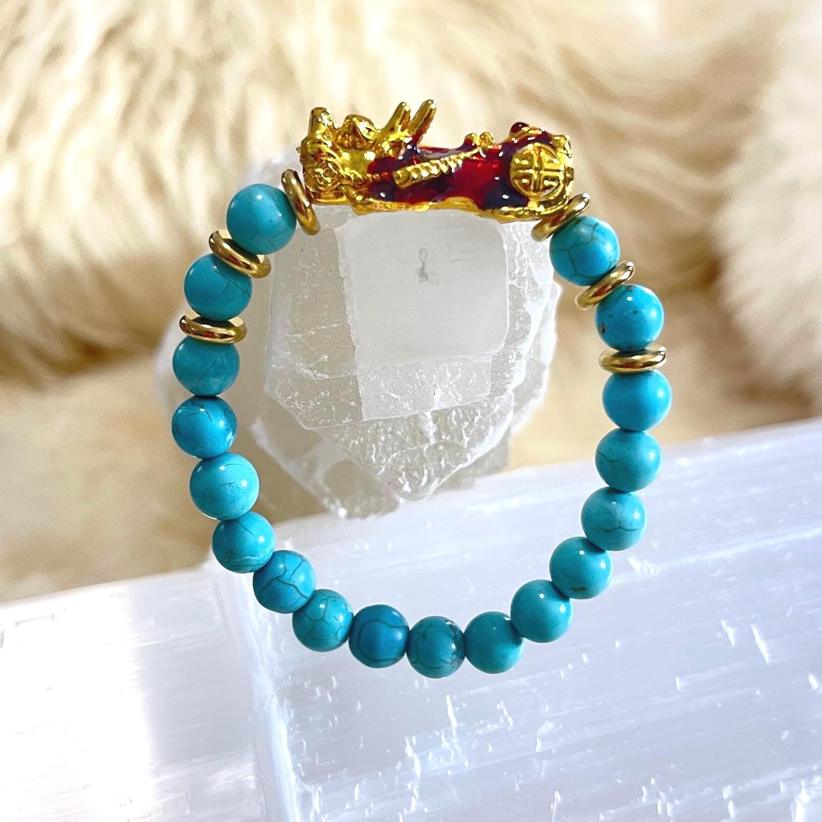 At the center of the bracelet is a detailed Dragon Pixiu (Pi Yao) charm—one of the most powerful symbols in feng shui for wealth attraction and protection. Pixiu is said to draw prosperity toward you, guard the fortune you build, and repel negative energy that can block opportunities. In its Dragon form, Pixiu represents power, authority, and victory, making it a favorite talisman for entrepreneurs, professionals, students, and anyone focused on financial growth. This pairing is what makes the bracelet special: Turquoise for protective calm and lucky flow, Pixiu for prosperity and forward momentum.