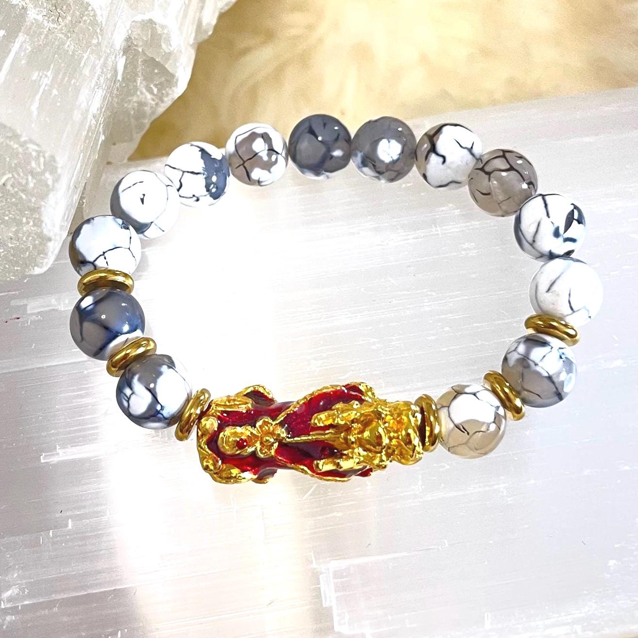 Black & White Fire Agate Pixiu Feng Shui Bracelet 10mm – Protection, Focus & Wealth Attraction