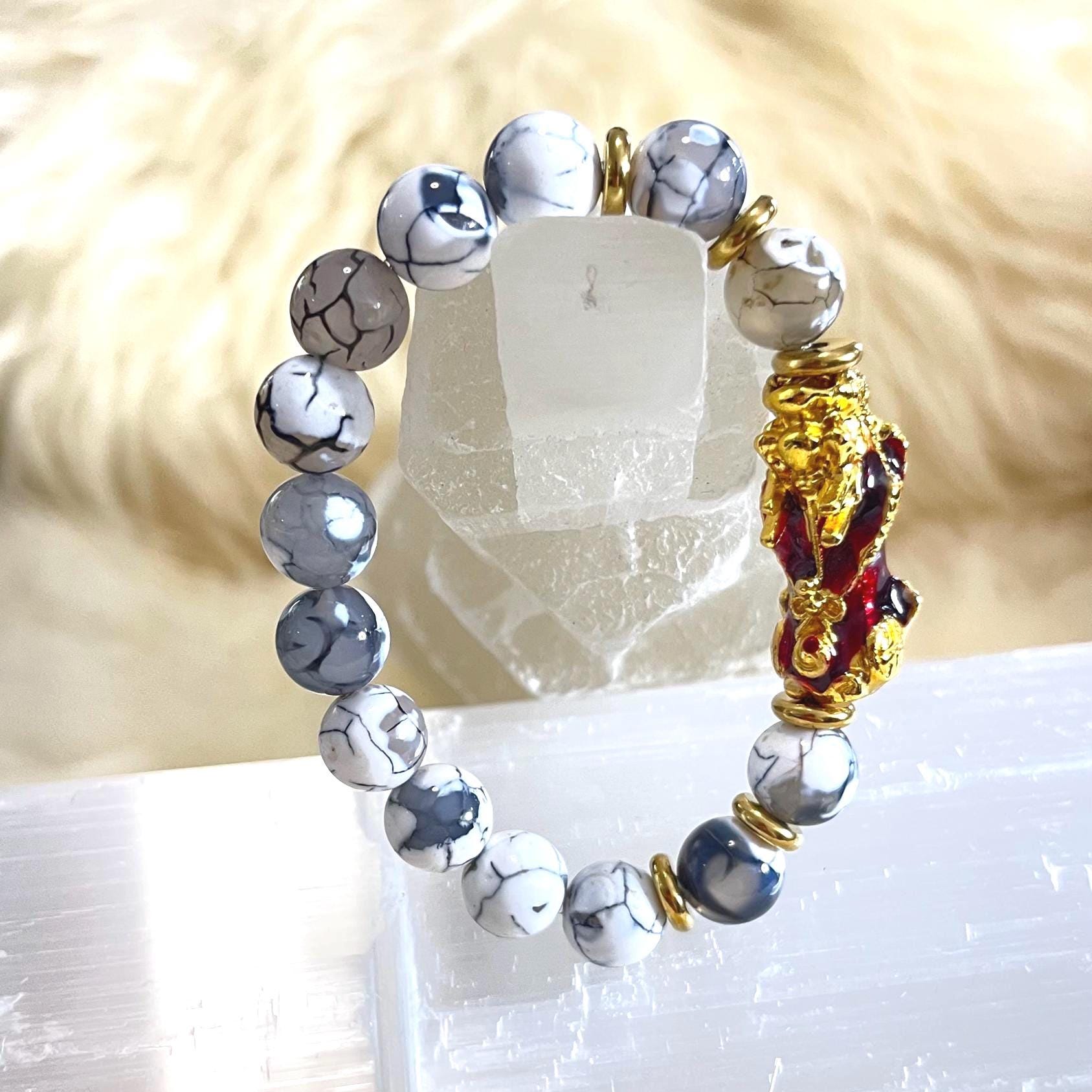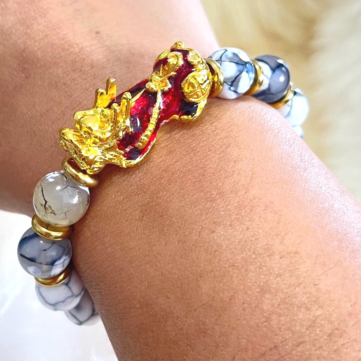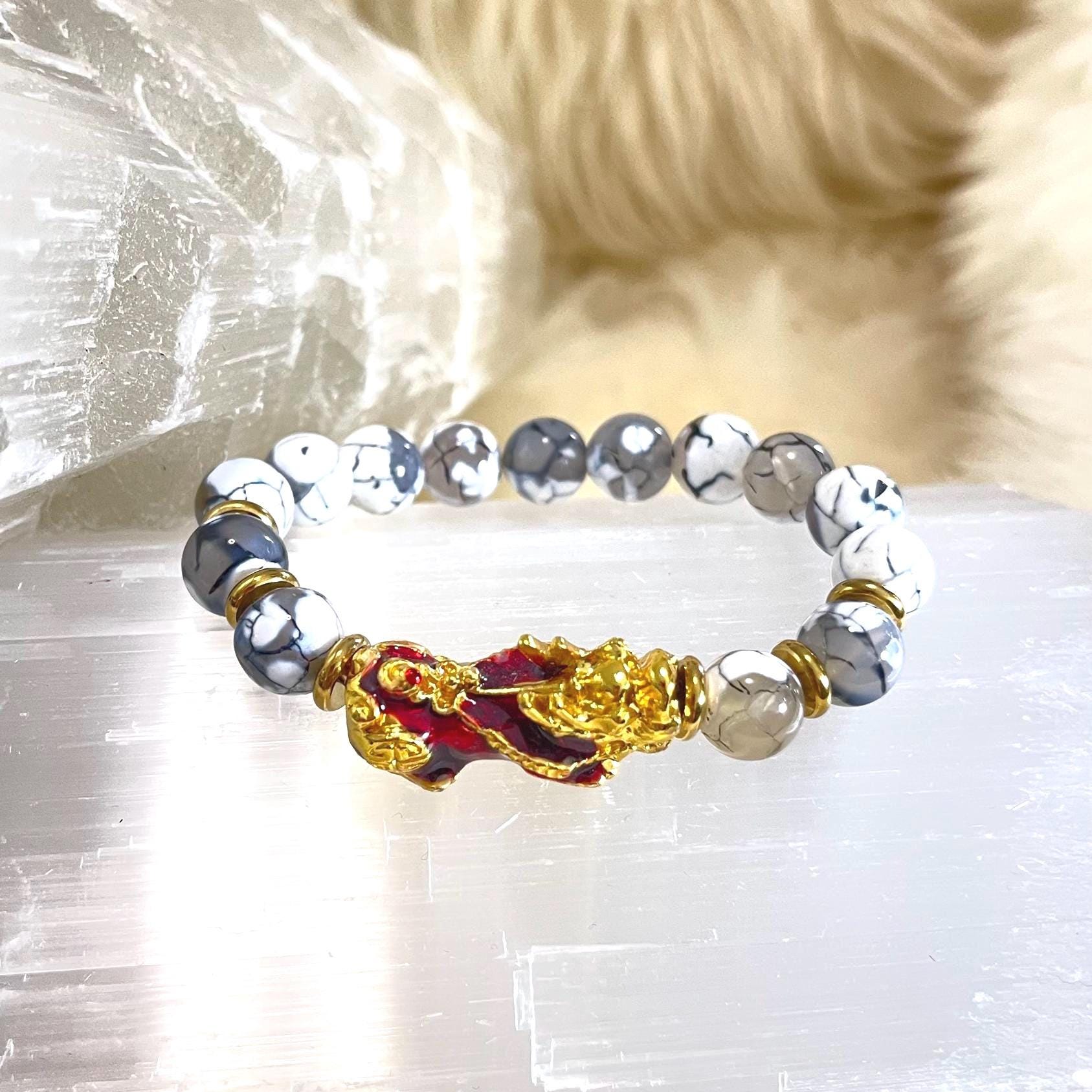 Step into bold protection and steady prosperity with our Black & White Fire Agate Pixiu Feng Shui Bracelet (10mm)—a striking statement piece designed to attract money luck while keeping your energy grounded, focused, and protected. Made with premium 10mm Black and White Fire Agate beads, finished with a gold-plated Pixiu (Pi Yao) centerpiece and gold-filled ring accents, and strung on a high-quality elastic cord, this bracelet blends powerful contrast and modern style with traditional feng shui meaning. The larger 10mm bead size gives a strong, luxe presence on the wrist—perfect for daily wear, business intentions, and manifestation.