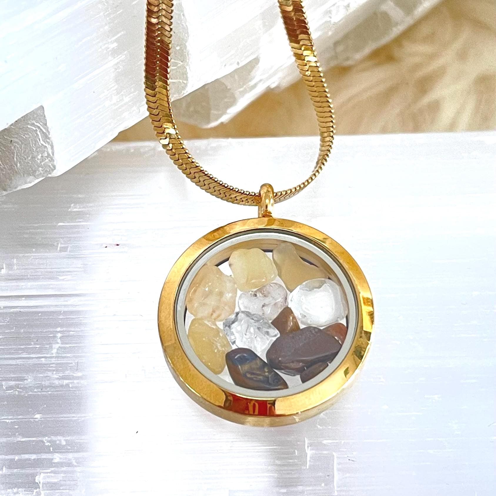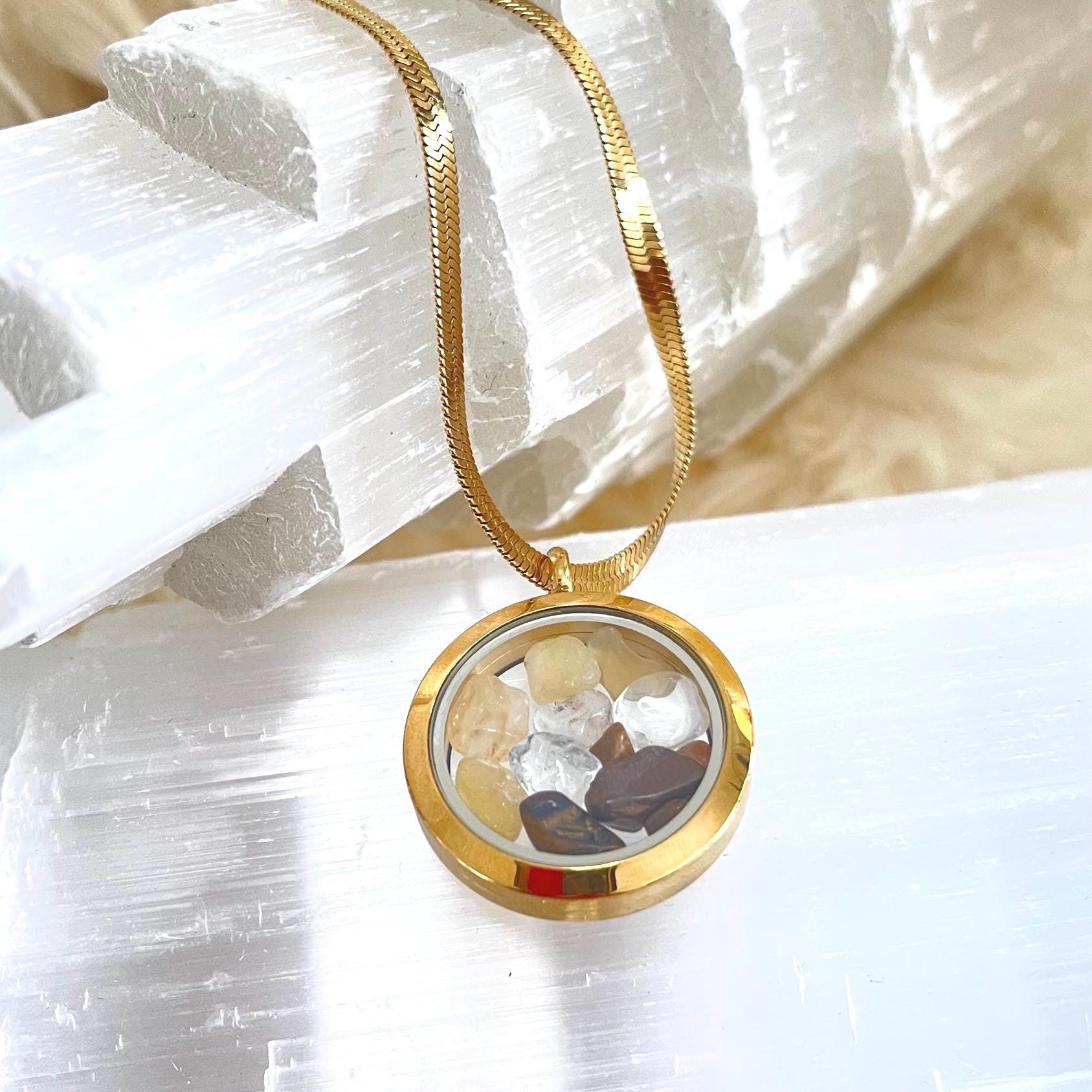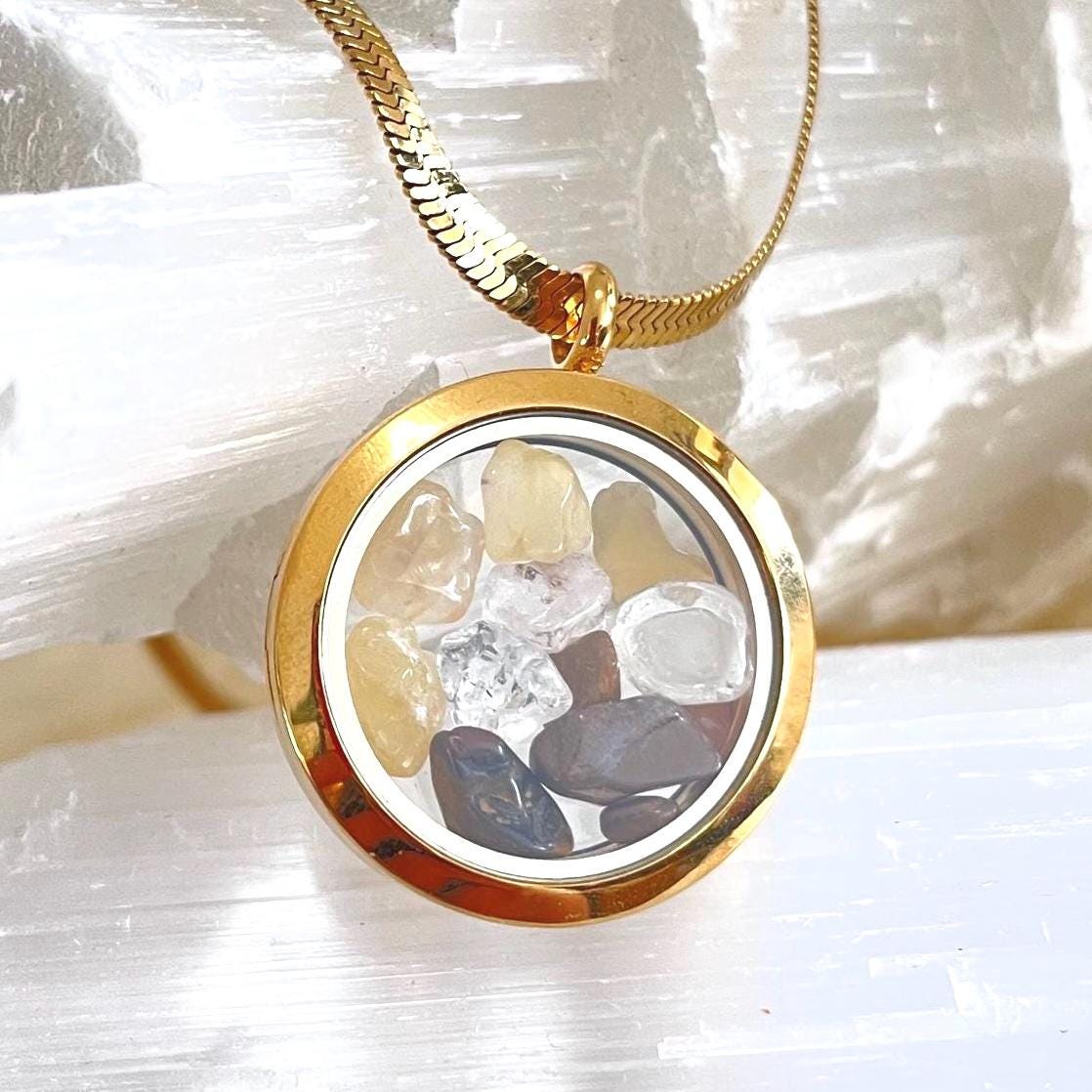 Gracefully designed to embody both timeless luxury and spiritual intention, this 30mm Gold Filled Floating Gemstone Necklace is a sophisticated statement of inner balance, clarity, and refined beauty. Encased within a crystal-clear glass pendant, a harmonious blend of natural Clear Quartz, Agate, and Tiger Eye crystal chips gently floats, creating an elegant visual depth that symbolizes energy in motion.